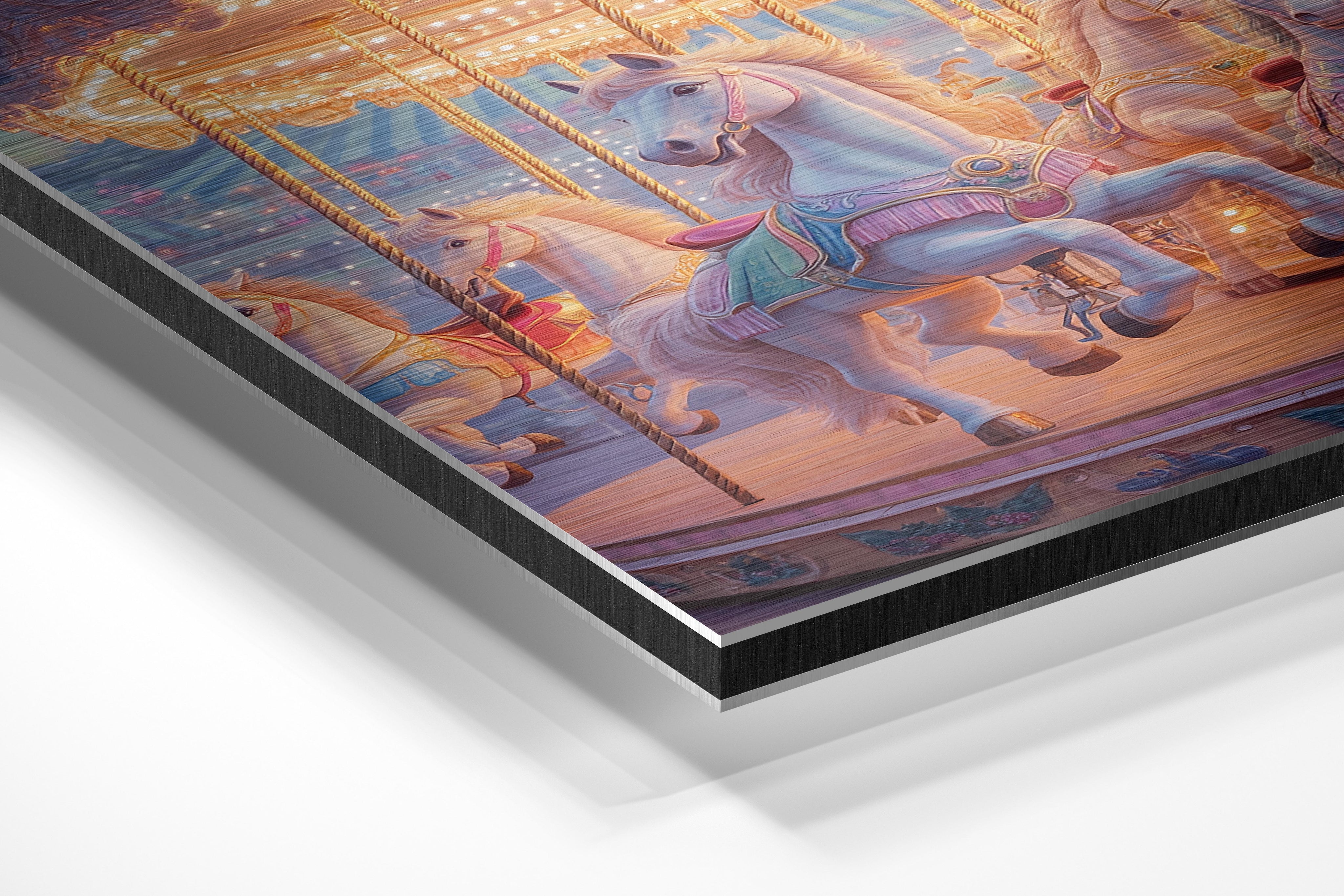 This mesmerizing image captures the timeless charm of a vintage carousel. Adorned with meticulously crafted white horses bearing pastel-colored saddles, the scene radiates an enchanting glow under golden lights. The intricate details and nostalgic aura transport viewers to a world of childhood wonder and carnival magic. This piece is perfect for spaces that celebrate joy and nostalgia, such as children’s playrooms, nurseries, or themed cafés. Its elegant yet playful composition makes it a versatile decor option for creating a warm and inviting atmosphere.