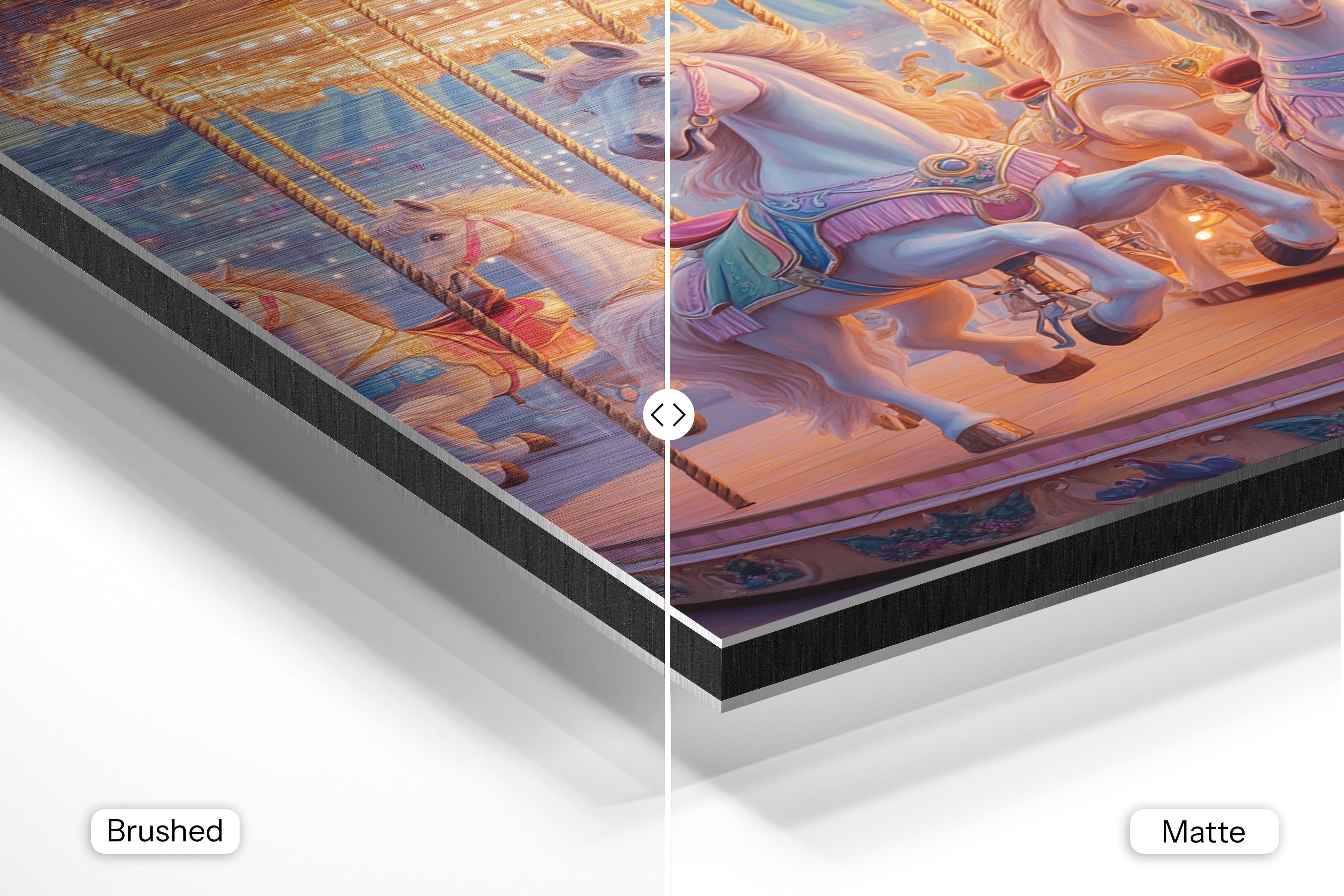 - Matte Aluminum offers a smooth, bright white surface that delivers crisp details and vibrant, true-to-life colors. With its non-reflective finish and subtle silky sheen, it’s perfect for photography, portraits, and colorful artwork—bringing a clean, polished look to any interior.