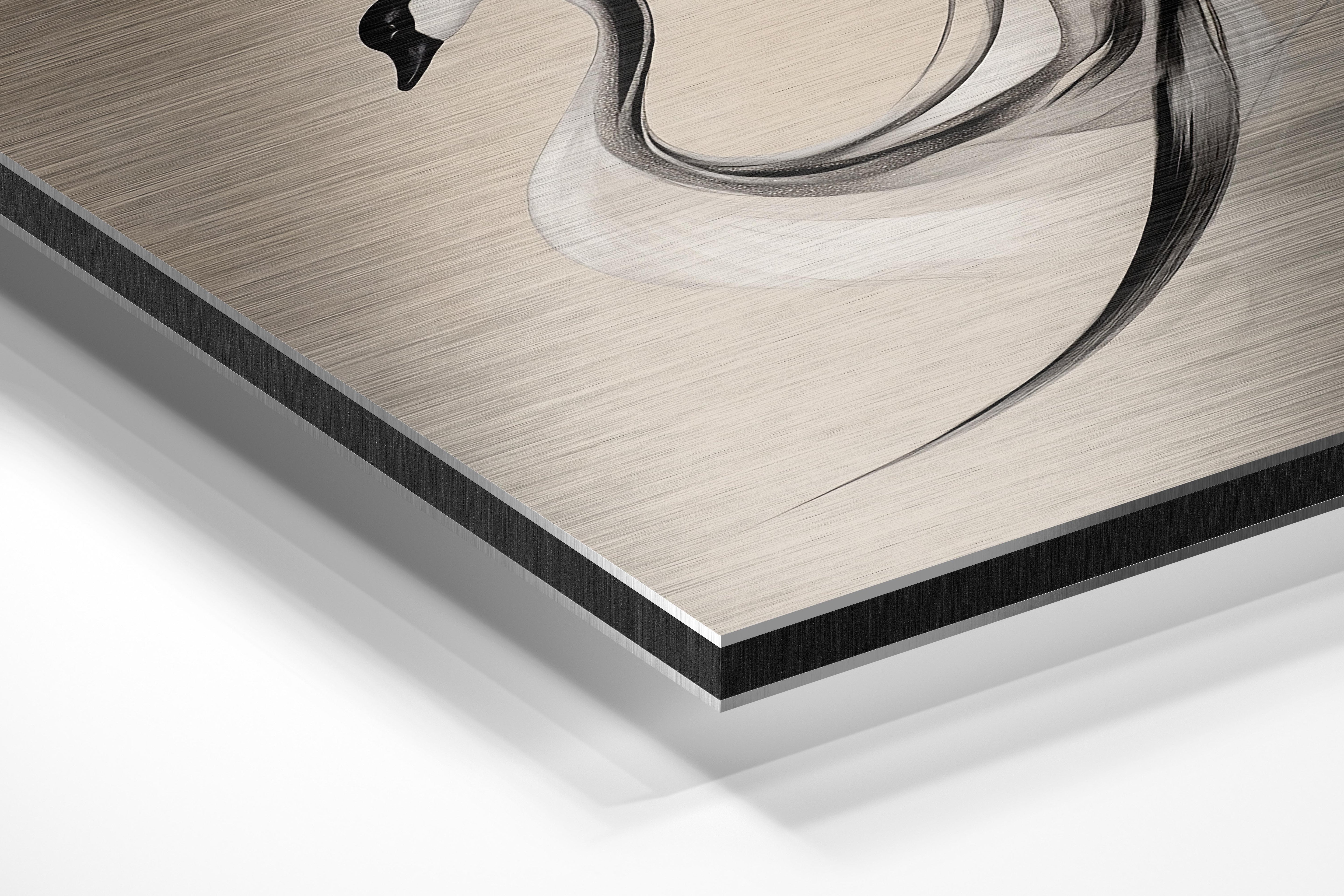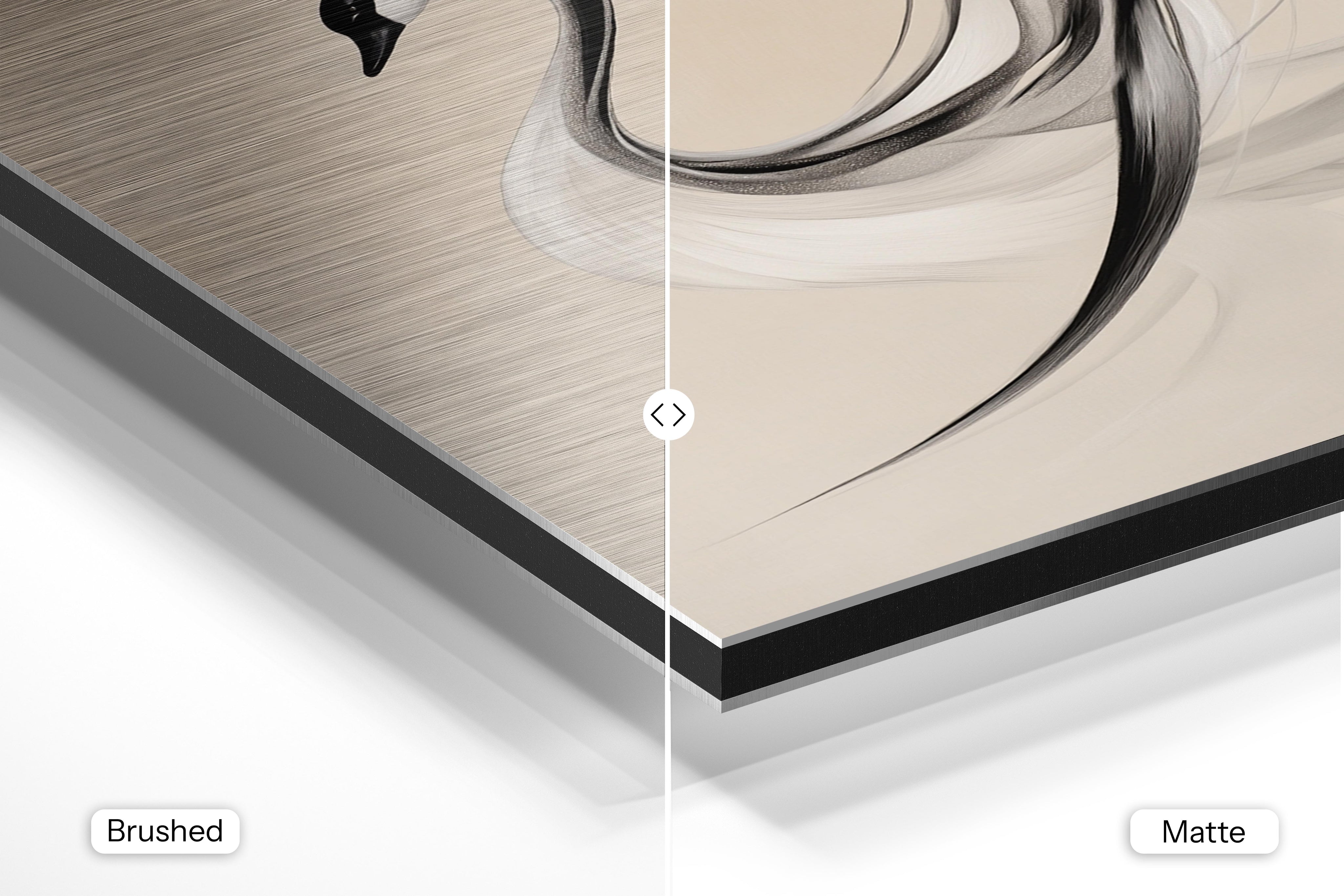 - Brushed Aluminum, on the other hand, features a raw metallic texture with visible brush strokes. Whites and highlights in your image let the silver surface show through, adding a dramatic, shimmering effect. Ideal for black-and-white images, minimalist designs, or abstract art, it creates a bold, industrial vibe with a modern edge.