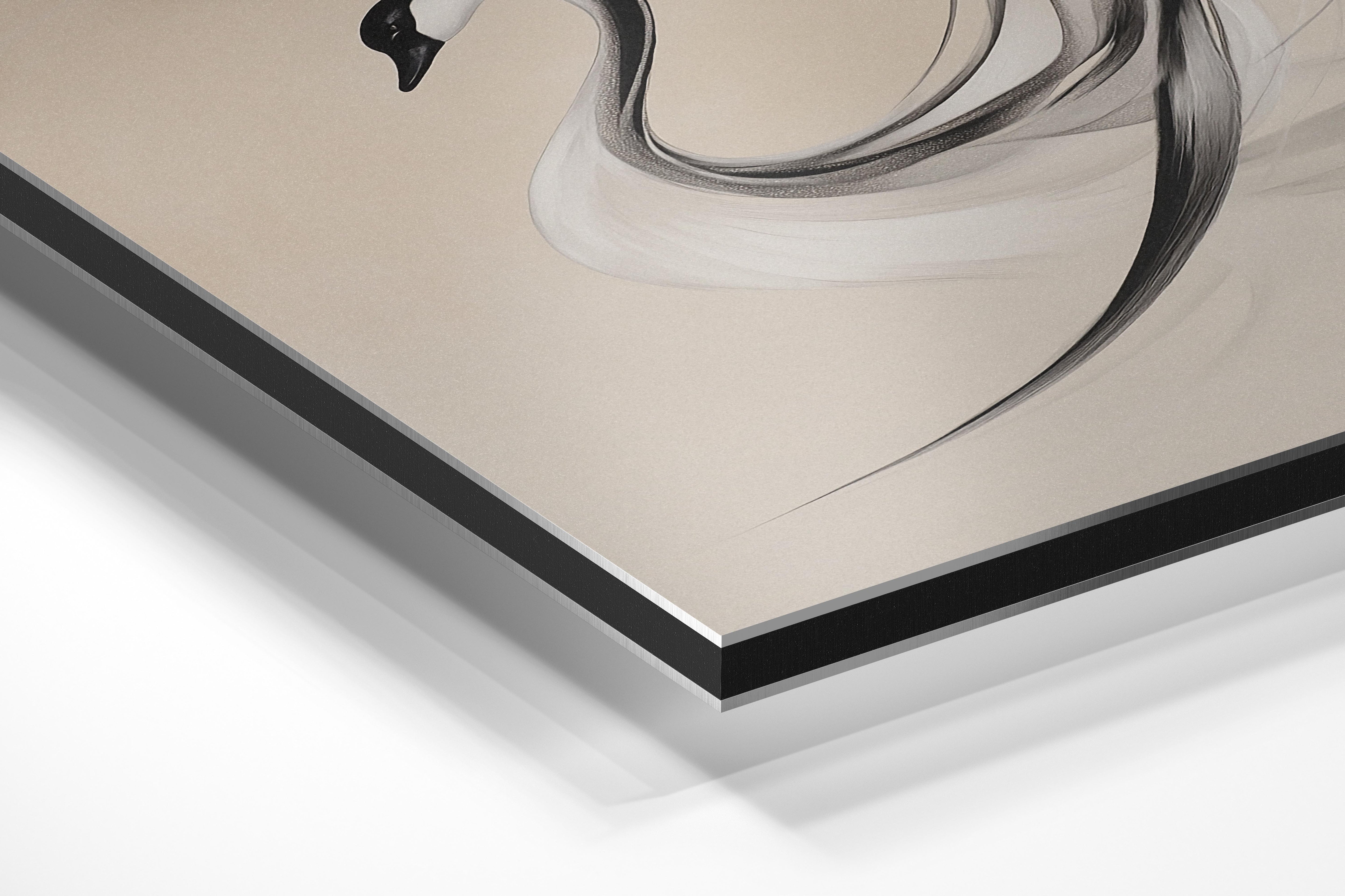 A stunning digital illustration of a swan depicted in an abstract, fluid style that gives the impression of movement and grace. The soft curves and wispy strokes create a sense of elegance, making this piece ideal for those who appreciate fine art with a modern twist. The neutral beige background complements the black and white tones, adding sophistication to any space. This artwork is perfect for serene settings like a bedroom, office, or living room, bringing a touch of tranquility and refinement.