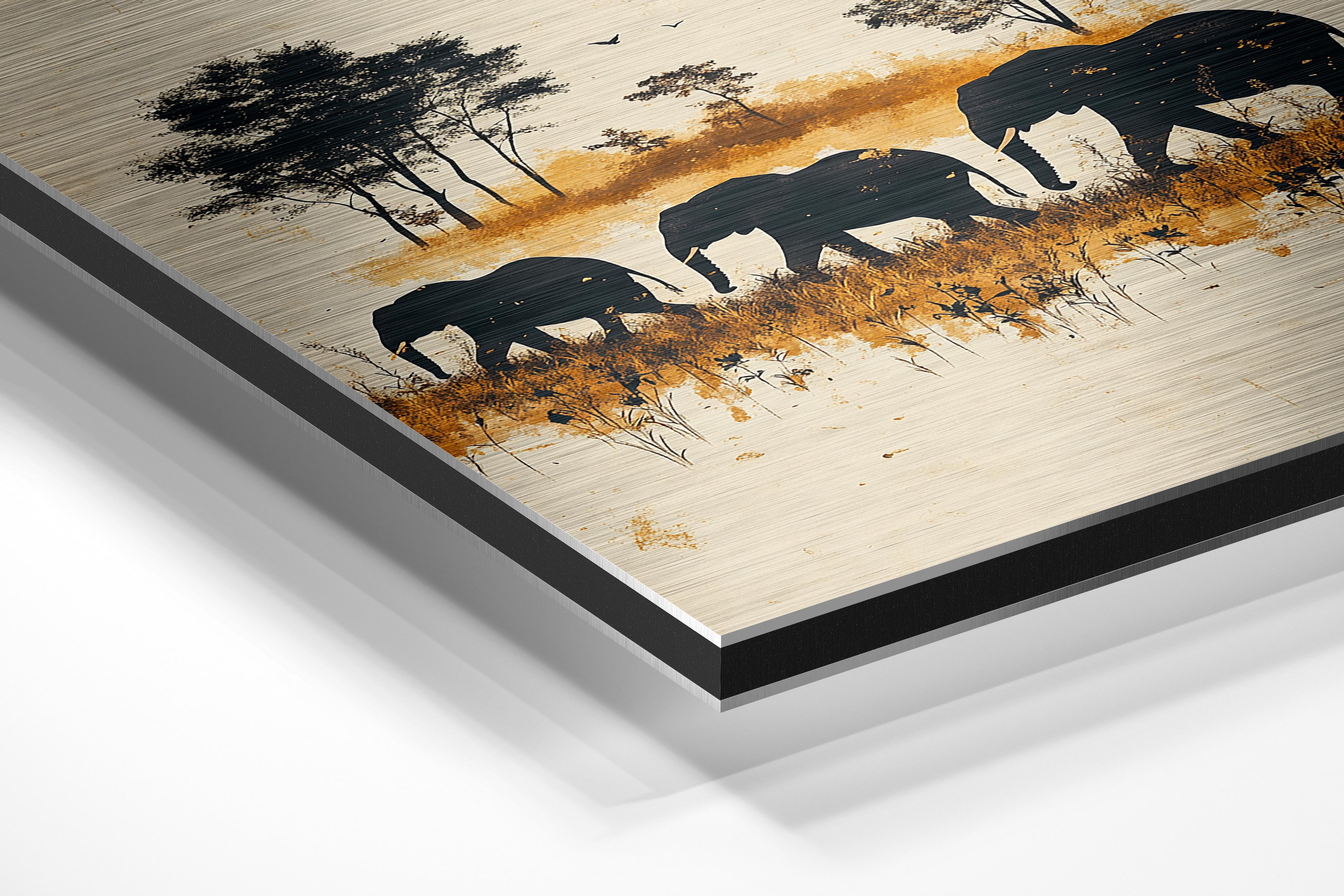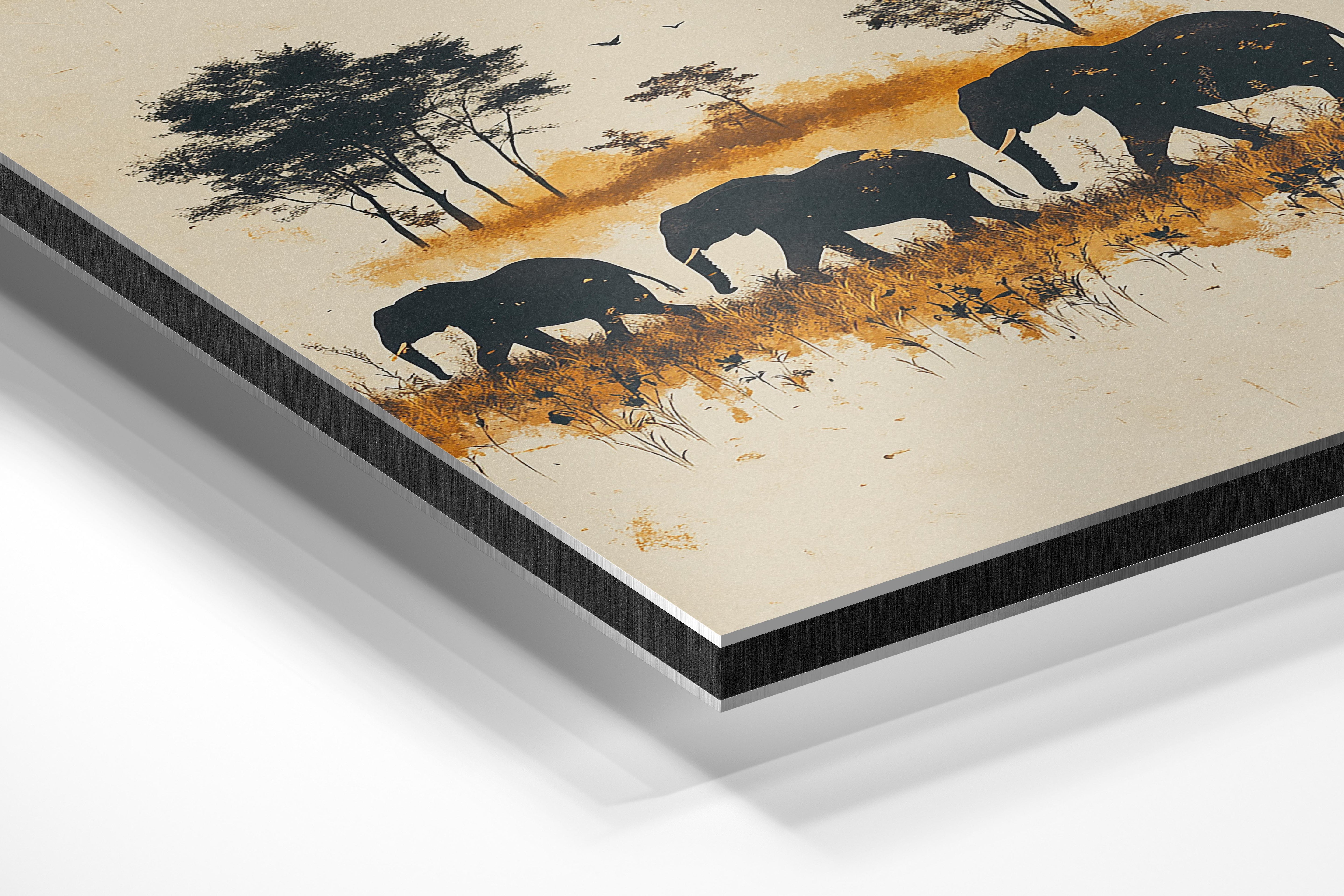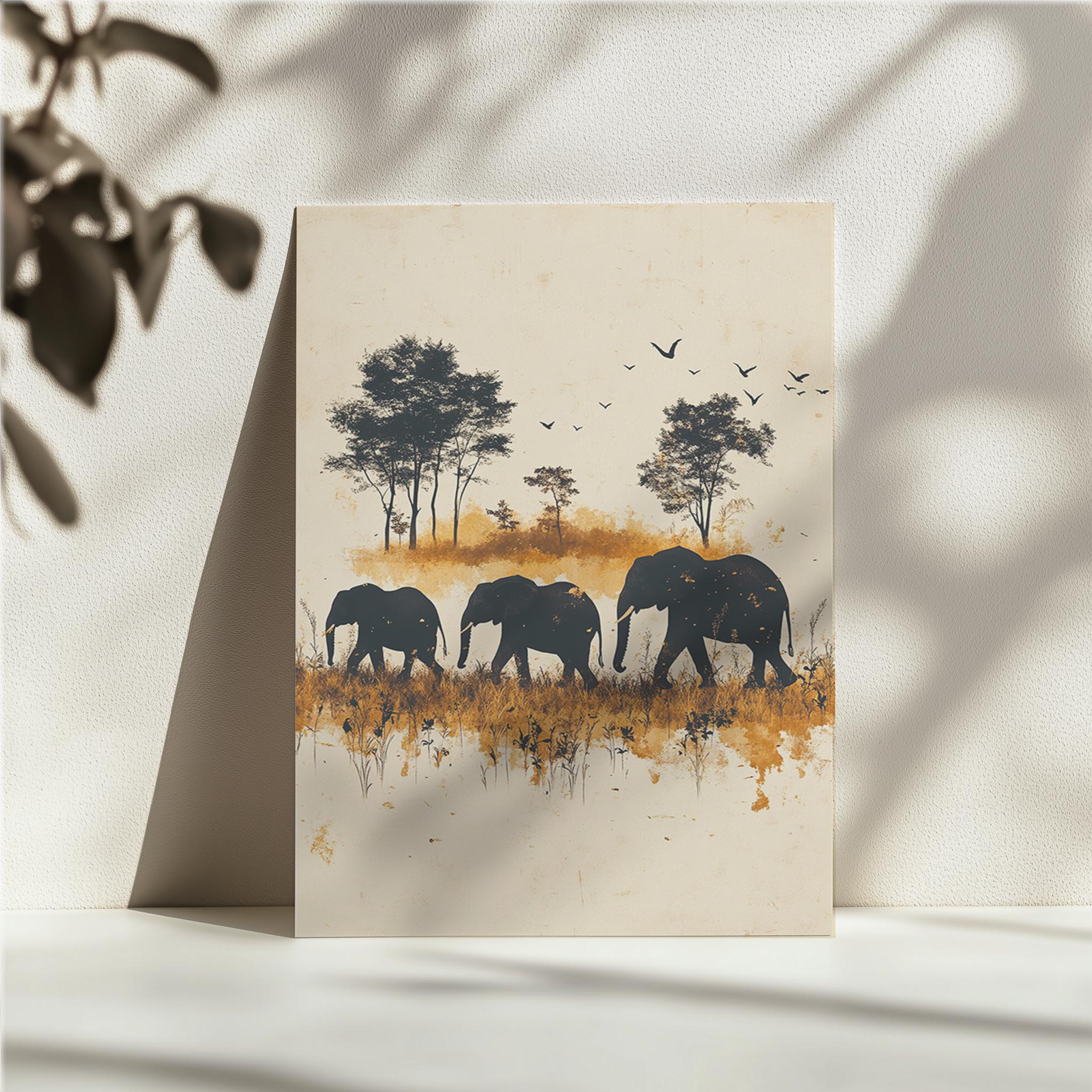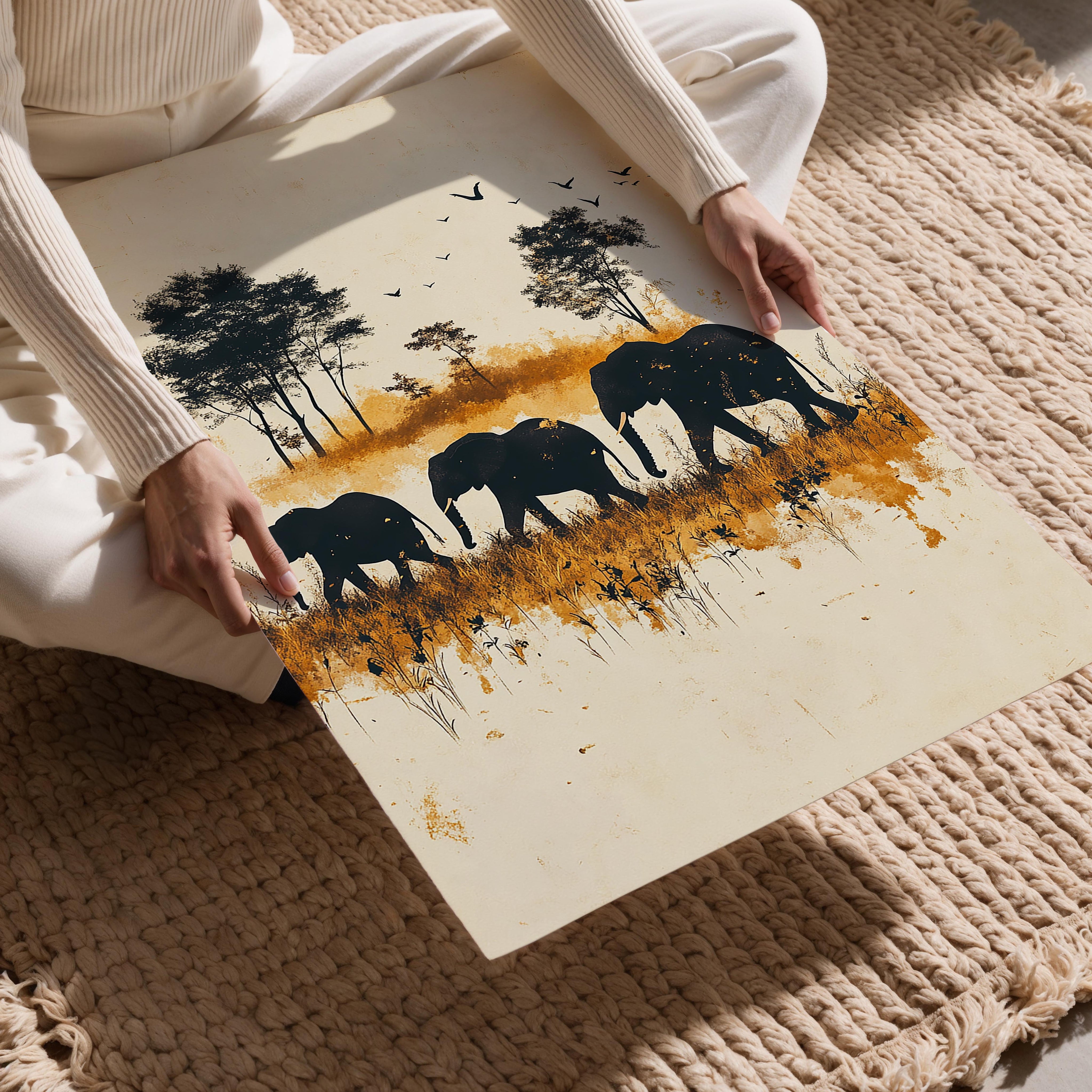 This stunning digital artwork captures the essence of an African safari with a striking silhouette of a family of elephants walking across the grasslands. The warm earthy tones blend beautifully with the stylized trees and a flock of birds soaring above, evoking a sense of adventure and tranquility. The piece has a timeless, vintage aesthetic that would make an excellent addition to a nature-lover’s space, whether in an office, living room, or entryway. The balanced composition and artistic splashes of golden hues give the scene a dreamlike quality, making it both bold and inviting.