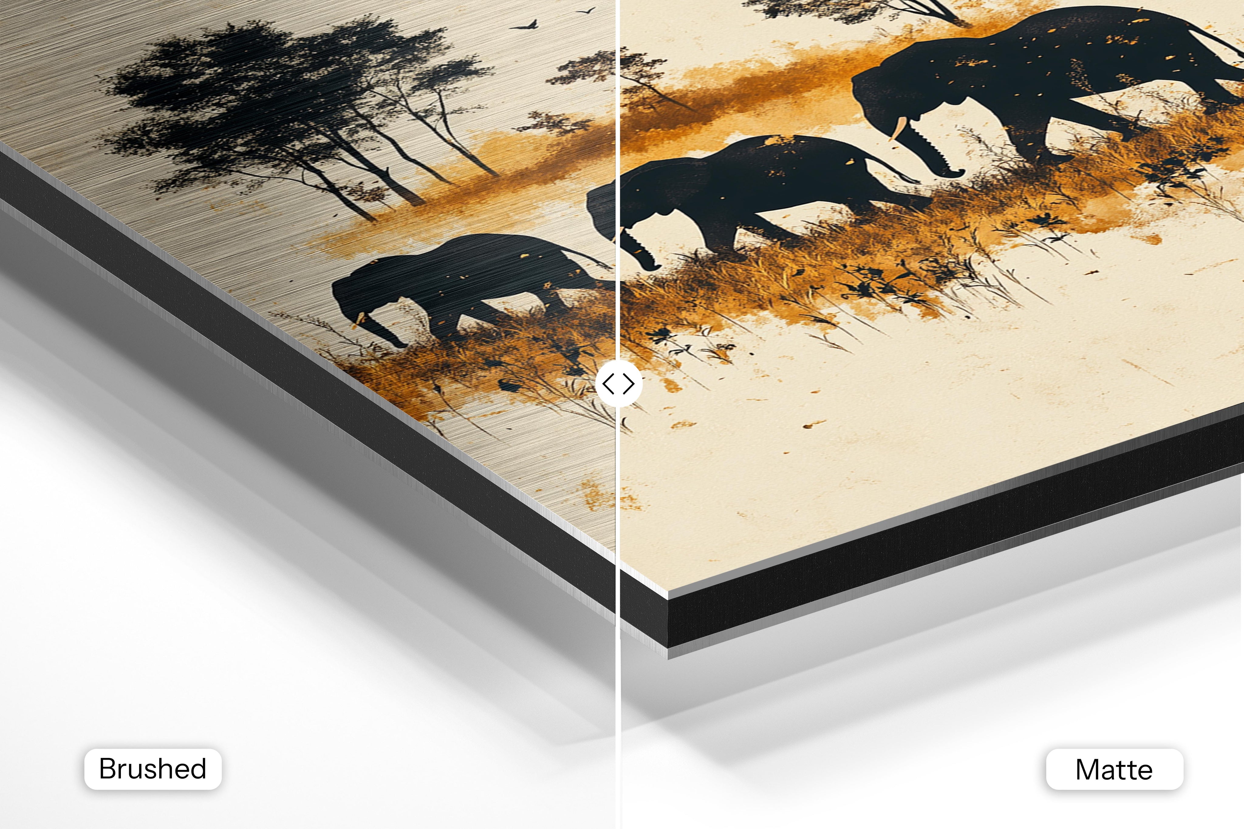 - Brushed Aluminum, on the other hand, features a raw metallic texture with visible brush strokes. Whites and highlights in your image let the silver surface show through, adding a dramatic, shimmering effect. Ideal for black-and-white images, minimalist designs, or abstract art, it creates a bold, industrial vibe with a modern edge.
