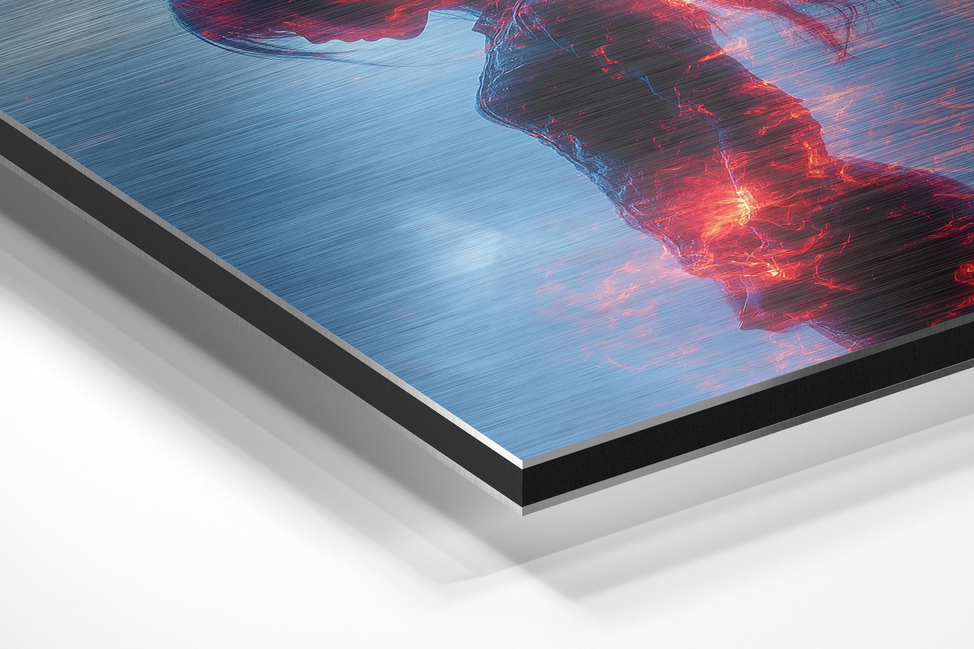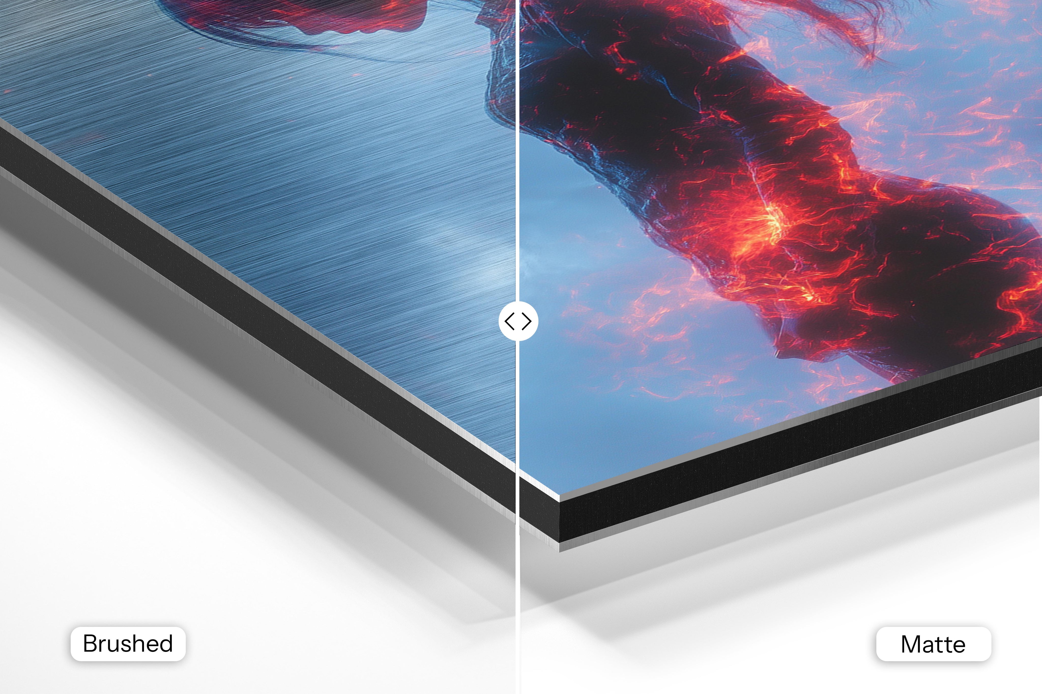 - Brushed Aluminum, on the other hand, features a raw metallic texture with visible brush strokes. Whites and highlights in your image let the silver surface show through, adding a dramatic, shimmering effect. Ideal for black-and-white images, minimalist designs, or abstract art, it creates a bold, industrial vibe with a modern edge.