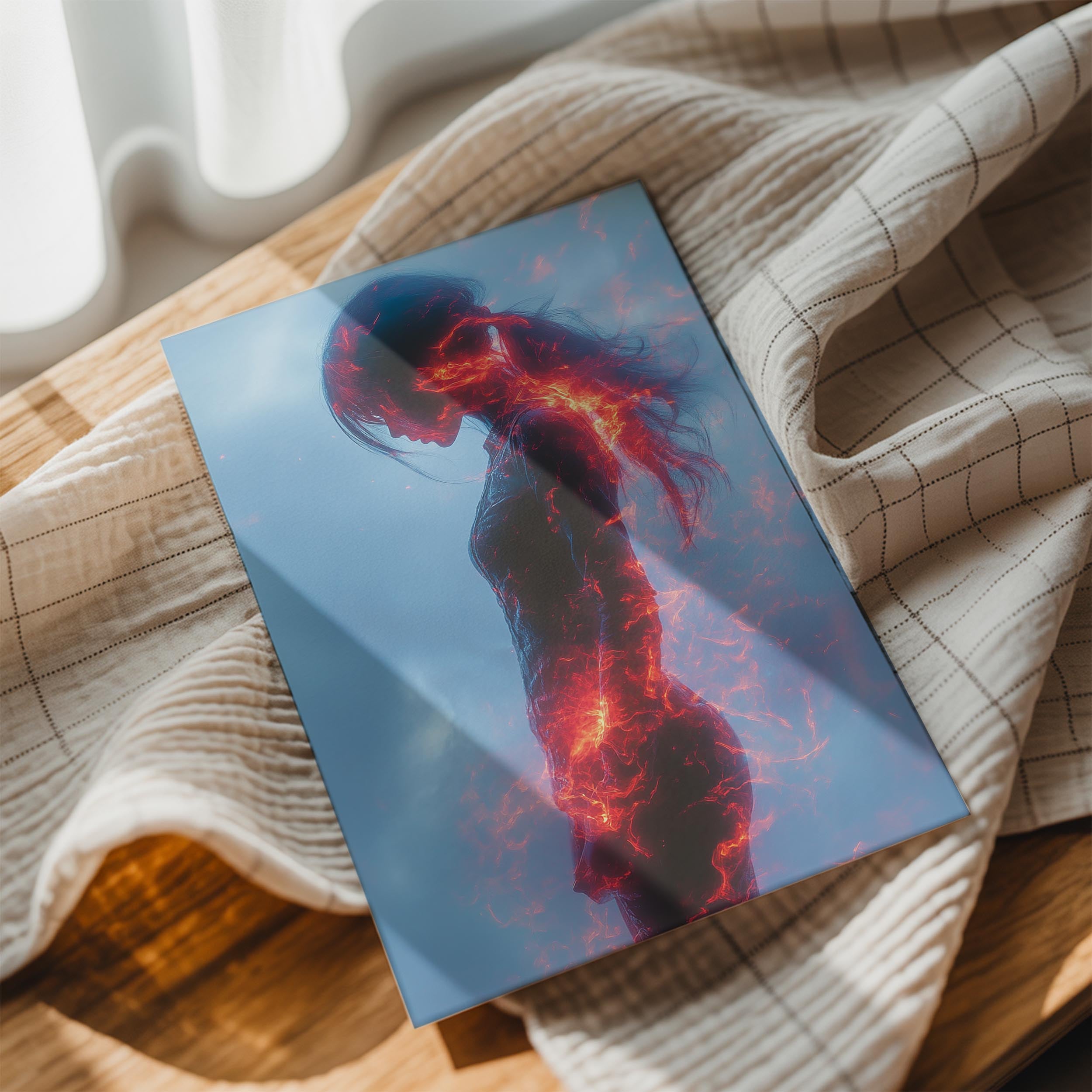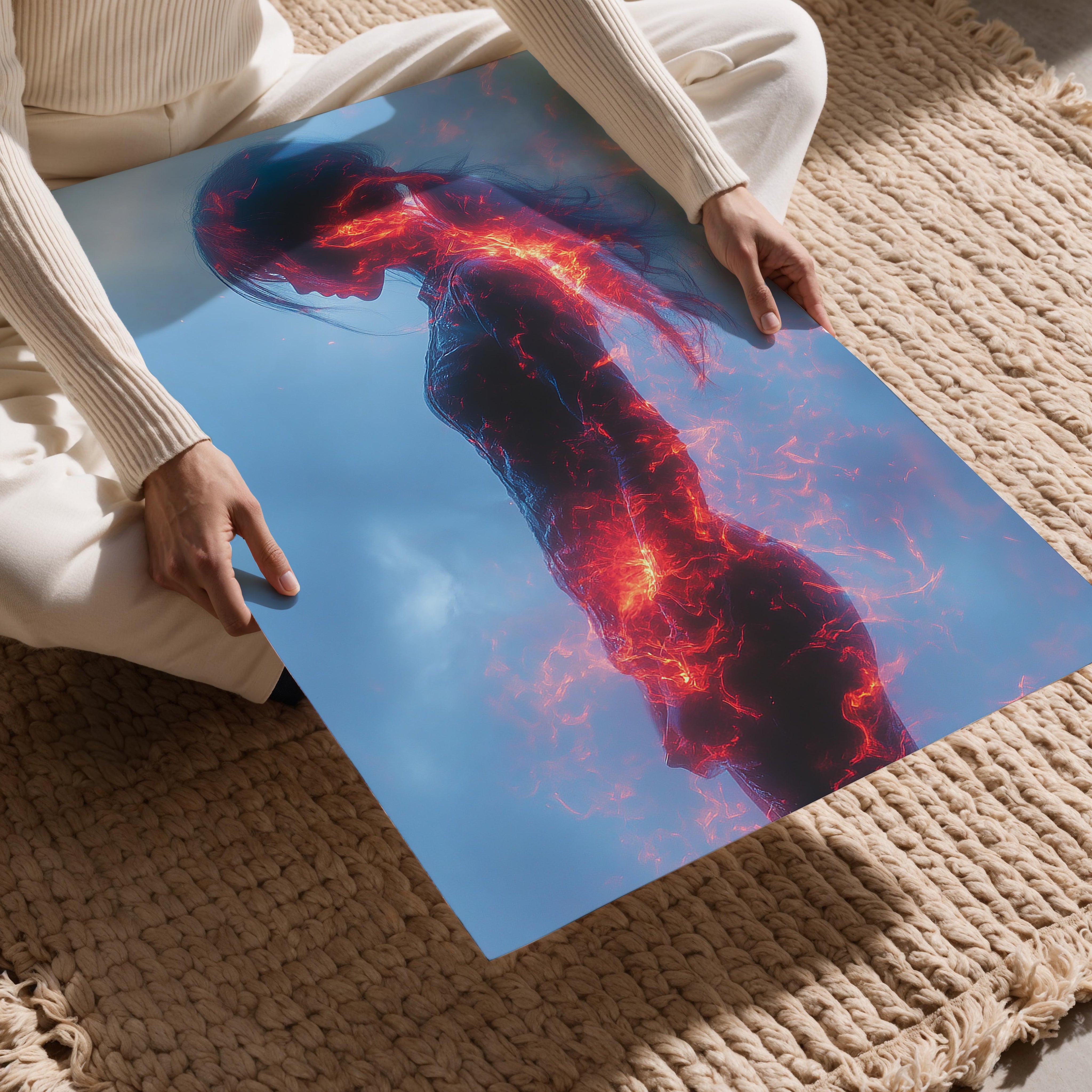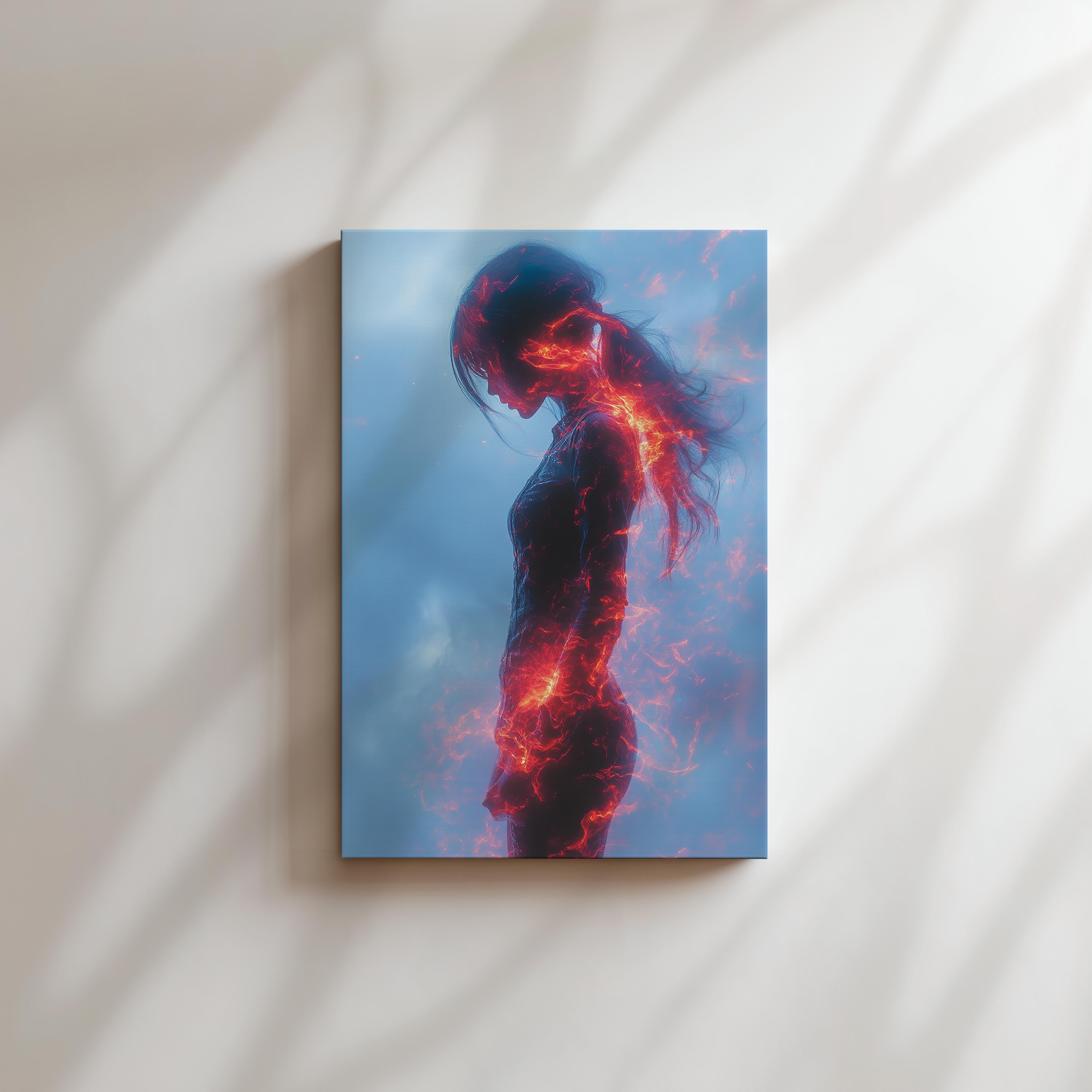 Depicting a figure enveloped in fiery embers with a subtle background of cool blues, this artwork captures raw passion and delicate strength. The sparks of light against the calm tones create a stunning contrast that draws the eye. This piece would make a powerful addition to modern interiors, particularly in creative spaces, offices, or living areas. It resonates with those seeking inspiration from resilience and transformation. Its emotive presence invites contemplation, making it an unforgettable centerpiece in any art collection.