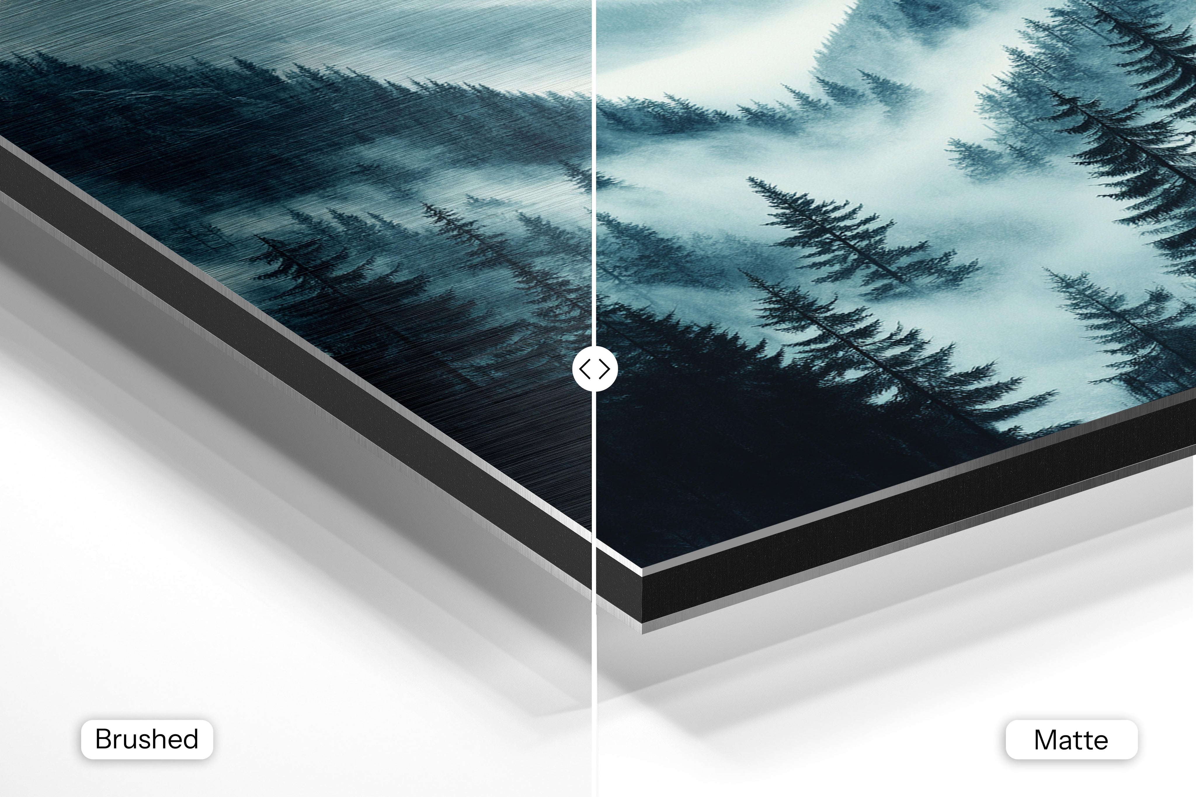 - Brushed Aluminum, on the other hand, features a raw metallic texture with visible brush strokes. Whites and highlights in your image let the silver surface show through, adding a dramatic, shimmering effect. Ideal for black-and-white images, minimalist designs, or abstract art, it creates a bold, industrial vibe with a modern edge.