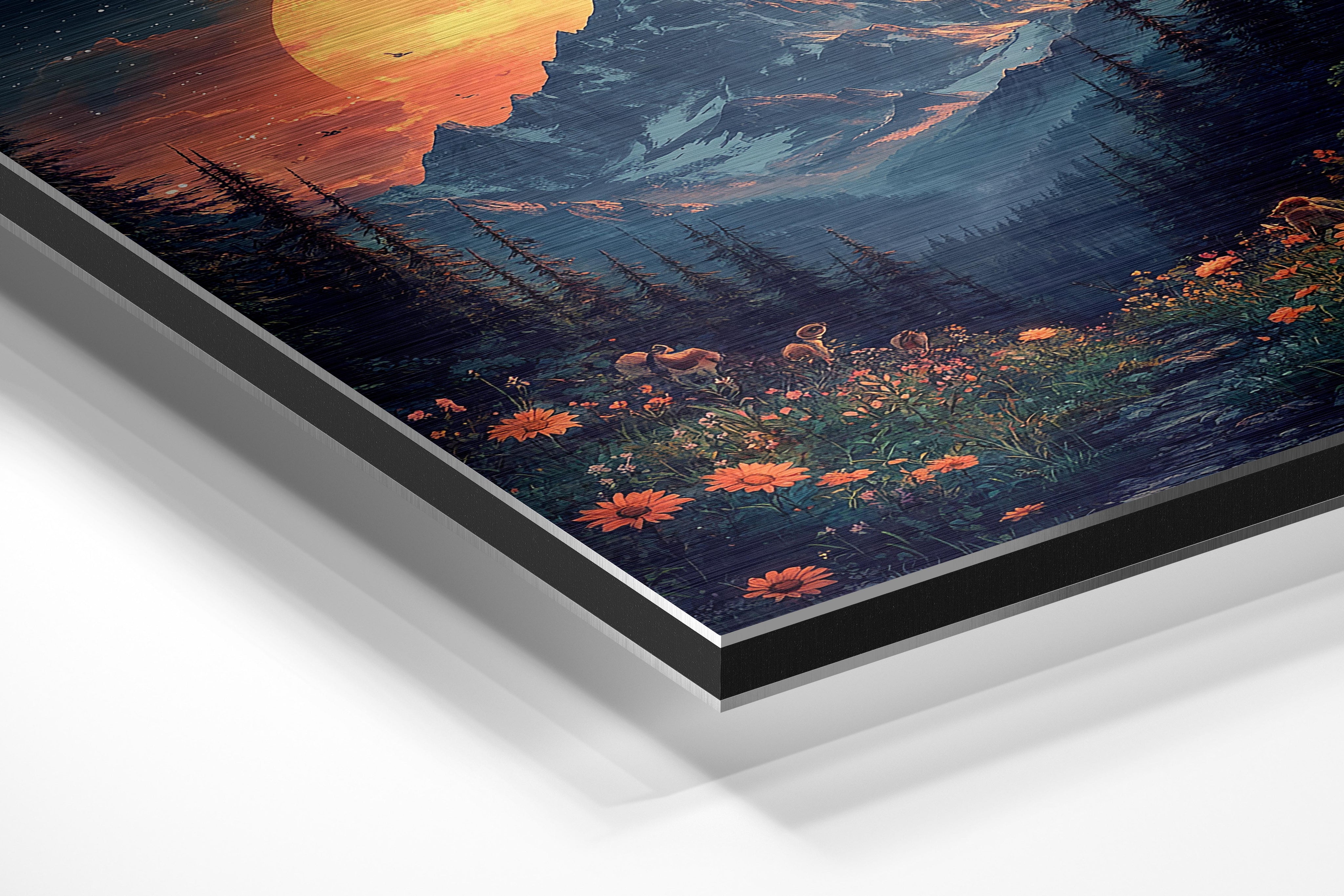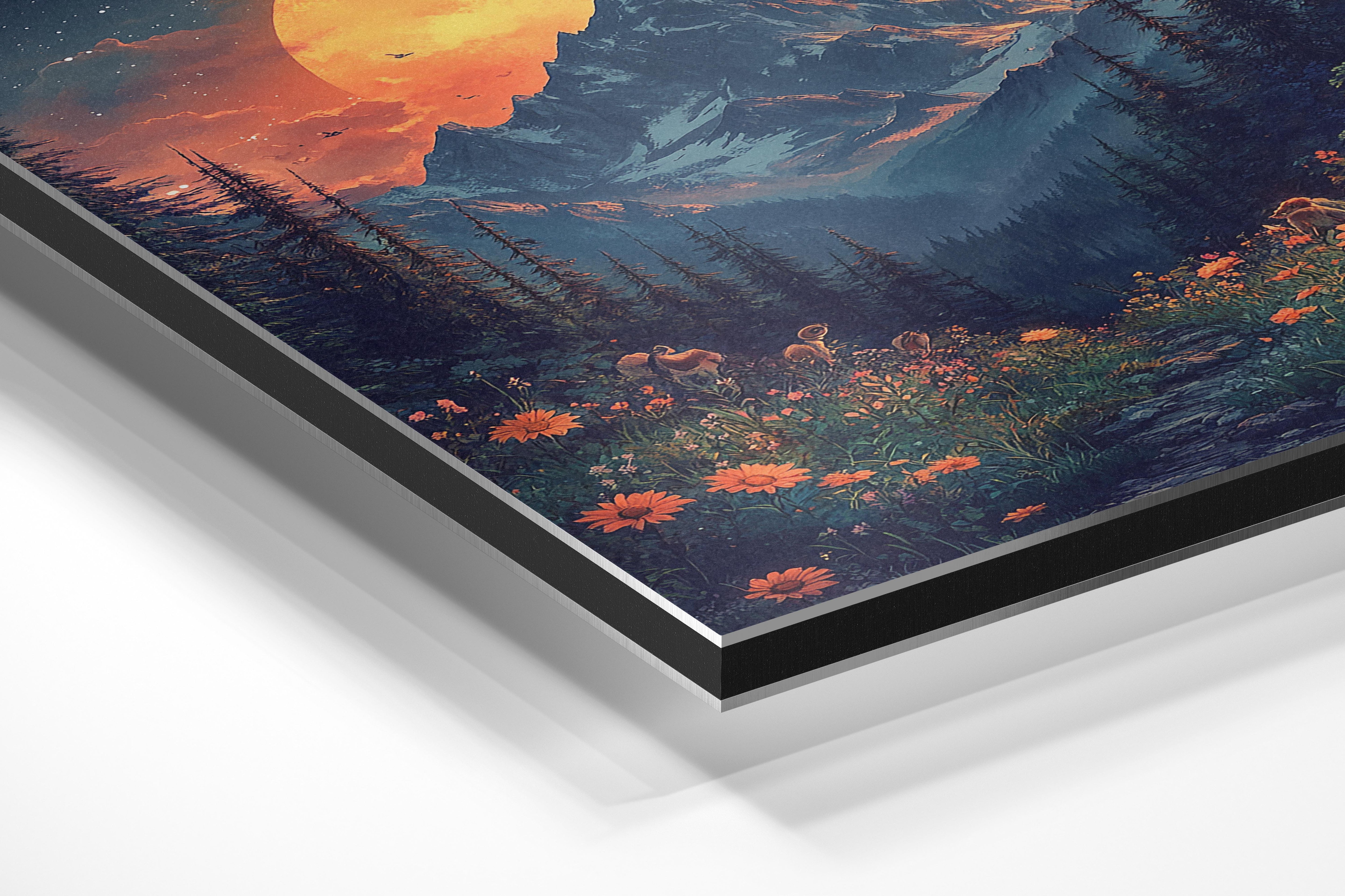 A mesmerizing scene of towering snow-capped mountains under the glow of a massive golden moon captivates the viewer. The foreground is alive with vibrant wildflowers and frolicking woodland creatures, creating a magical contrast to the majestic peaks. The soft interplay of twilight tones enhances the sense of wonder. Ideal for nature enthusiasts or dreamers, this piece brings serenity and enchantment to bedrooms, living rooms, or meditation spaces. Its balance of tranquility and grandeur makes it a standout in any collection.