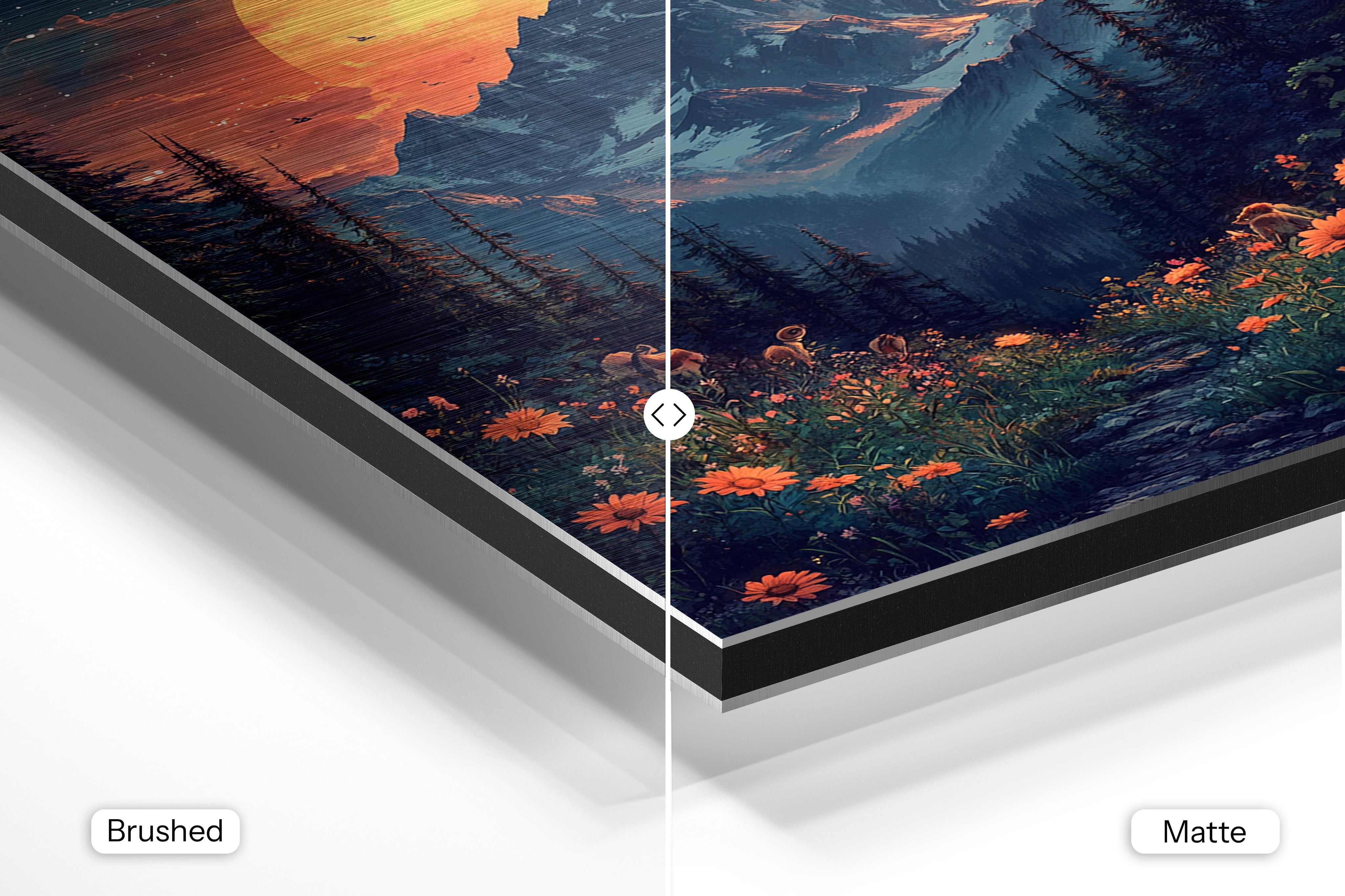 - Brushed Aluminum, on the other hand, features a raw metallic texture with visible brush strokes. Whites and highlights in your image let the silver surface show through, adding a dramatic, shimmering effect. Ideal for black-and-white images, minimalist designs, or abstract art, it creates a bold, industrial vibe with a modern edge.