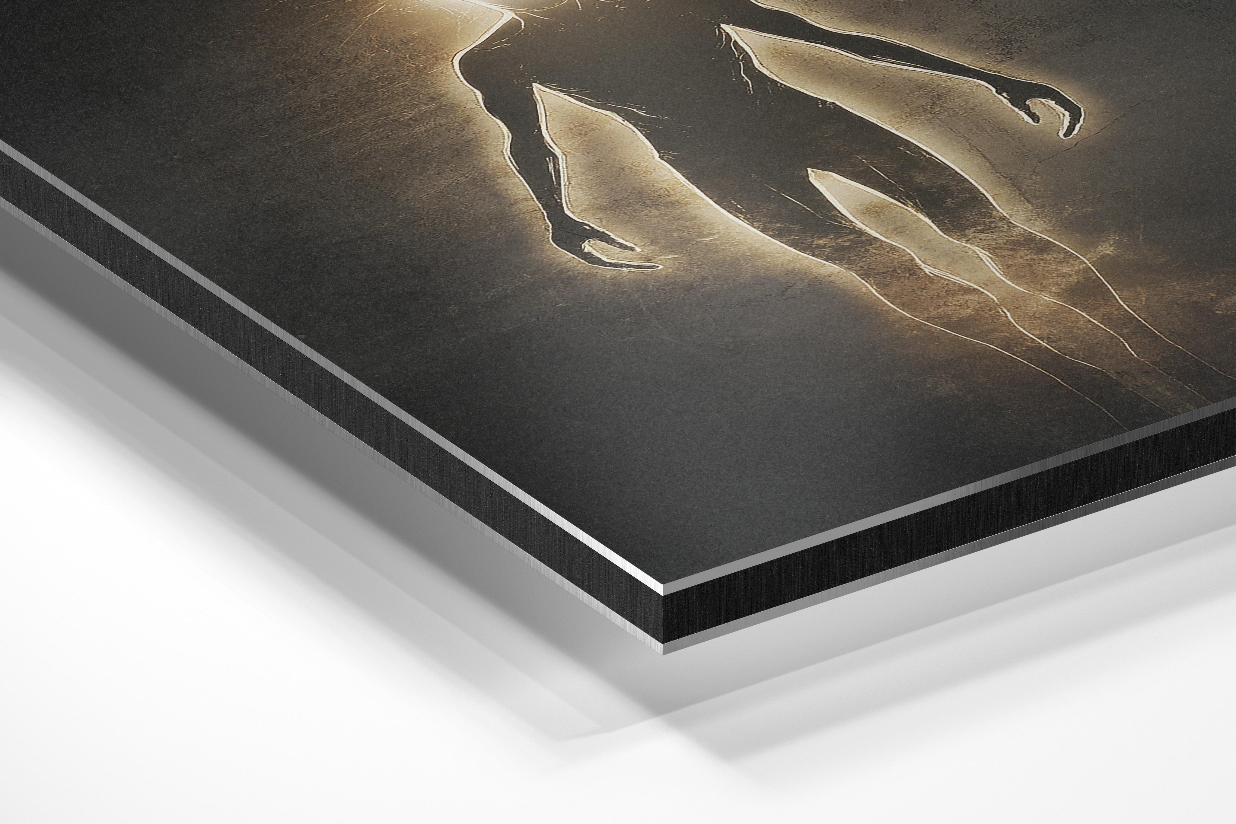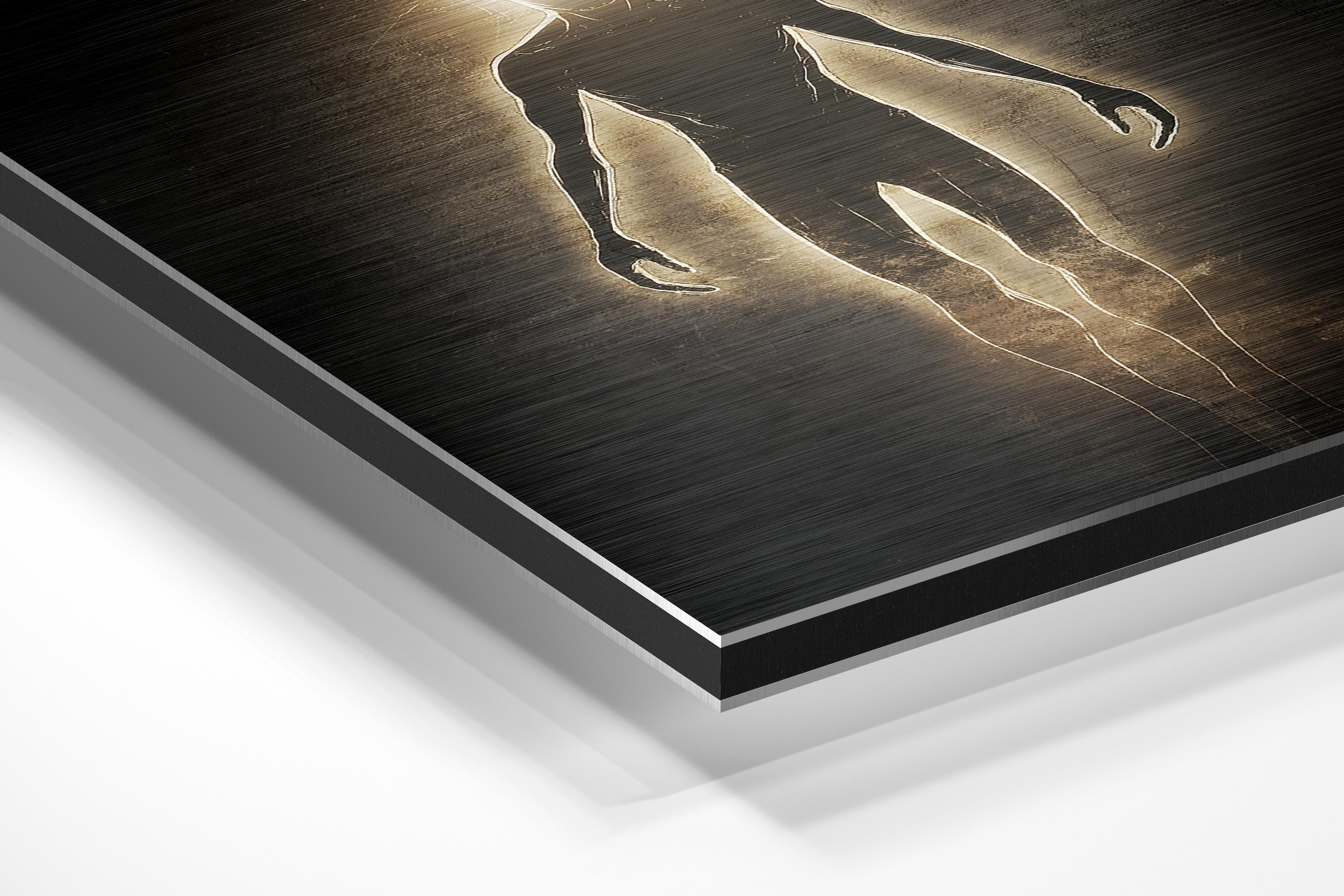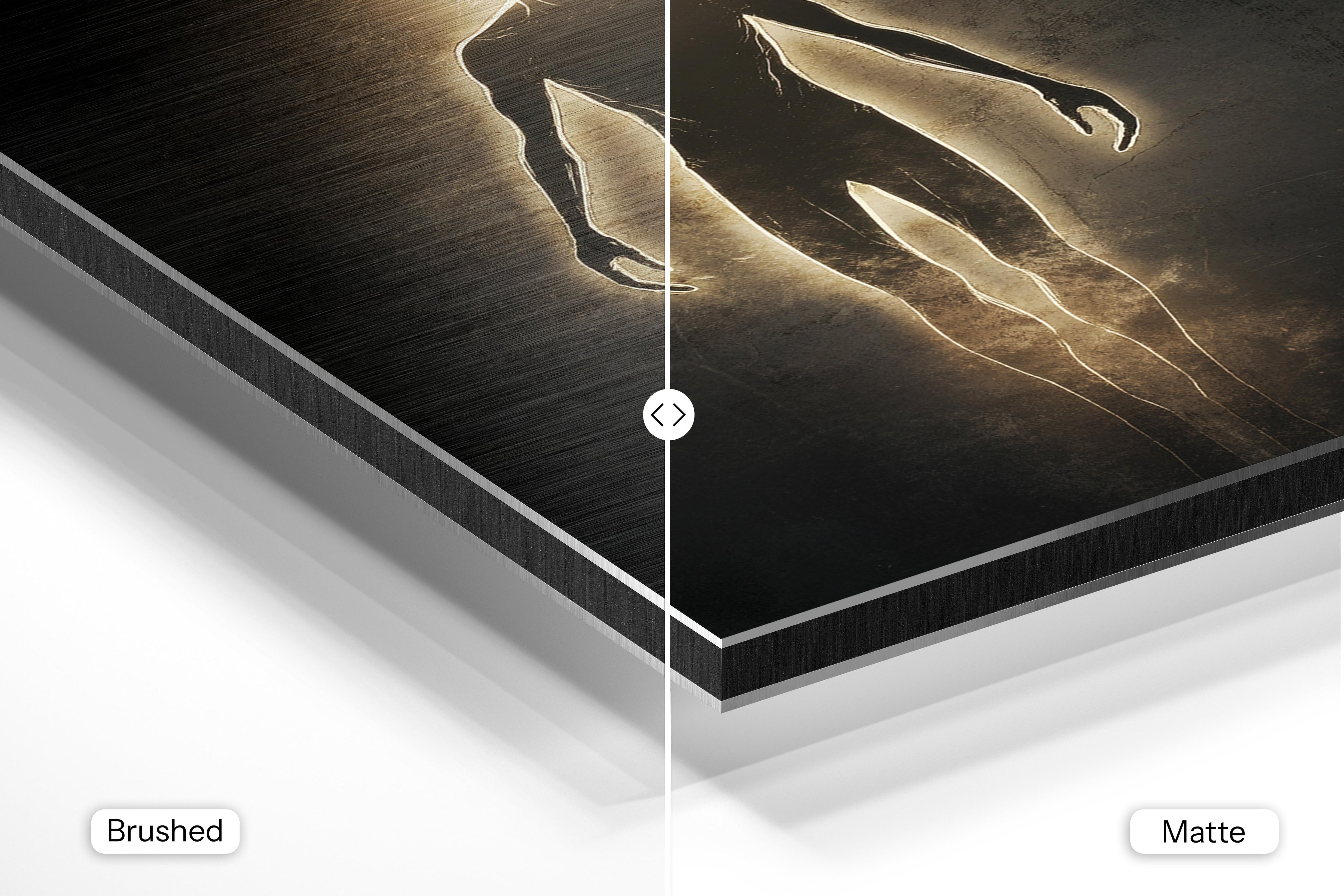- Brushed Aluminum, on the other hand, features a raw metallic texture with visible brush strokes. Whites and highlights in your image let the silver surface show through, adding a dramatic, shimmering effect. Ideal for black-and-white images, minimalist designs, or abstract art, it creates a bold, industrial vibe with a modern edge.