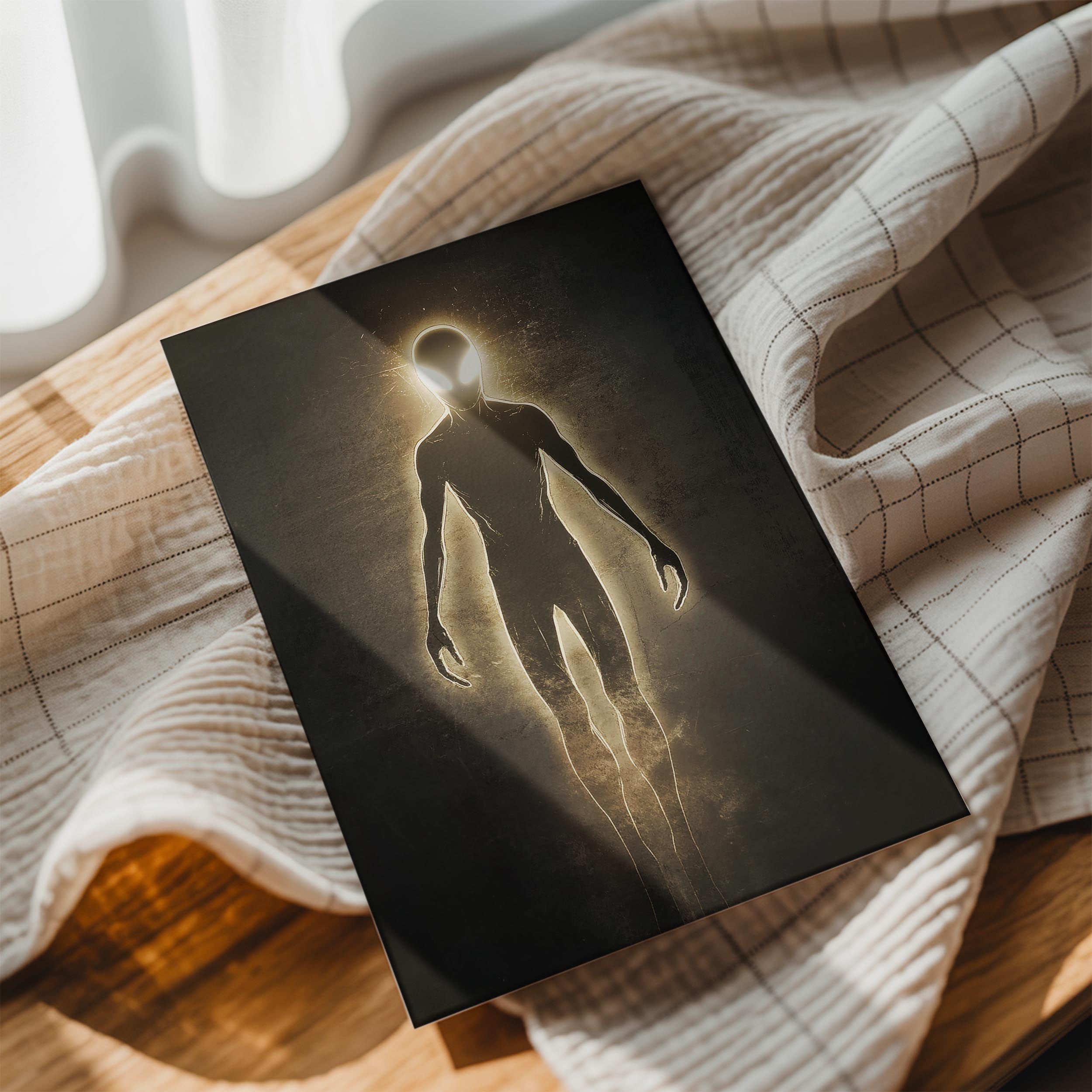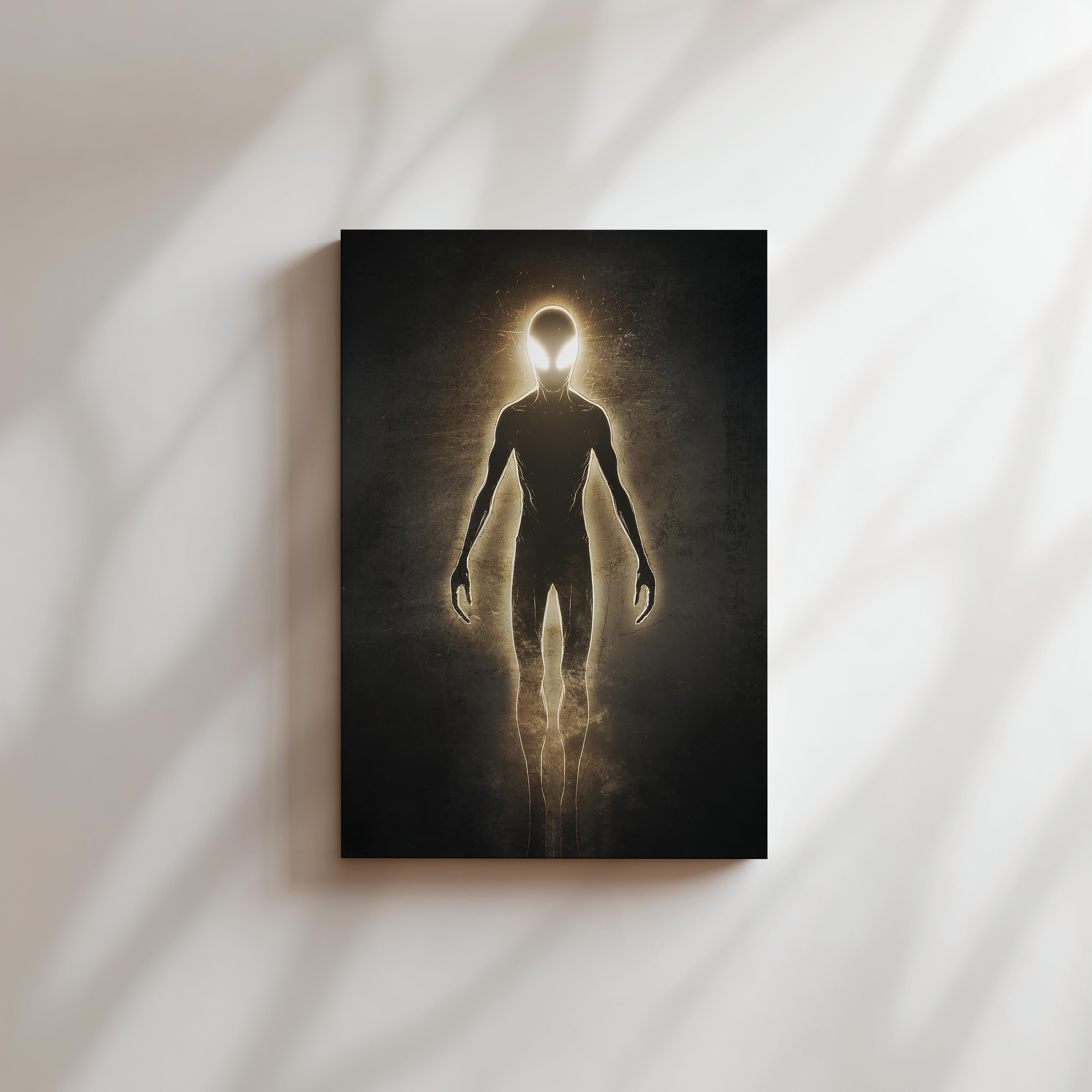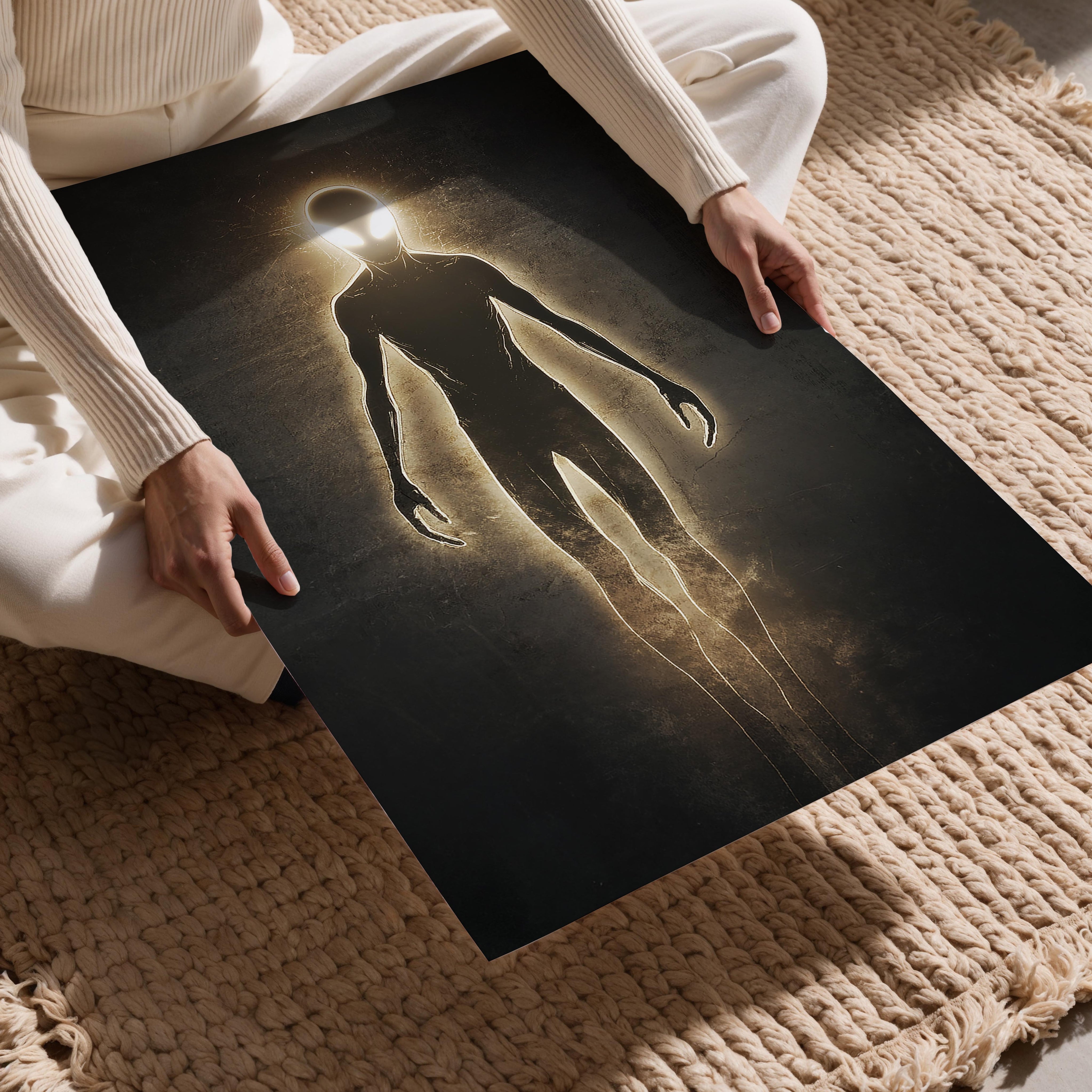 This artwork presents a luminous being composed entirely of radiant light, set against a textured dark background. The figure's sleek, humanoid form suggests transcendence and spiritual awakening, making it a perfect addition to spaces emphasizing mindfulness or futuristic themes. The glowing edges of the figure evoke feelings of hope and cosmic energy, offering inspiration and beauty.