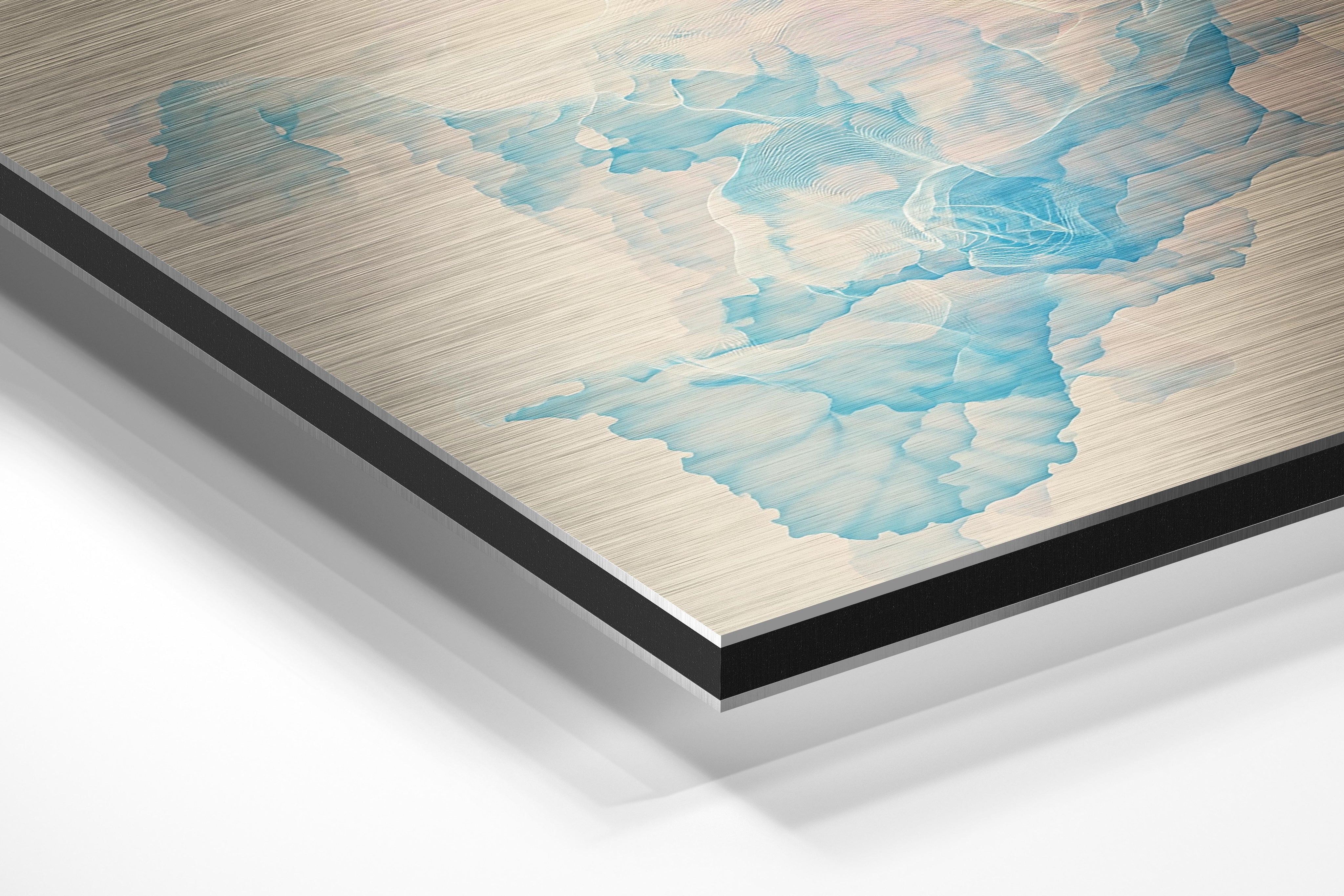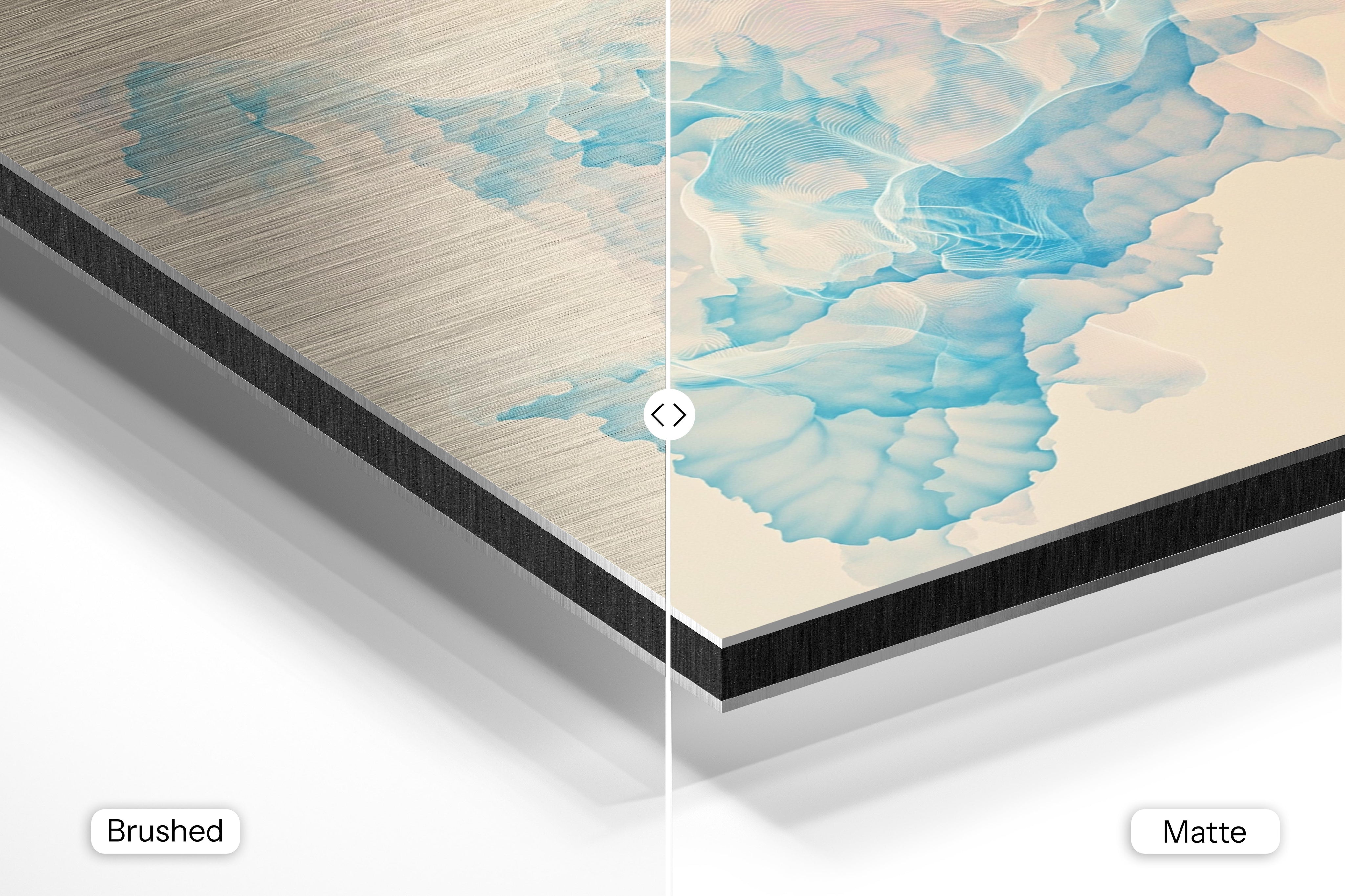 - Brushed Aluminum, on the other hand, features a raw metallic texture with visible brush strokes. Whites and highlights in your image let the silver surface show through, adding a dramatic, shimmering effect. Ideal for black-and-white images, minimalist designs, or abstract art, it creates a bold, industrial vibe with a modern edge.