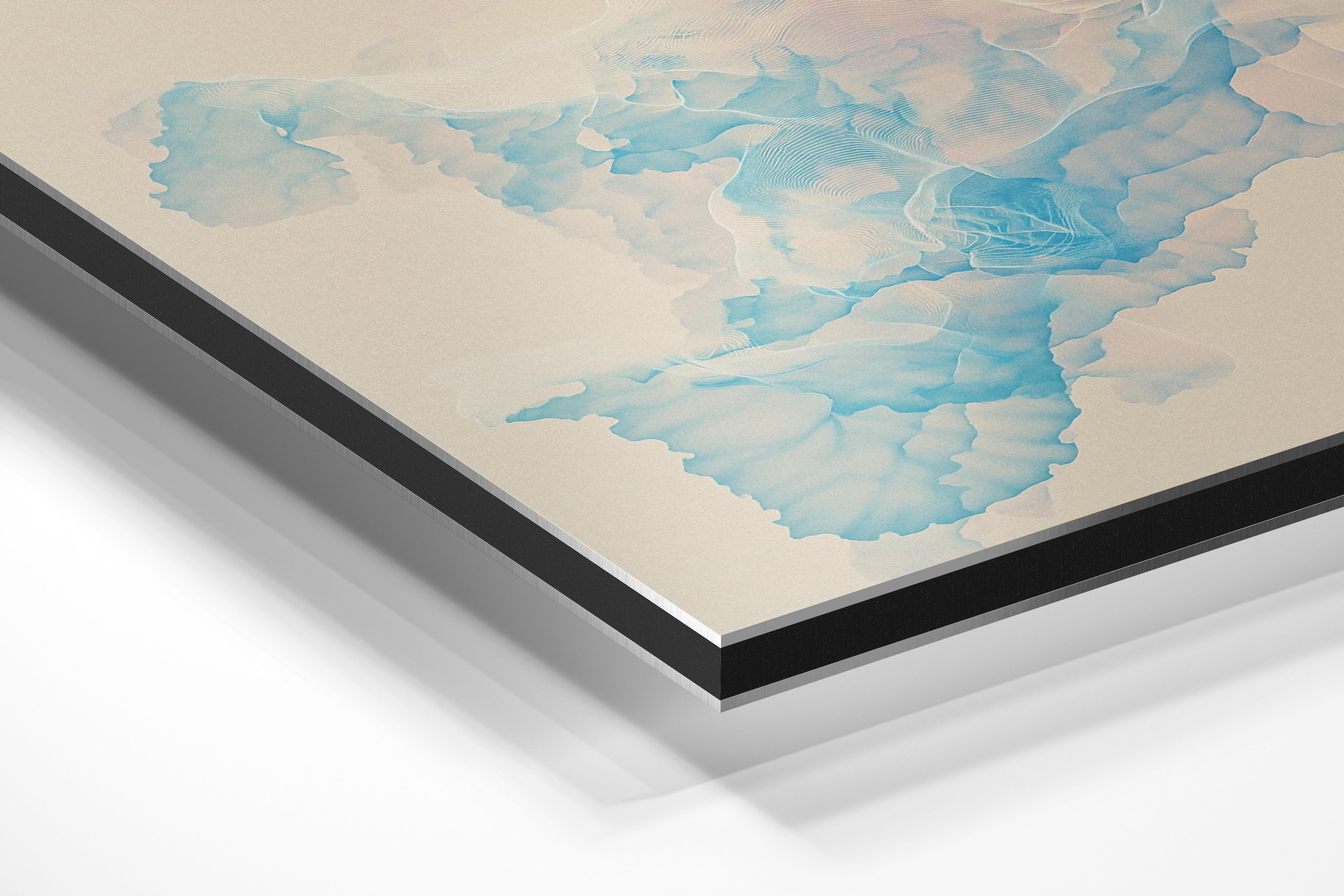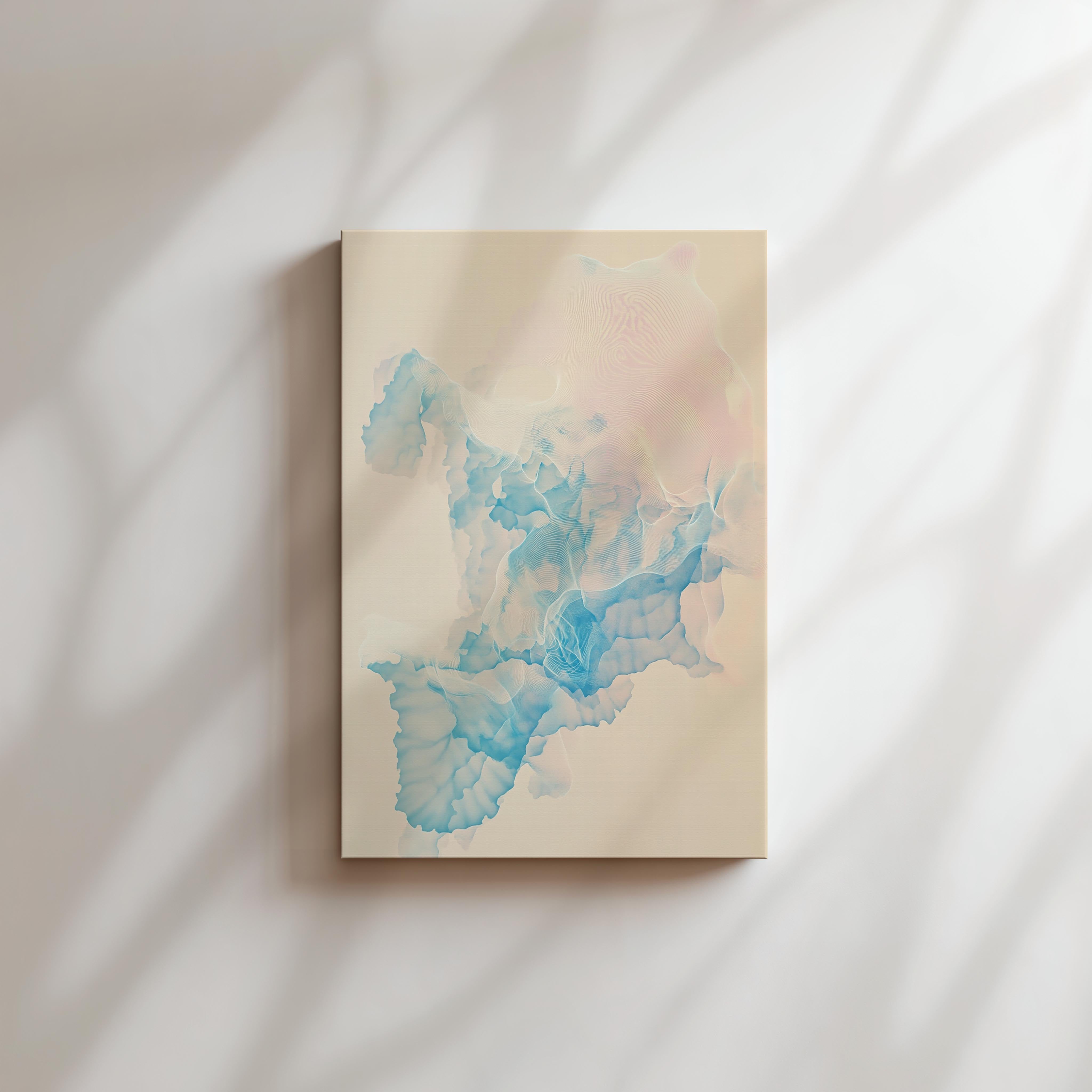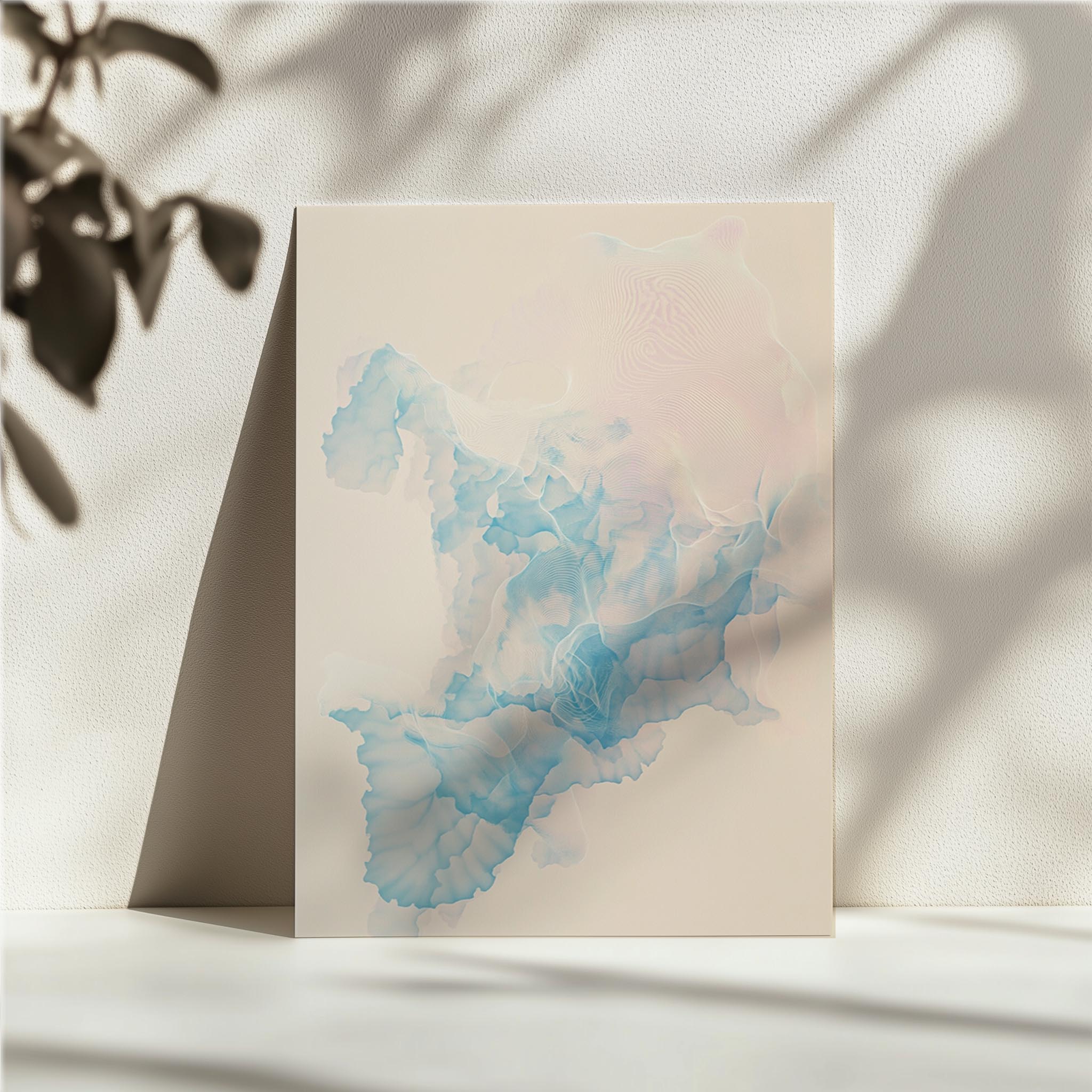 A delicate abstract piece resembling flowing waves or clouds, rendered in soft pastel blue hues. The intricate textures and organic shapes make this artwork a versatile choice for modern or minimalist spaces. It evokes calmness and creativity, offering a tranquil aesthetic for living rooms, offices, or creative studios.