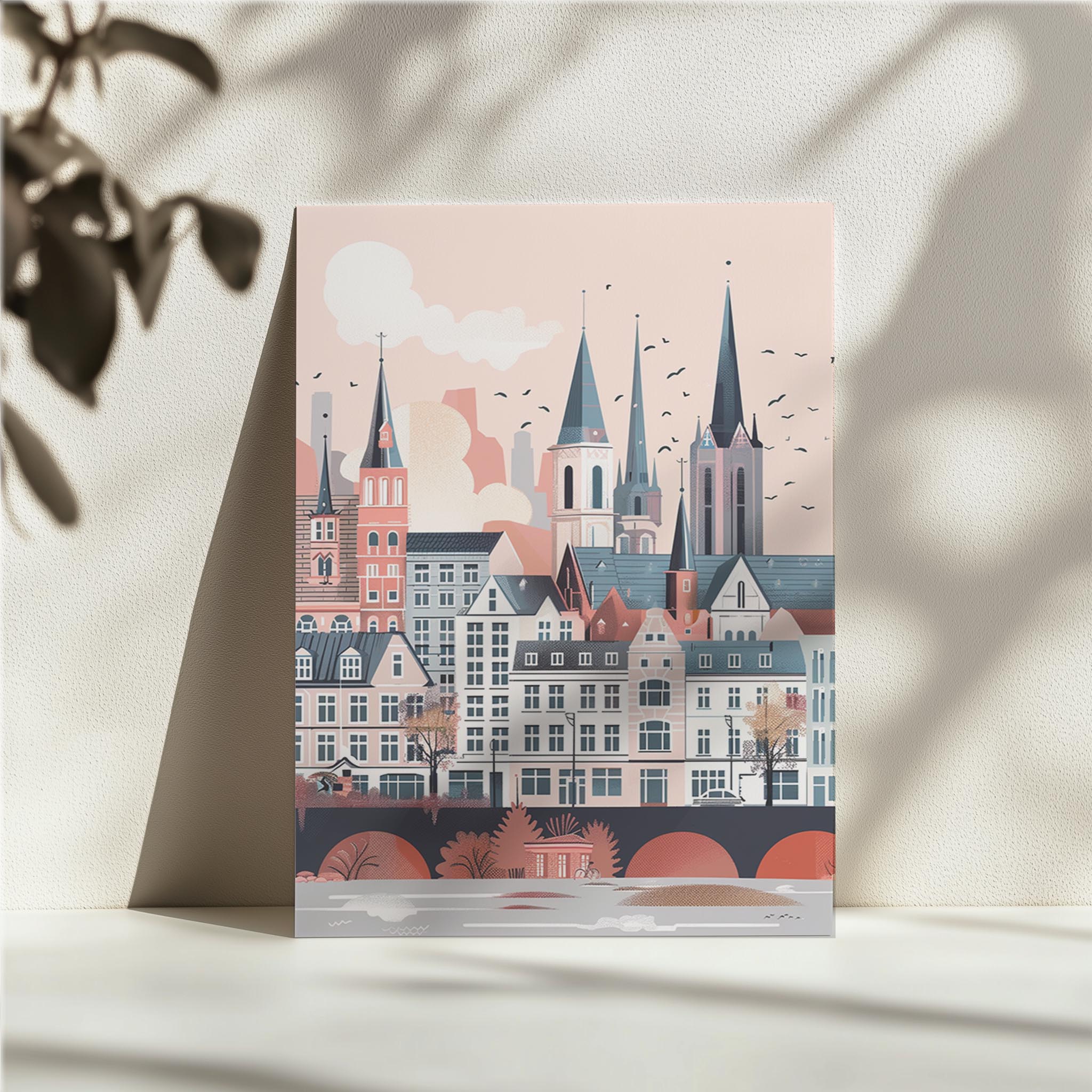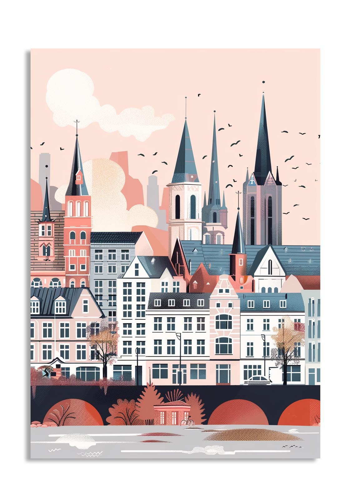A delightful illustration of a European cityscape featuring a mix of old-world buildings with tall spires, gabled roofs, and modern elements. The harmonious pastel palette with peach, coral, and blue tones makes it visually soothing while lively details like birds and tree-lined streets add animation. Suitable for children's rooms, creative offices, or modern apartments, the artwork balances architectural sophistication with playful flair. Its graphic design appeal ensures it fits well in both traditional and contemporary settings.