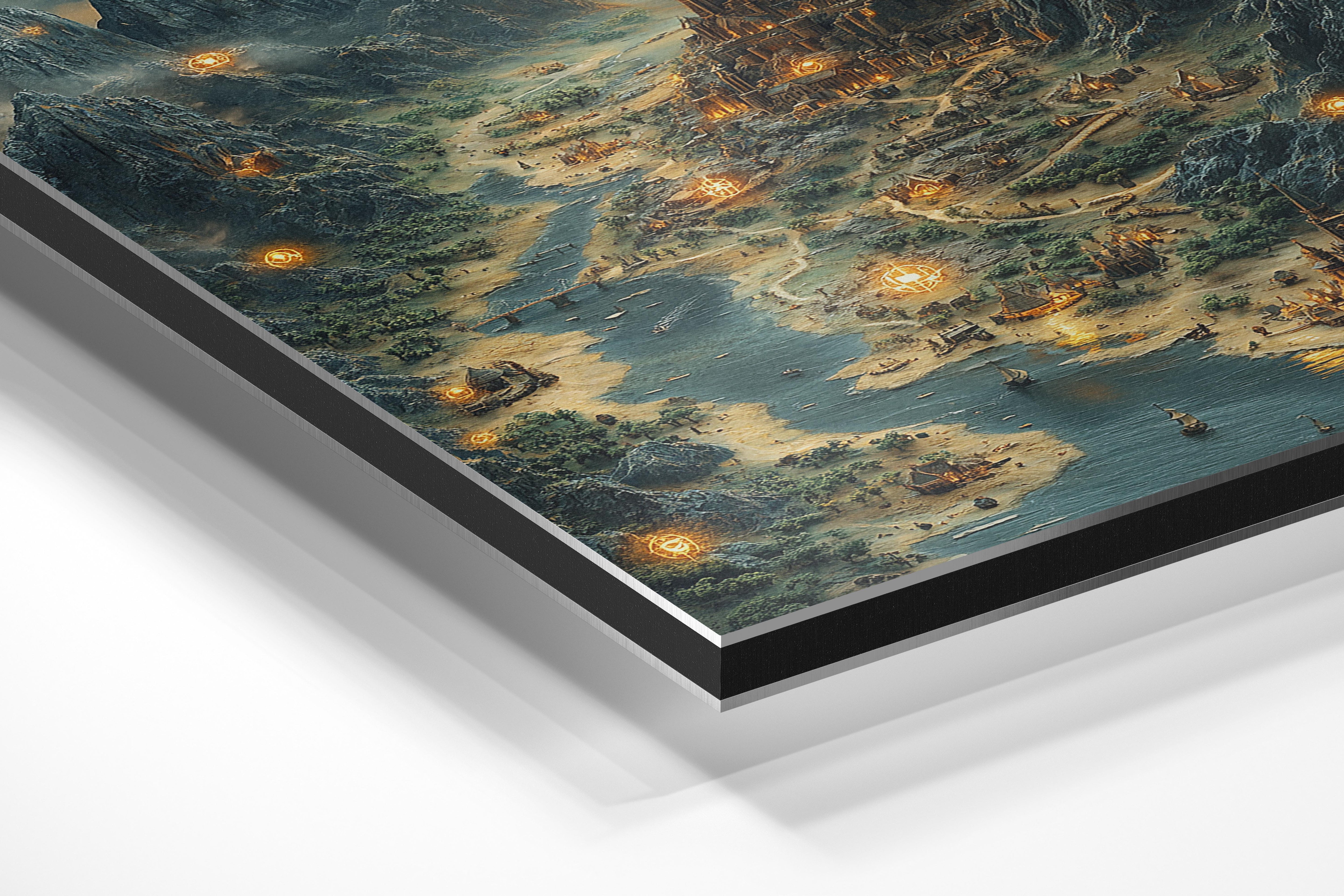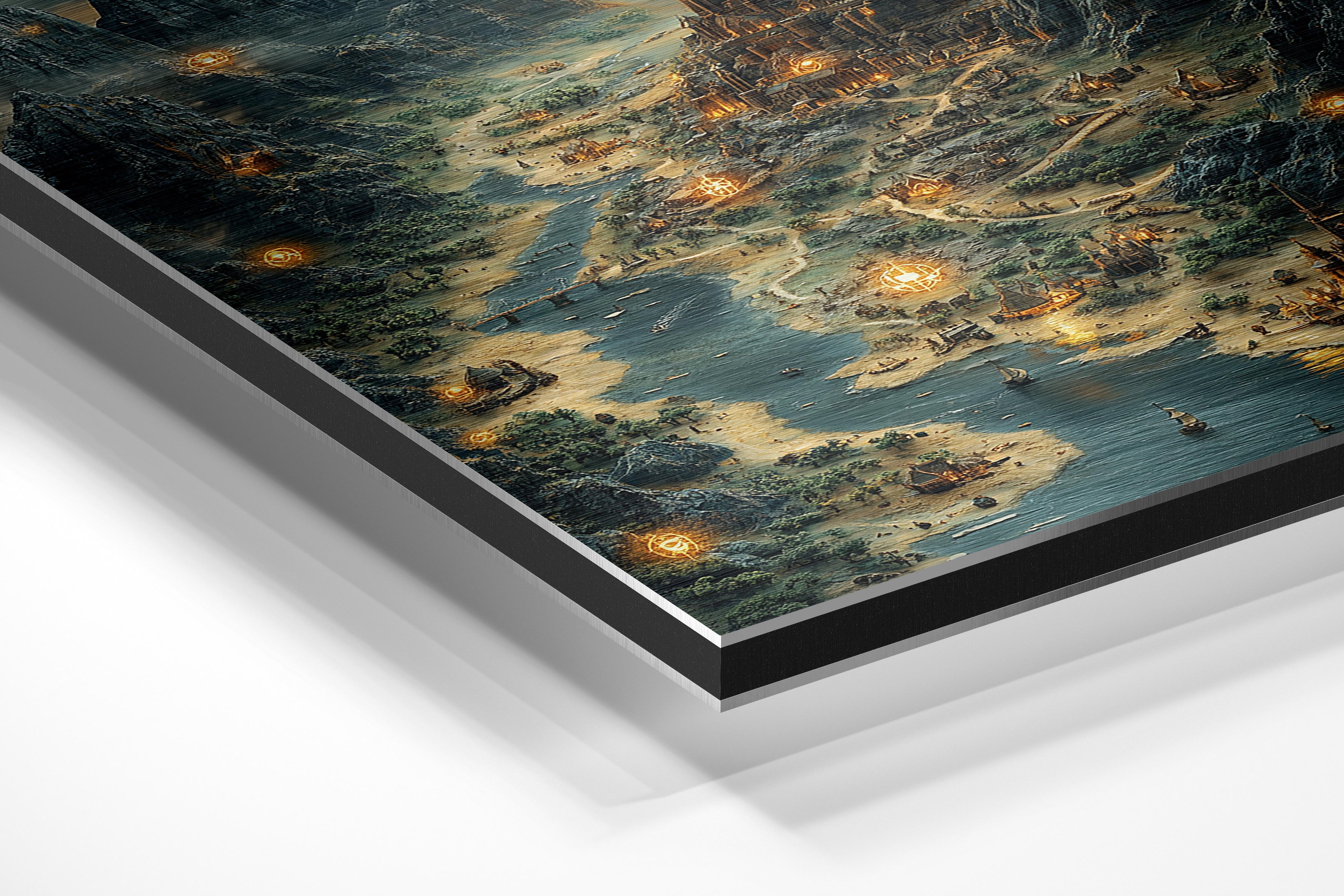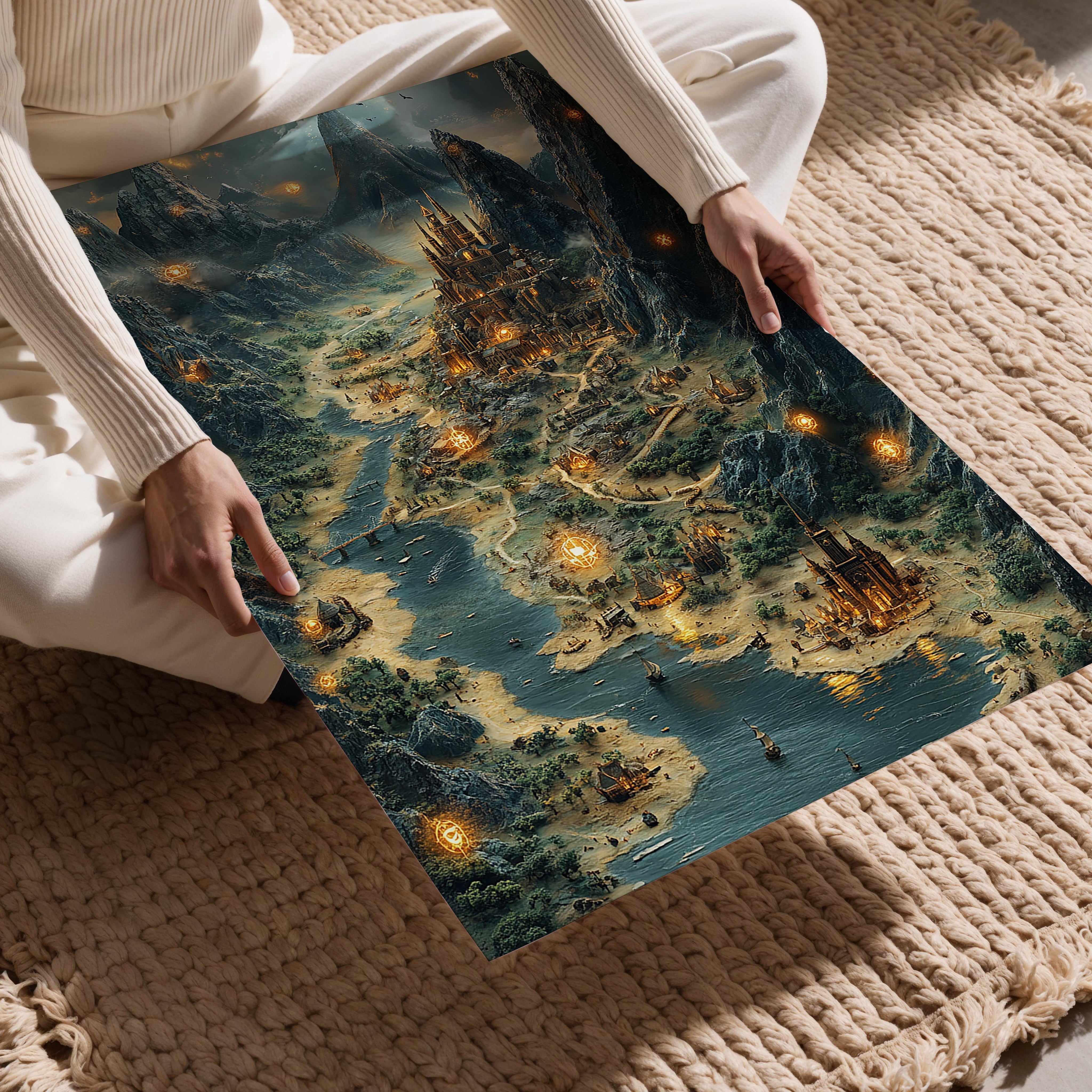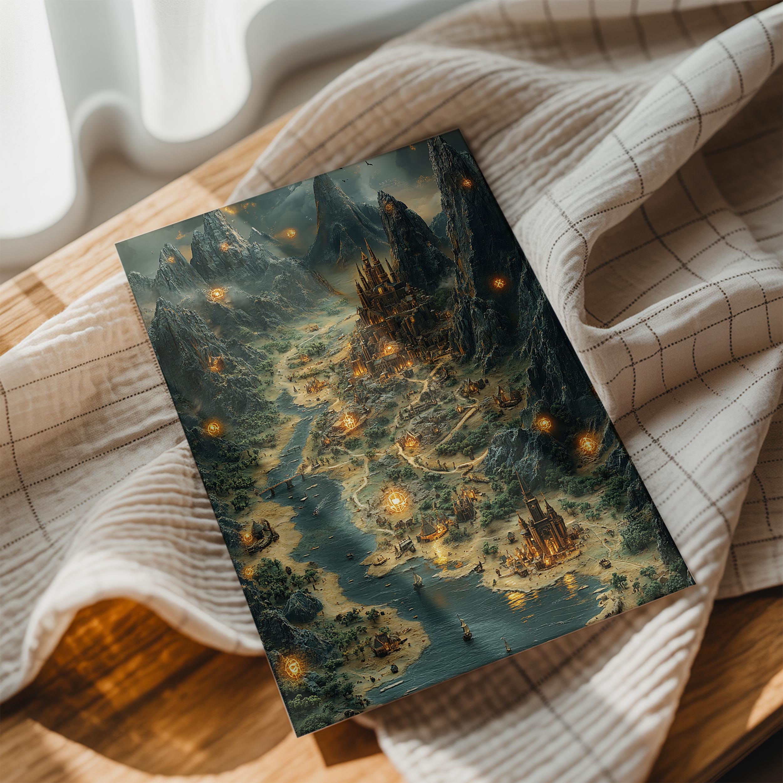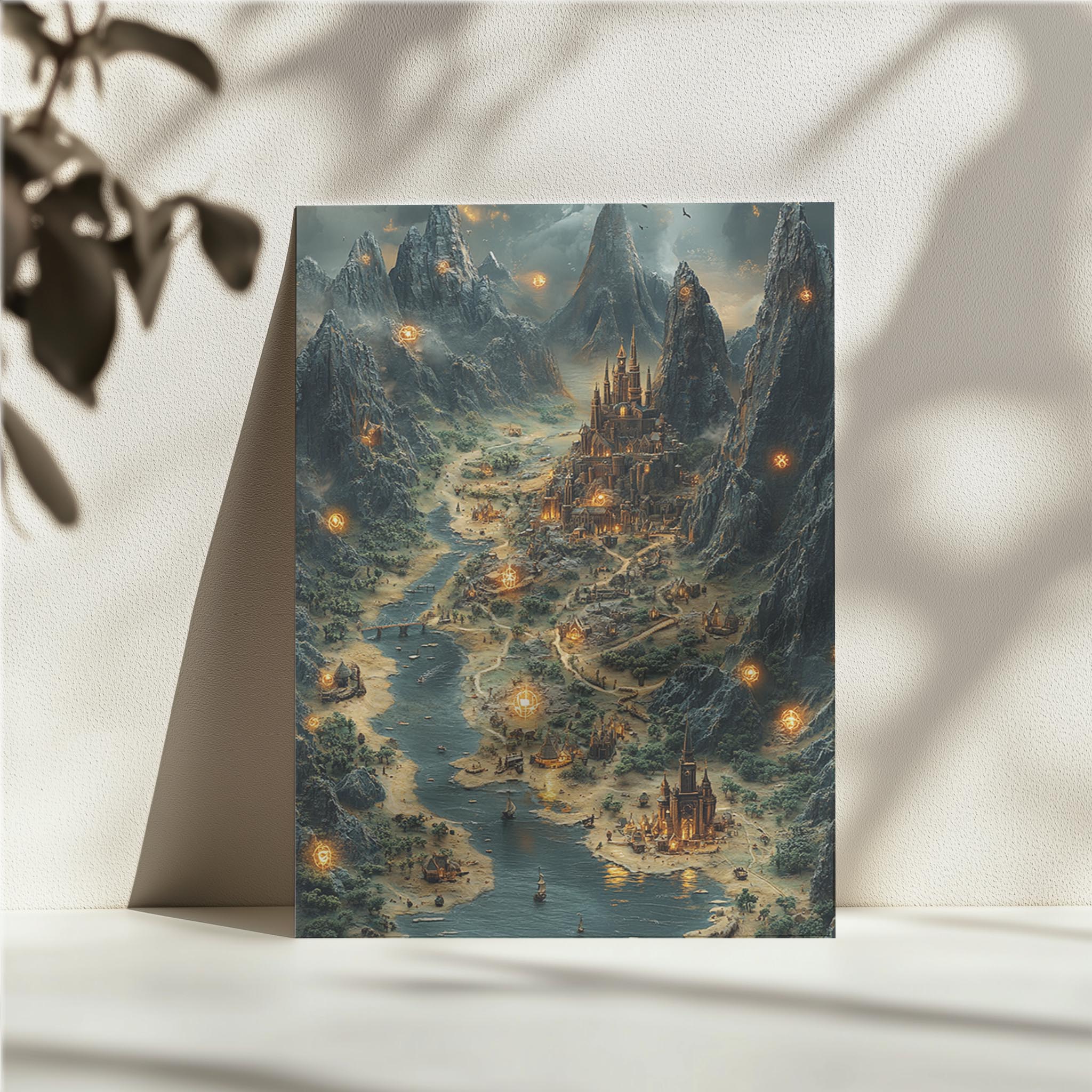 A sprawling valley with a majestic castle at its center, surrounded by glowing lights and towering mountains. The intricate details and golden glow make this piece a captivating addition to fantasy-themed spaces. Perfect for dreamers and adventurers looking to bring an epic tale to life on their walls.