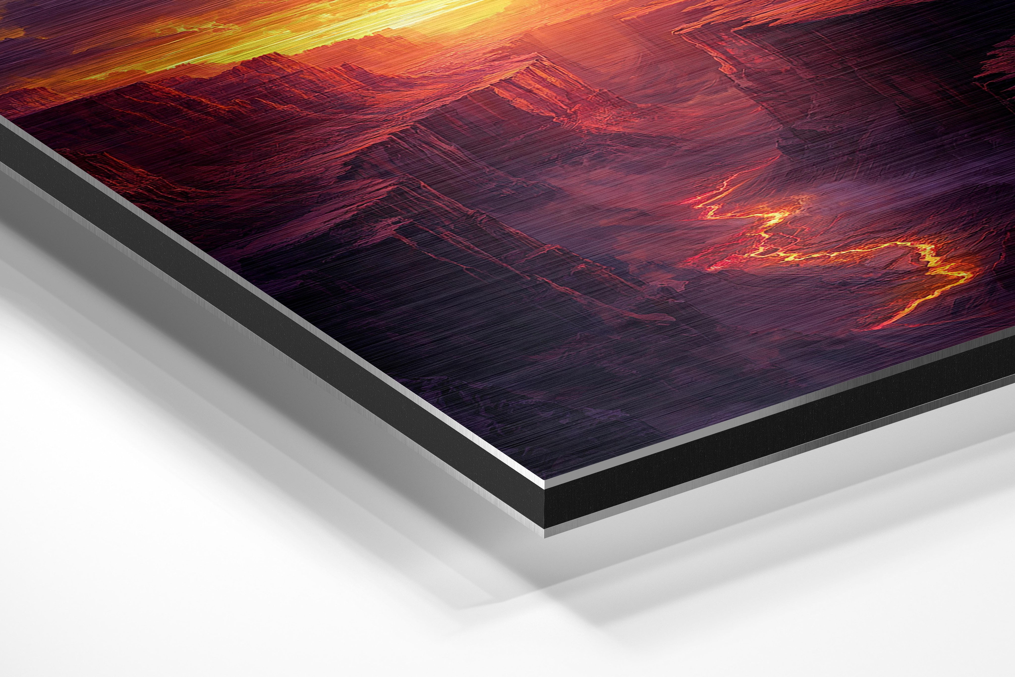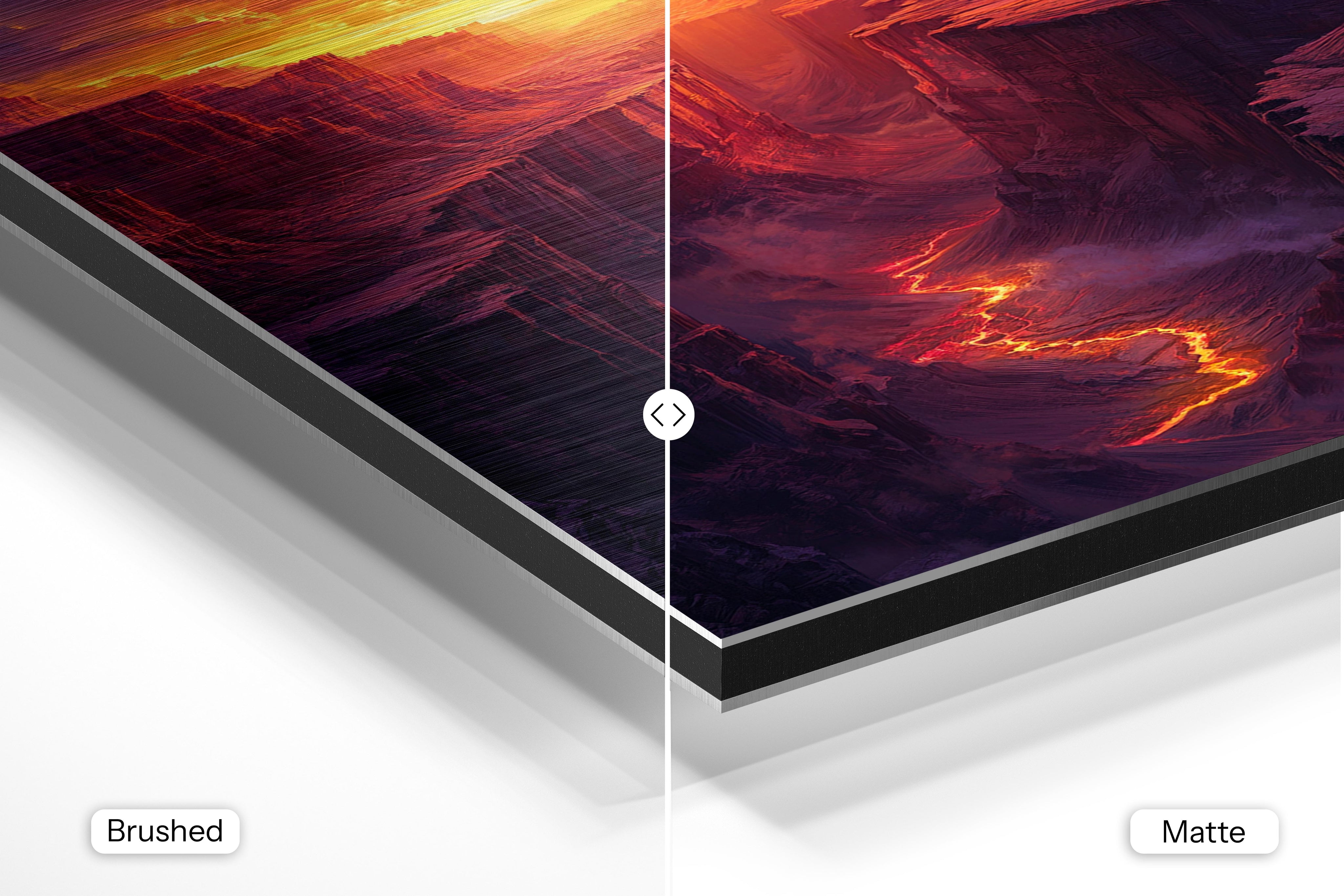 - Brushed Aluminum, on the other hand, features a raw metallic texture with visible brush strokes. Whites and highlights in your image let the silver surface show through, adding a dramatic, shimmering effect. Ideal for black-and-white images, minimalist designs, or abstract art, it creates a bold, industrial vibe with a modern edge.