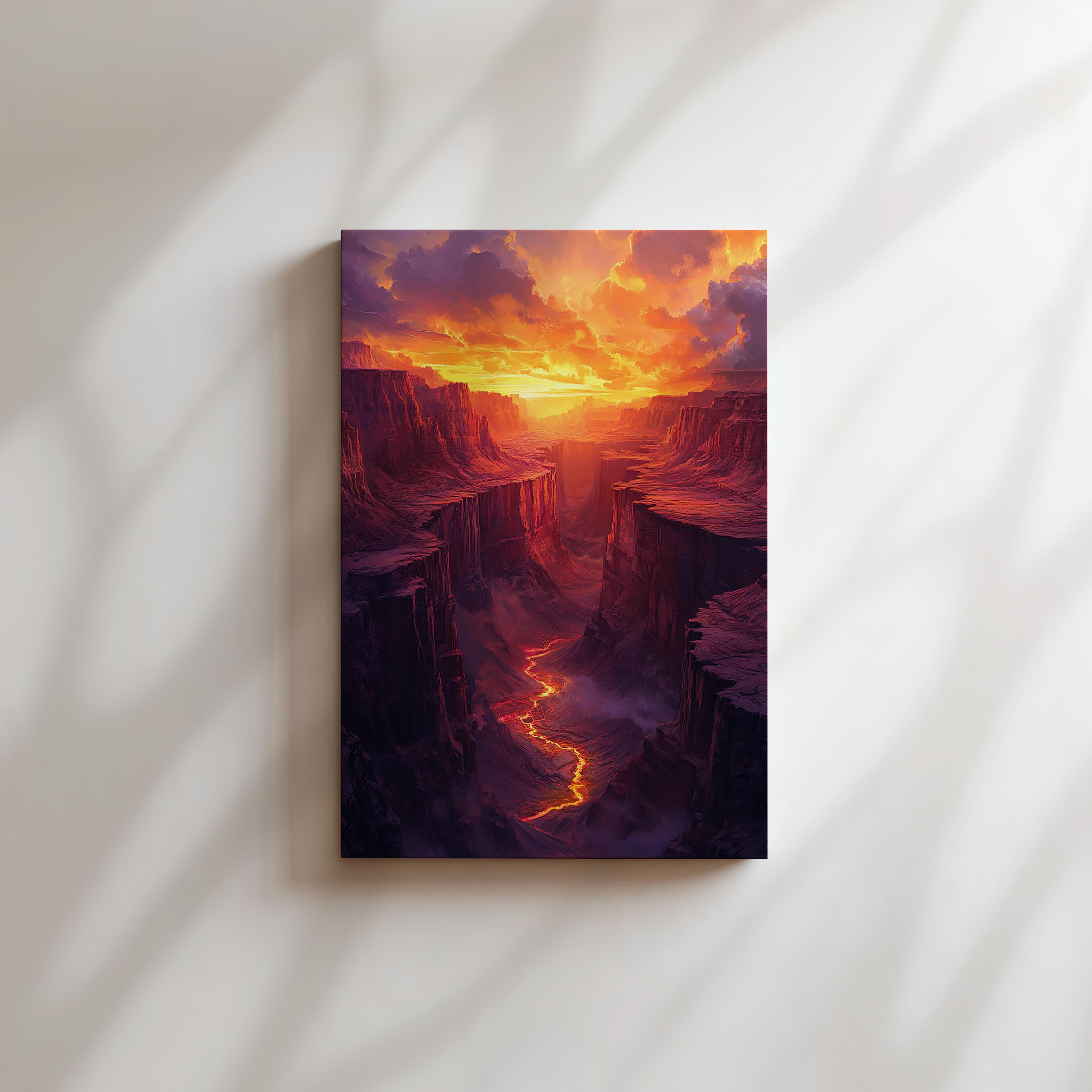 A fiery canyon with glowing hues of molten light creating an otherworldly stream running through its heart. The bold contrast of colors evokes a sense of wonder and showcases the magnificent artistry of geological formations. It’s a breathtaking glimpse into the planet’s dynamic landscapes.