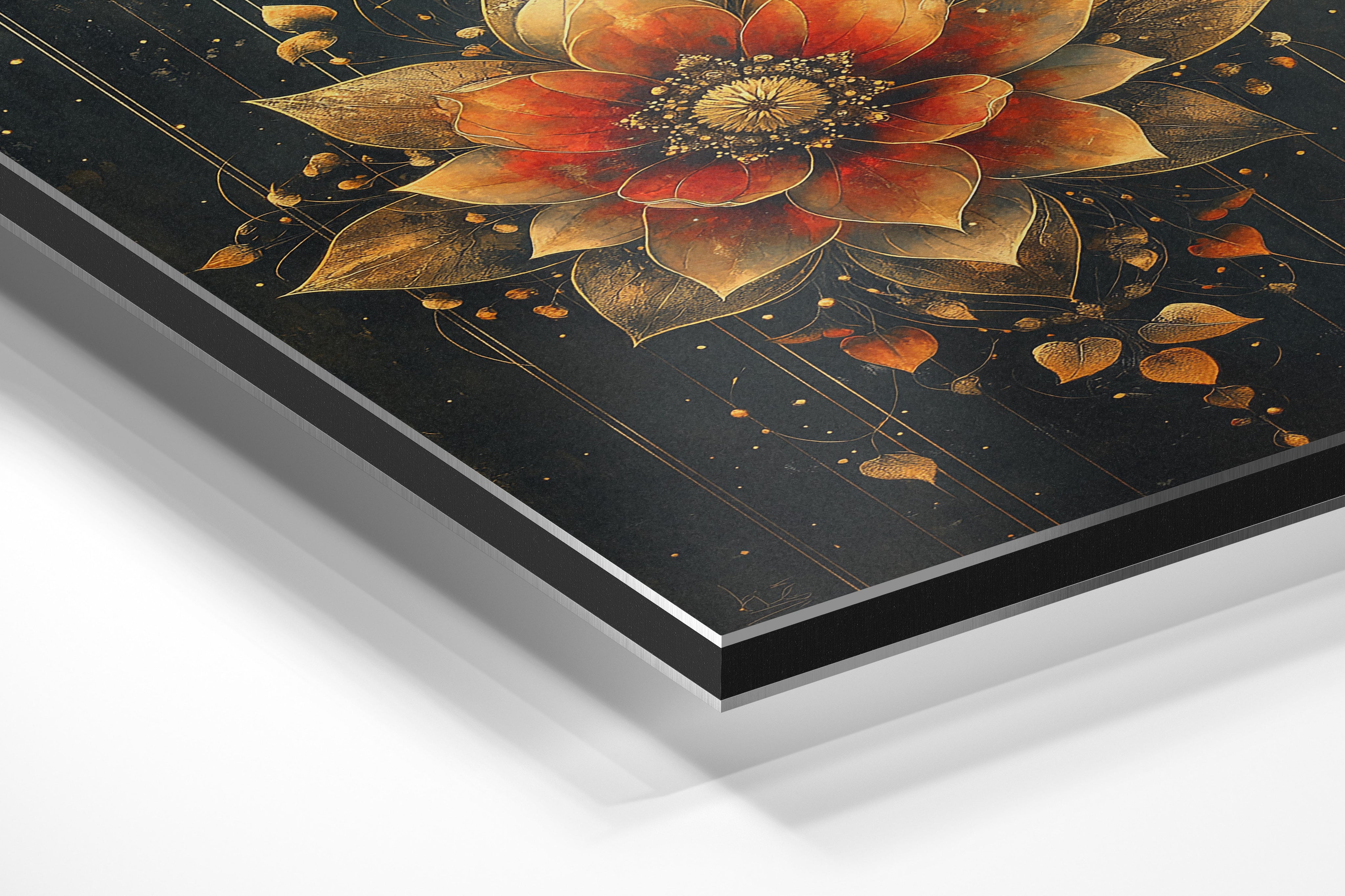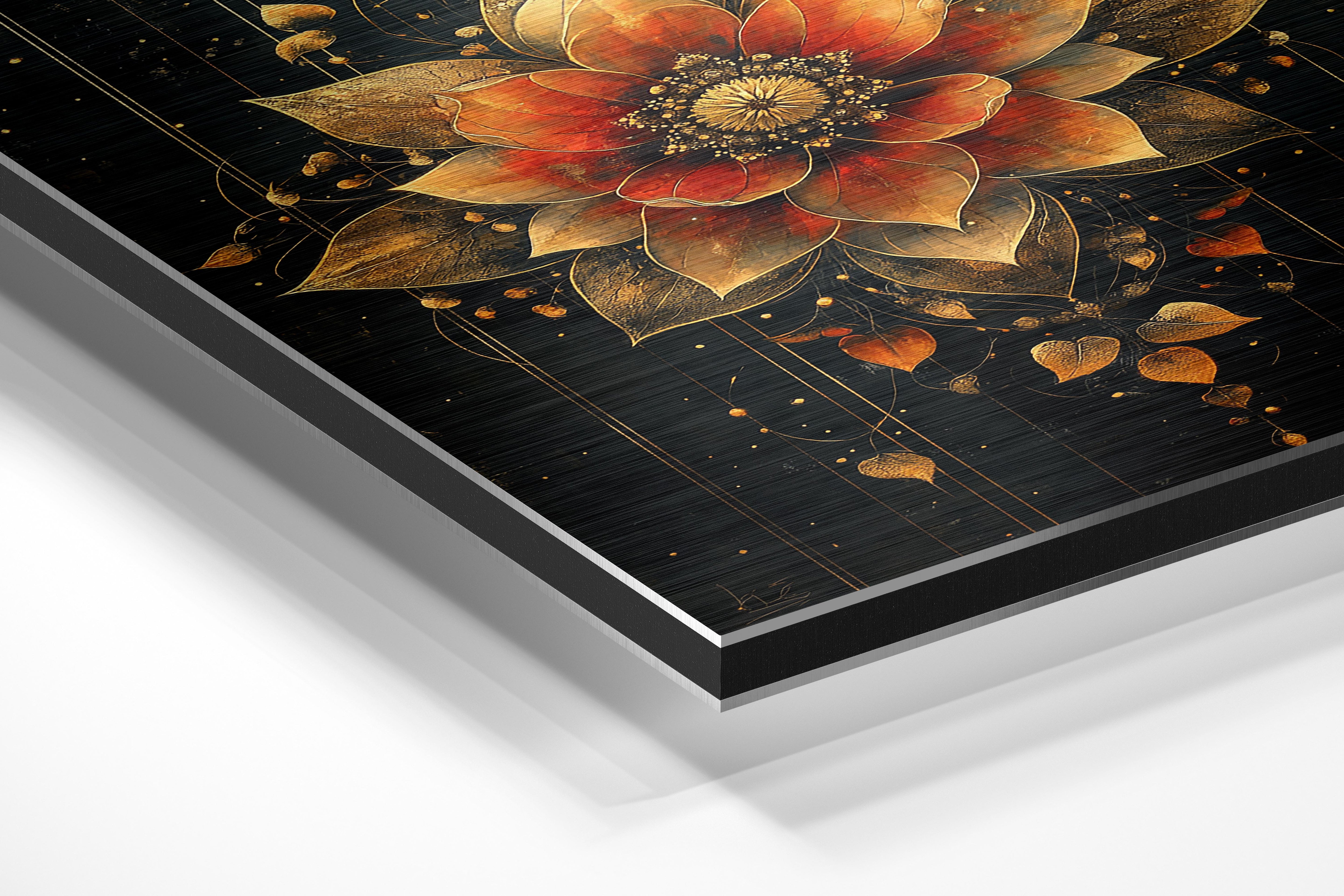 A bold and dramatic floral mandala with fiery red and gold tones that create an intense and captivating visual. This piece symbolizes passion and vitality, making it ideal for spaces aiming to evoke strong emotions and creativity. Perfect for art studios, modern living rooms, or eclectic spaces, it appeals to individuals who appreciate vibrant and daring designs. The intricate details and luminous hues make it an eye-catching centerpiece that enlivens any room.