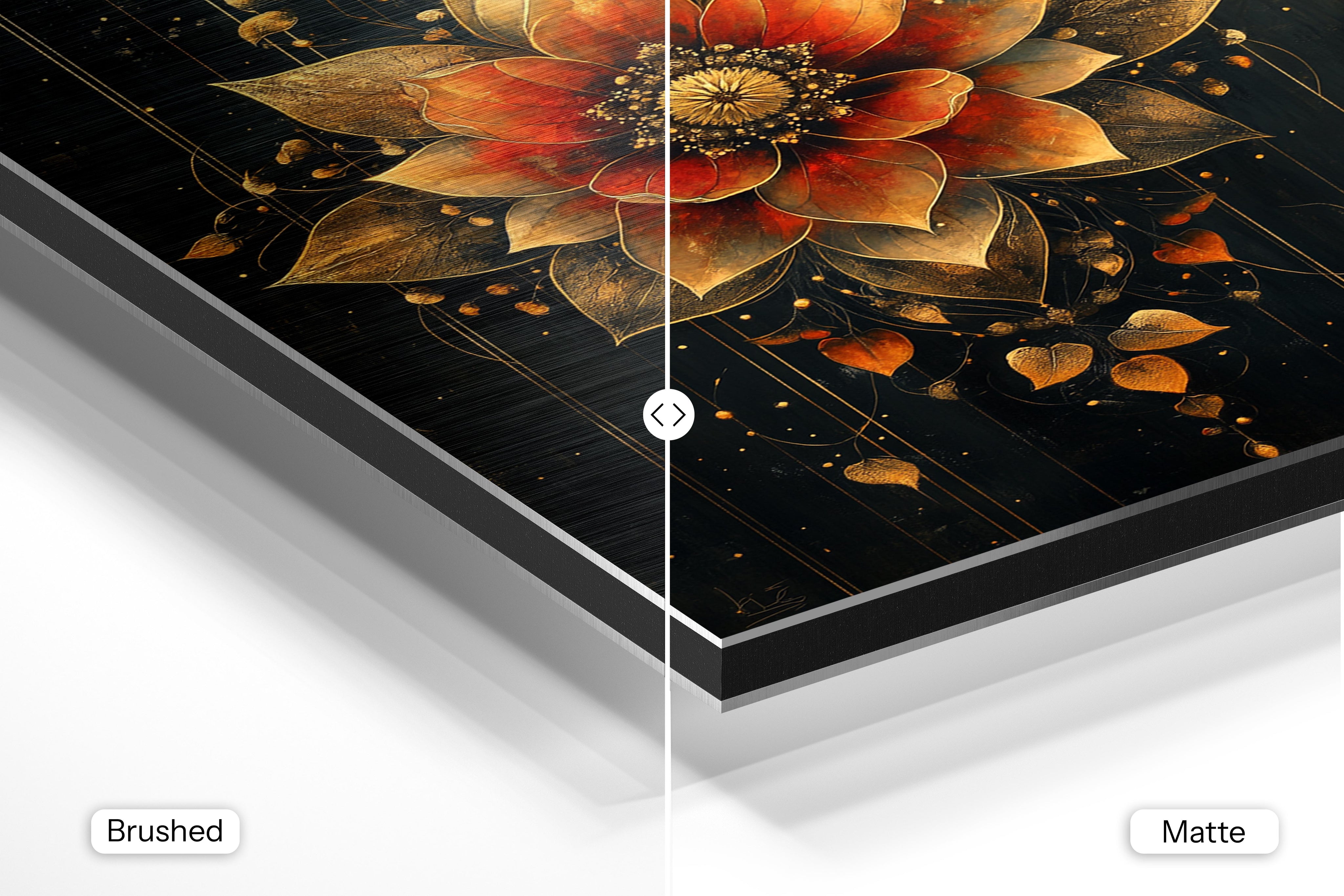 - Brushed Aluminum, on the other hand, features a raw metallic texture with visible brush strokes. Whites and highlights in your image let the silver surface show through, adding a dramatic, shimmering effect. Ideal for black-and-white images, minimalist designs, or abstract art, it creates a bold, industrial vibe with a modern edge.
