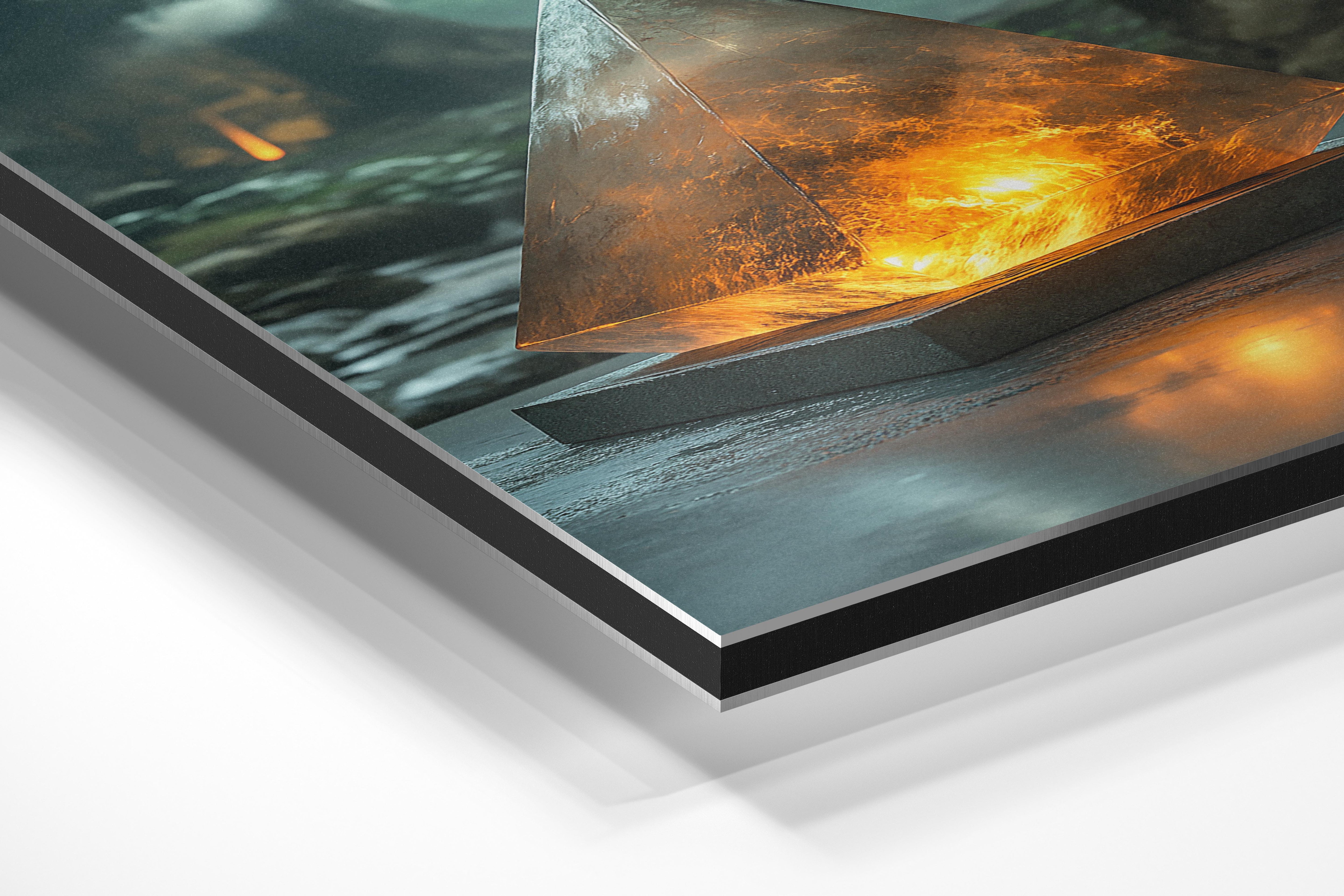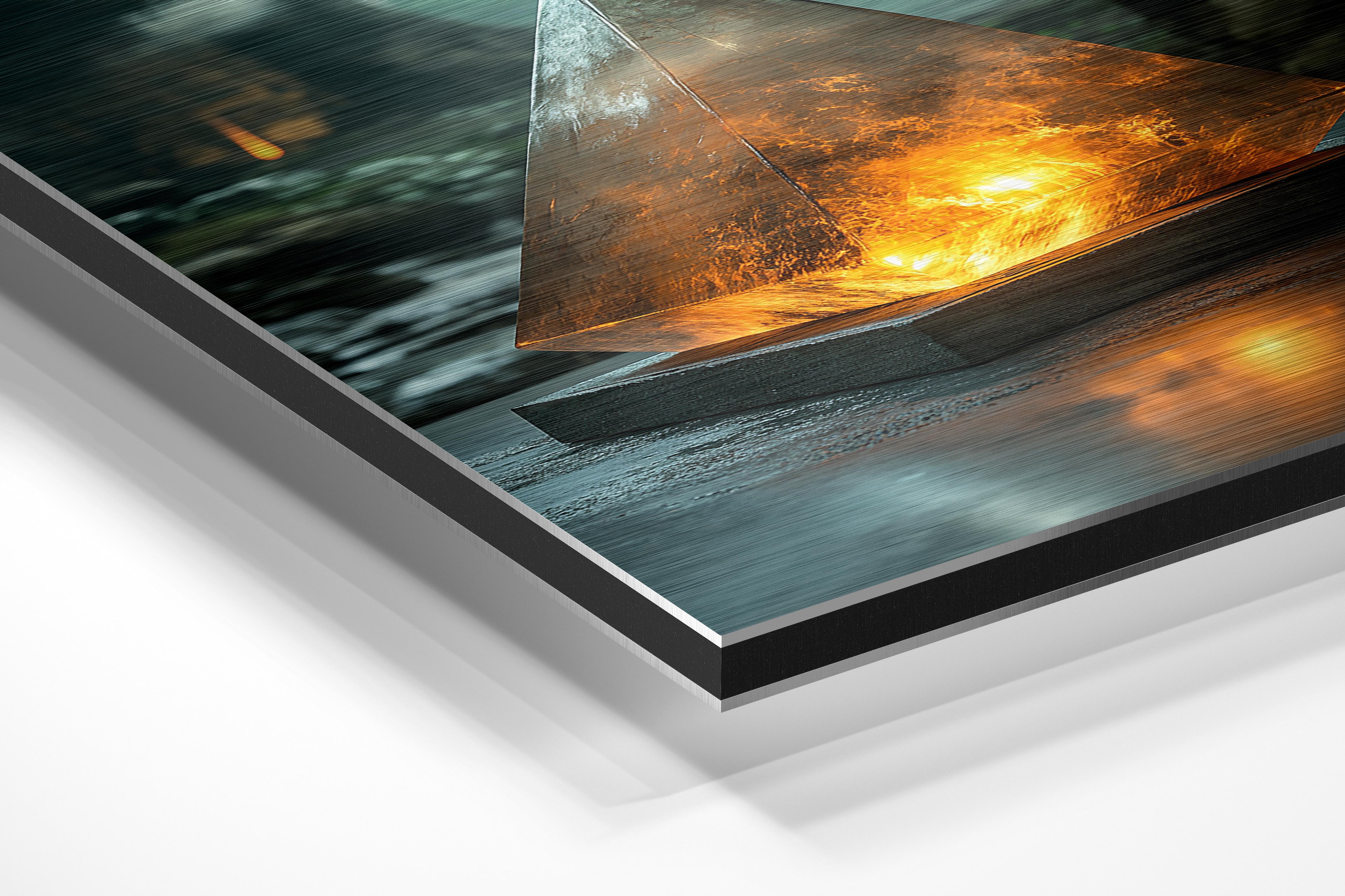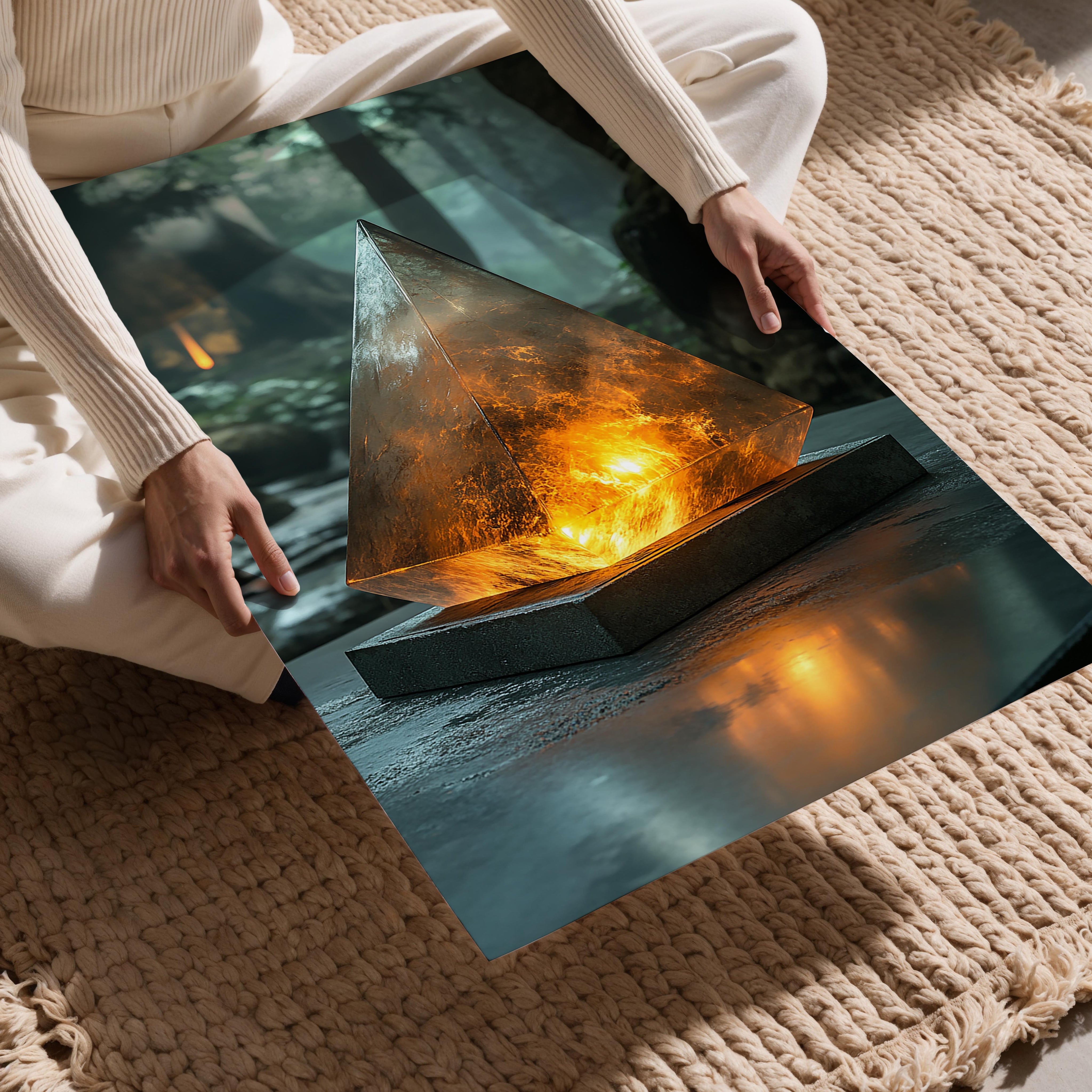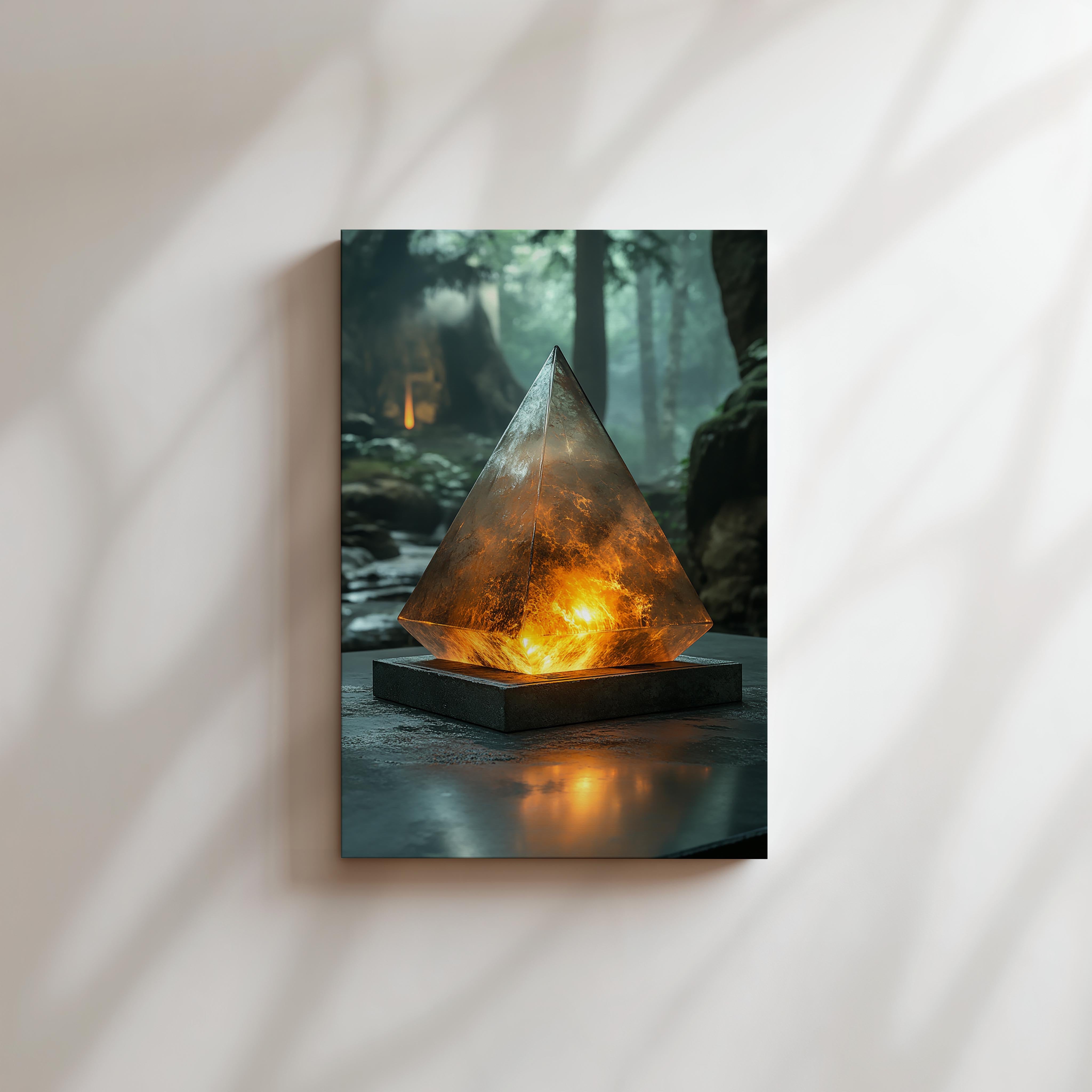 An abstract pyramid glowing with fiery energy, symbolizing ancient power fused with advanced technology. This unique artwork is perfect for concepts exploring mysteries, innovation, or futuristic artifacts in sci-fi or fantasy designs.