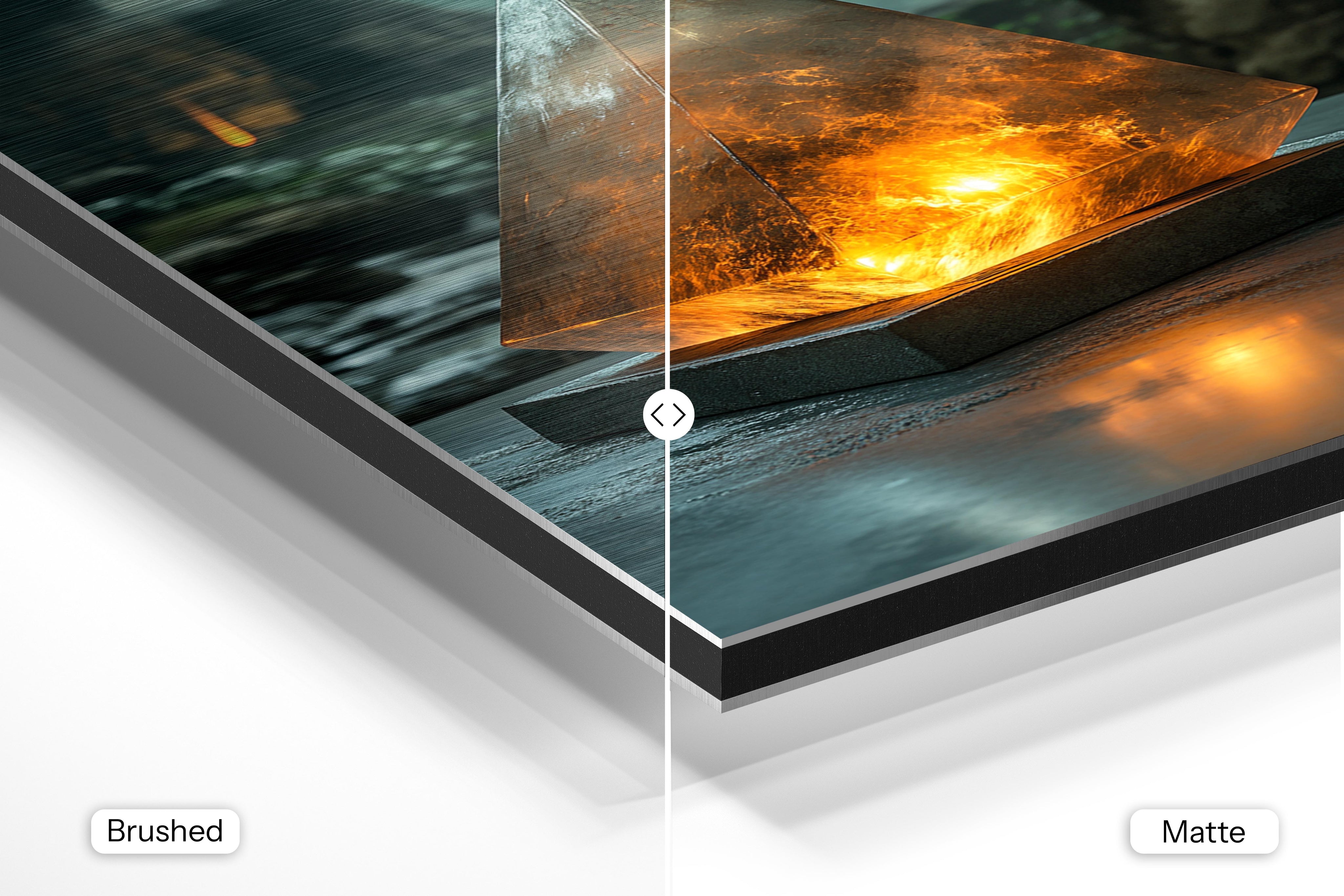 - Brushed Aluminum, on the other hand, features a raw metallic texture with visible brush strokes. Whites and highlights in your image let the silver surface show through, adding a dramatic, shimmering effect. Ideal for black-and-white images, minimalist designs, or abstract art, it creates a bold, industrial vibe with a modern edge.