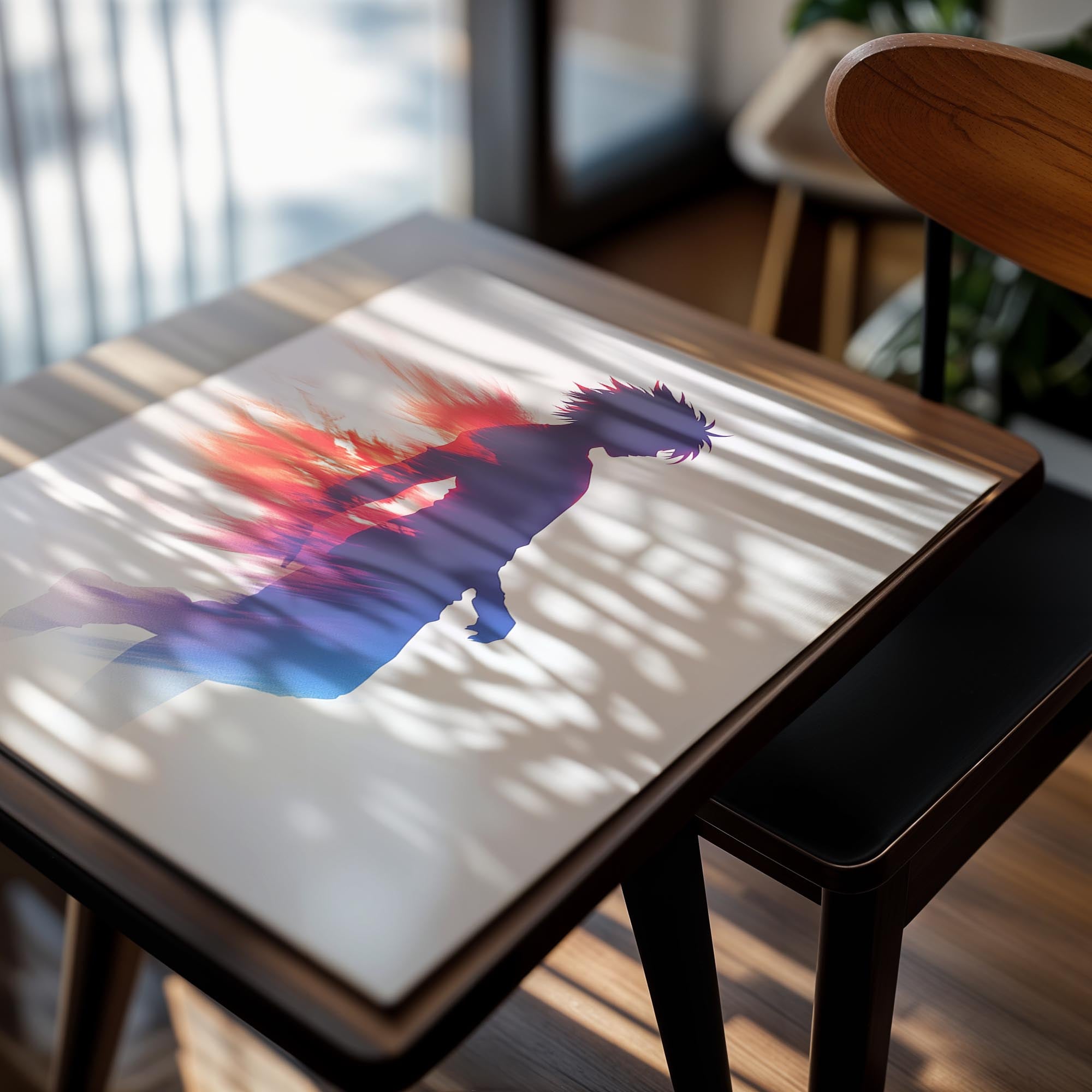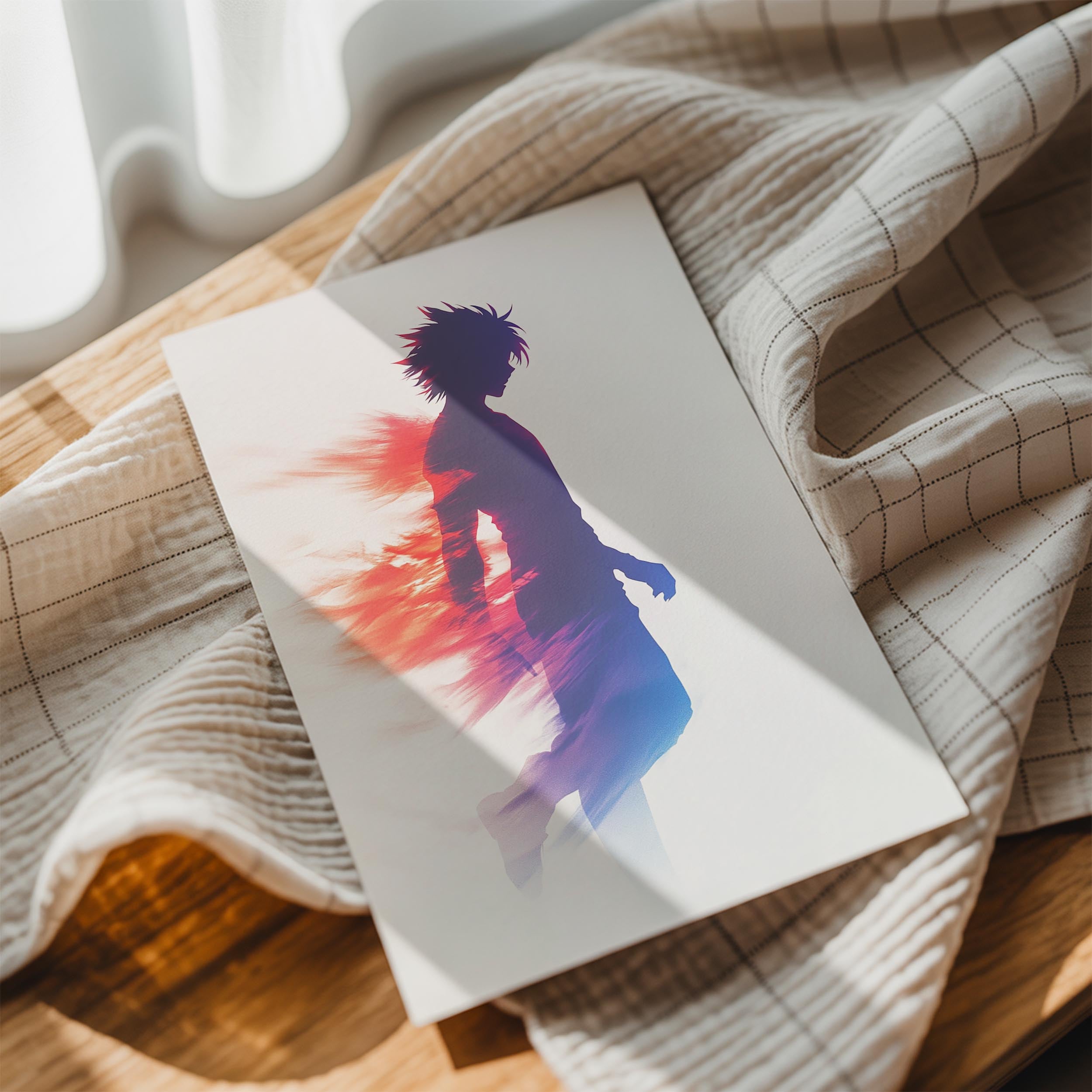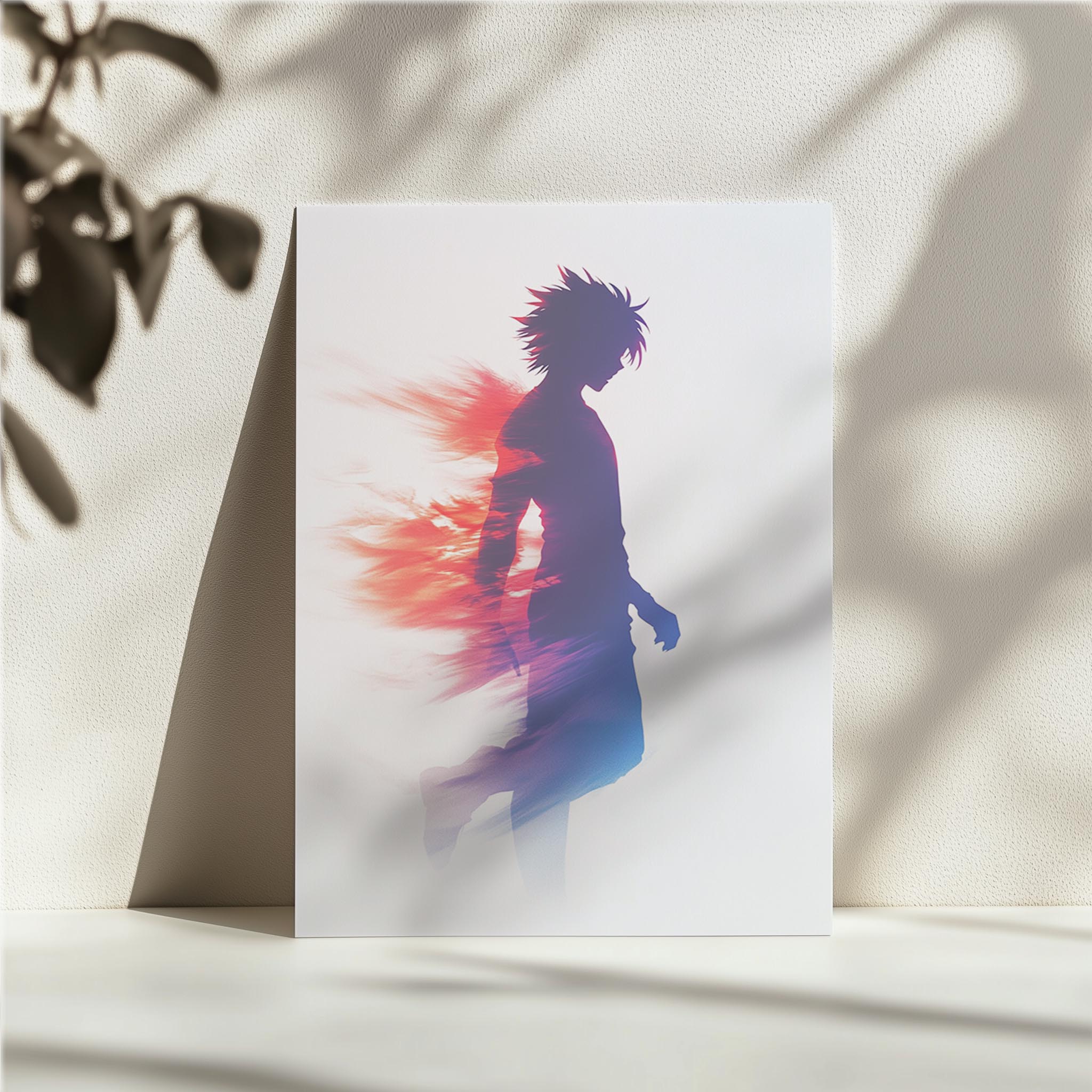 This dynamic image portrays a lone figure with fiery red and cool blue streaks blending into their form, symbolizing inner strength and emotional balance. The vivid contrast between the hues creates an eye-catching focal point. The shadowed posture and flame-like textures add depth and mystery to the artwork. Ideal for a contemporary setting, this piece resonates with themes of individuality, transformation, and determination. Its energy would elevate any creative workspace or modern home environment, offering both aesthetic and symbolic value.