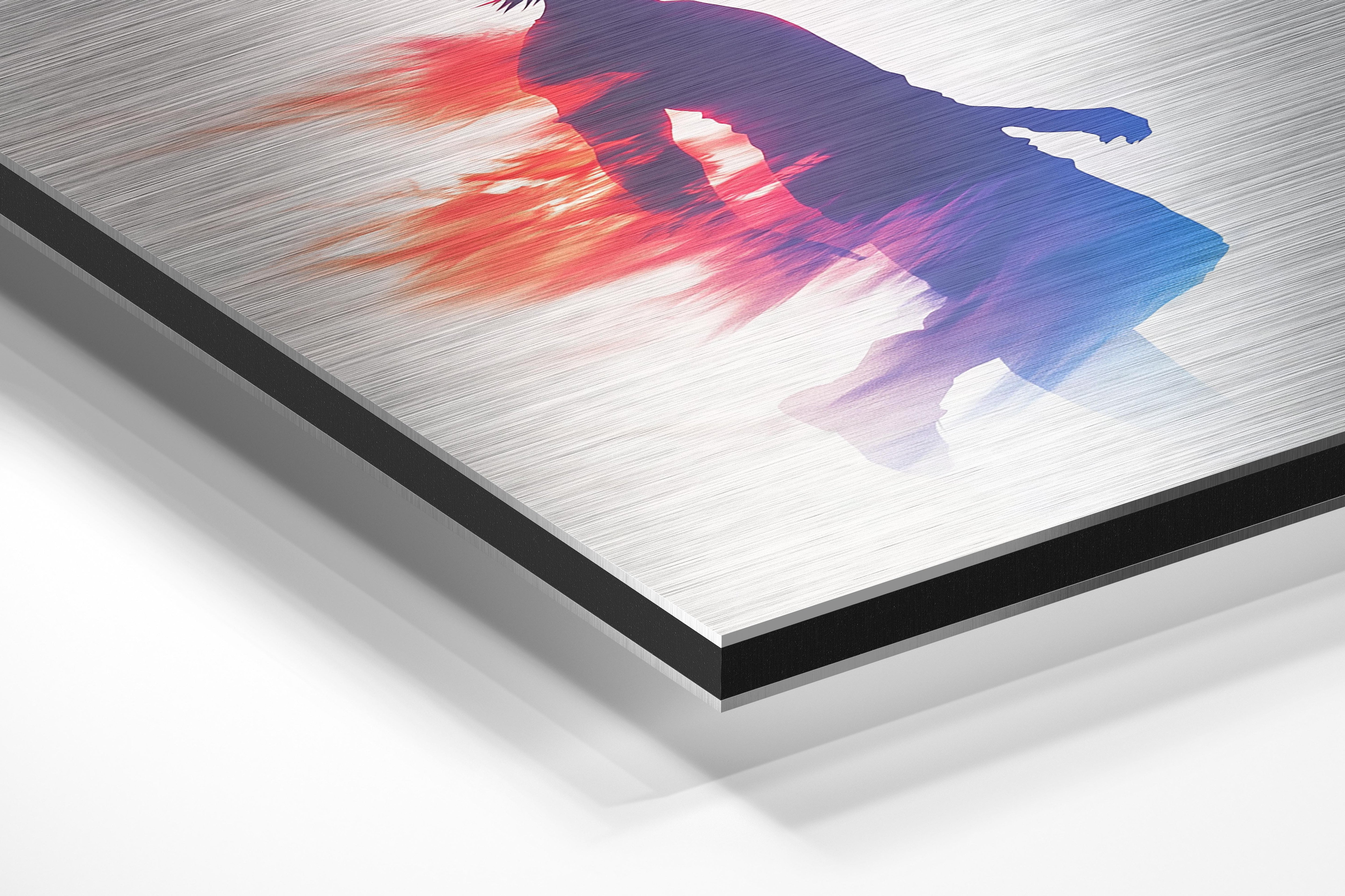 - Brushed Aluminum, on the other hand, features a raw metallic texture with visible brush strokes. Whites and highlights in your image let the silver surface show through, adding a dramatic, shimmering effect. Ideal for black-and-white images, minimalist designs, or abstract art, it creates a bold, industrial vibe with a modern edge.