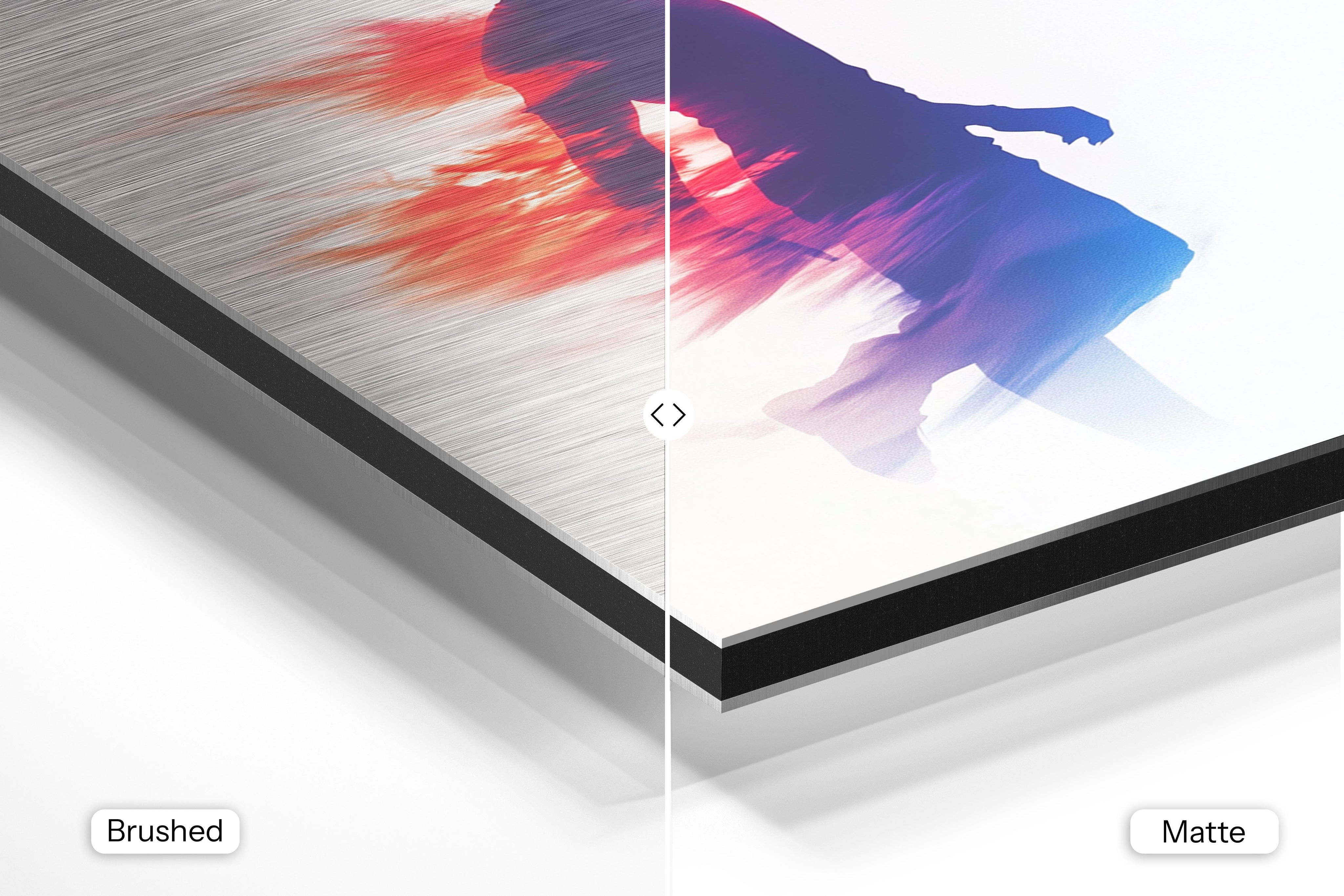 - Matte Aluminum offers a smooth, bright white surface that delivers crisp details and vibrant, true-to-life colors. With its non-reflective finish and subtle silky sheen, it’s perfect for photography, portraits, and colorful artwork—bringing a clean, polished look to any interior.