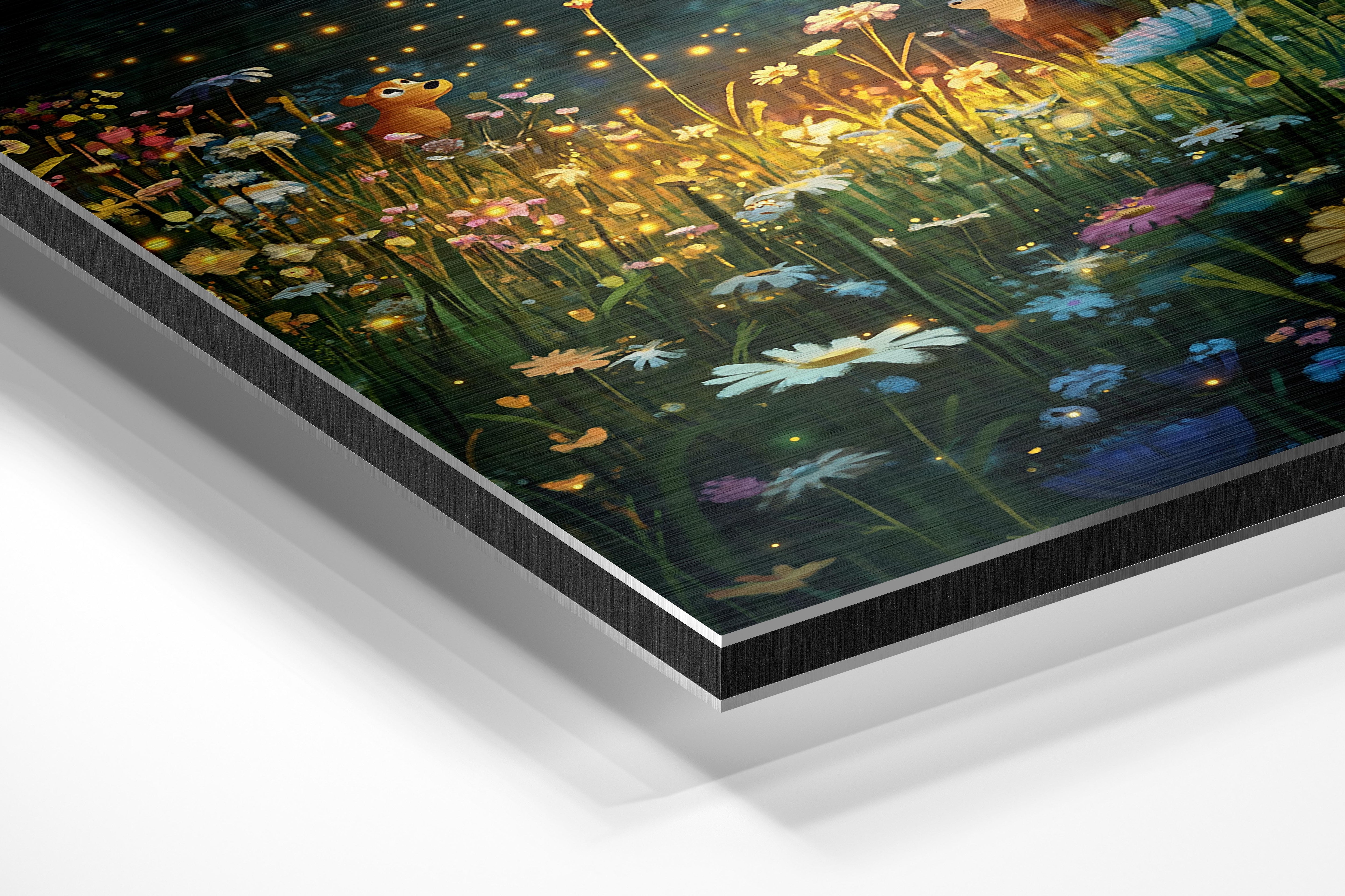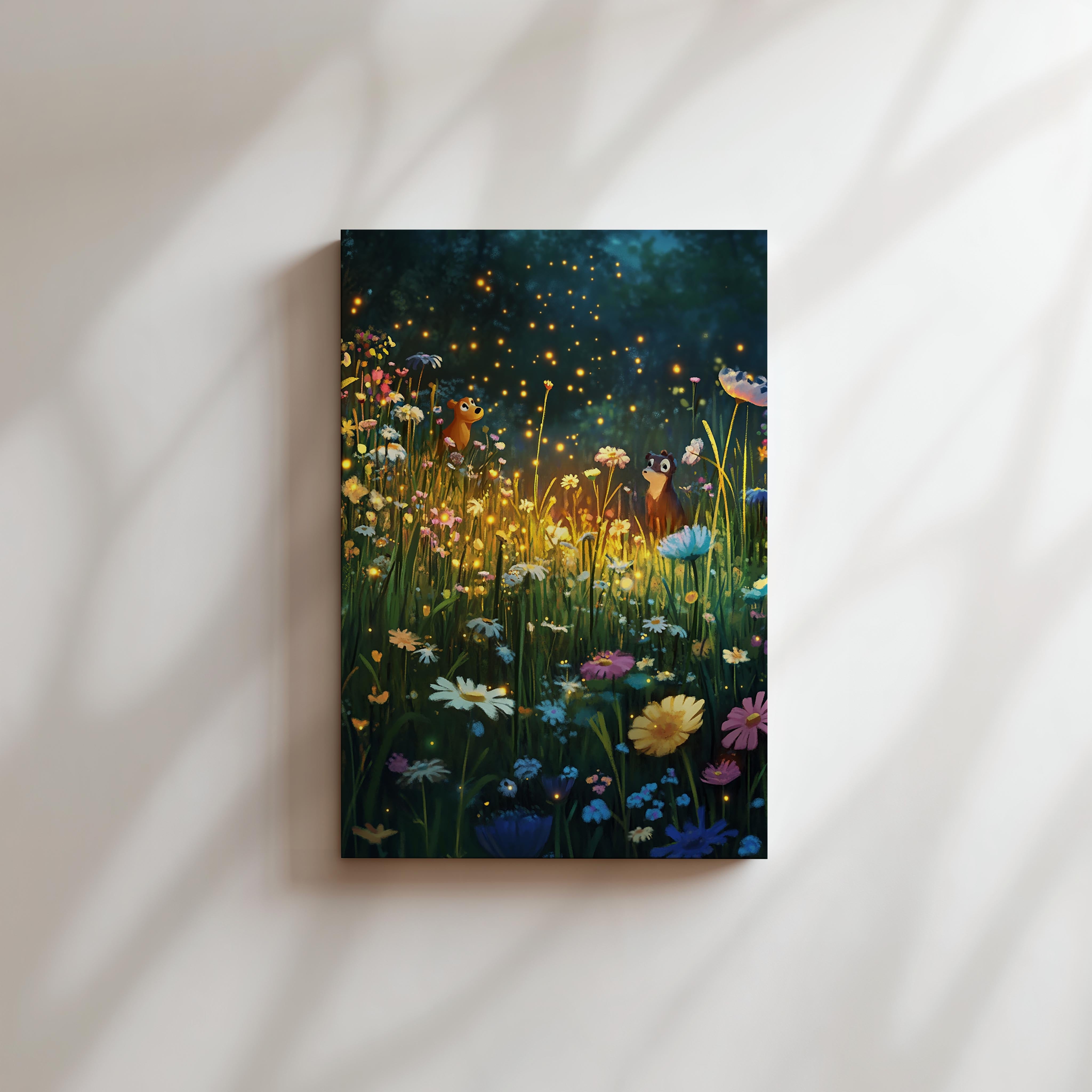 This enchanting scene captures a glowing field of wildflowers illuminated by countless fireflies. The soft, radiant light creates a magical, dreamlike atmosphere, while the detailed flowers add depth and beauty to the composition. Two woodland creatures peek through the blooms, adding charm and storytelling potential. Perfect for nature-themed decor or spaces designed for relaxation and imagination, this piece brings a sense of peace and wonder into any room.