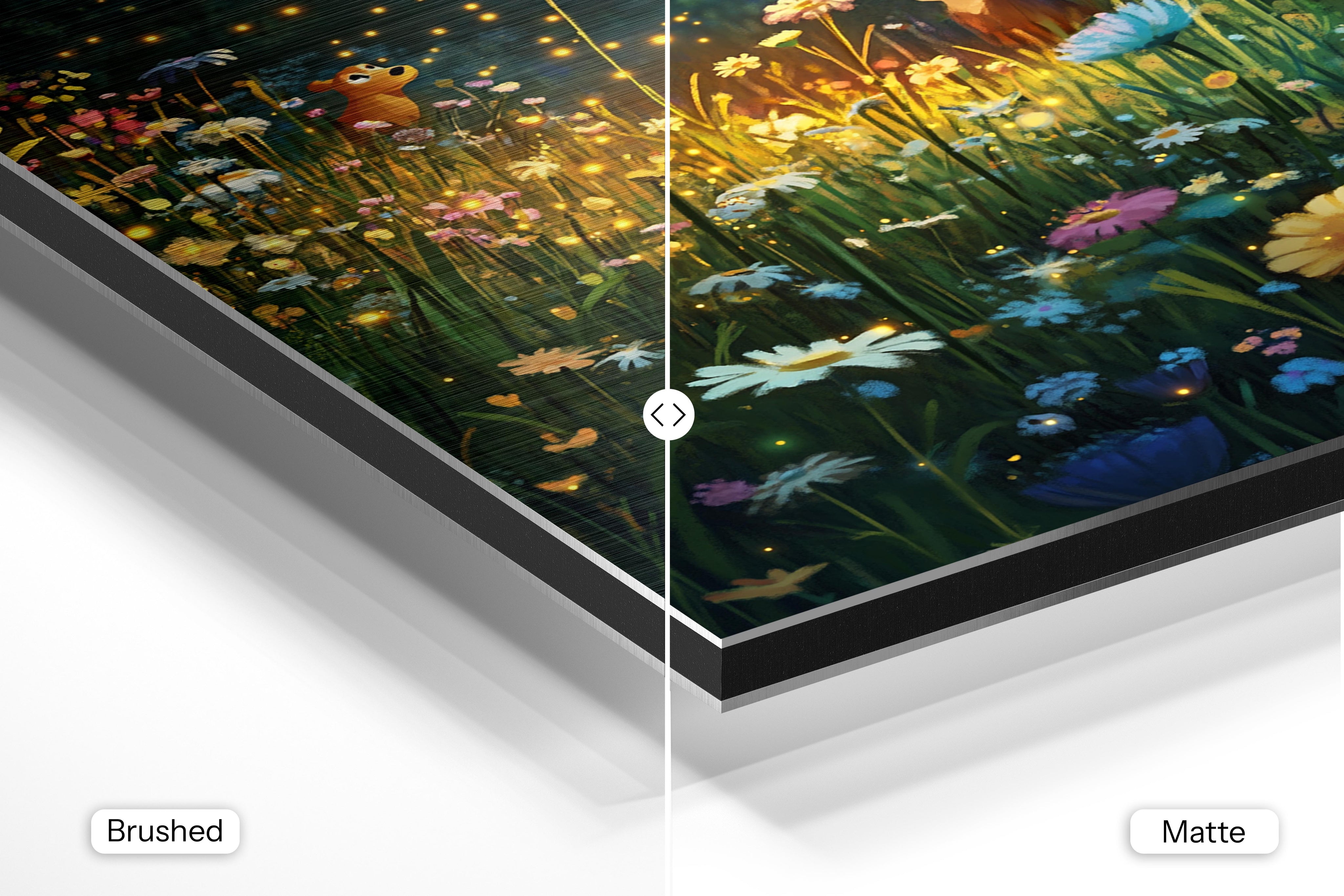 - Matte Aluminum offers a smooth, bright white surface that delivers crisp details and vibrant, true-to-life colors. With its non-reflective finish and subtle silky sheen, it’s perfect for photography, portraits, and colorful artwork—bringing a clean, polished look to any interior.