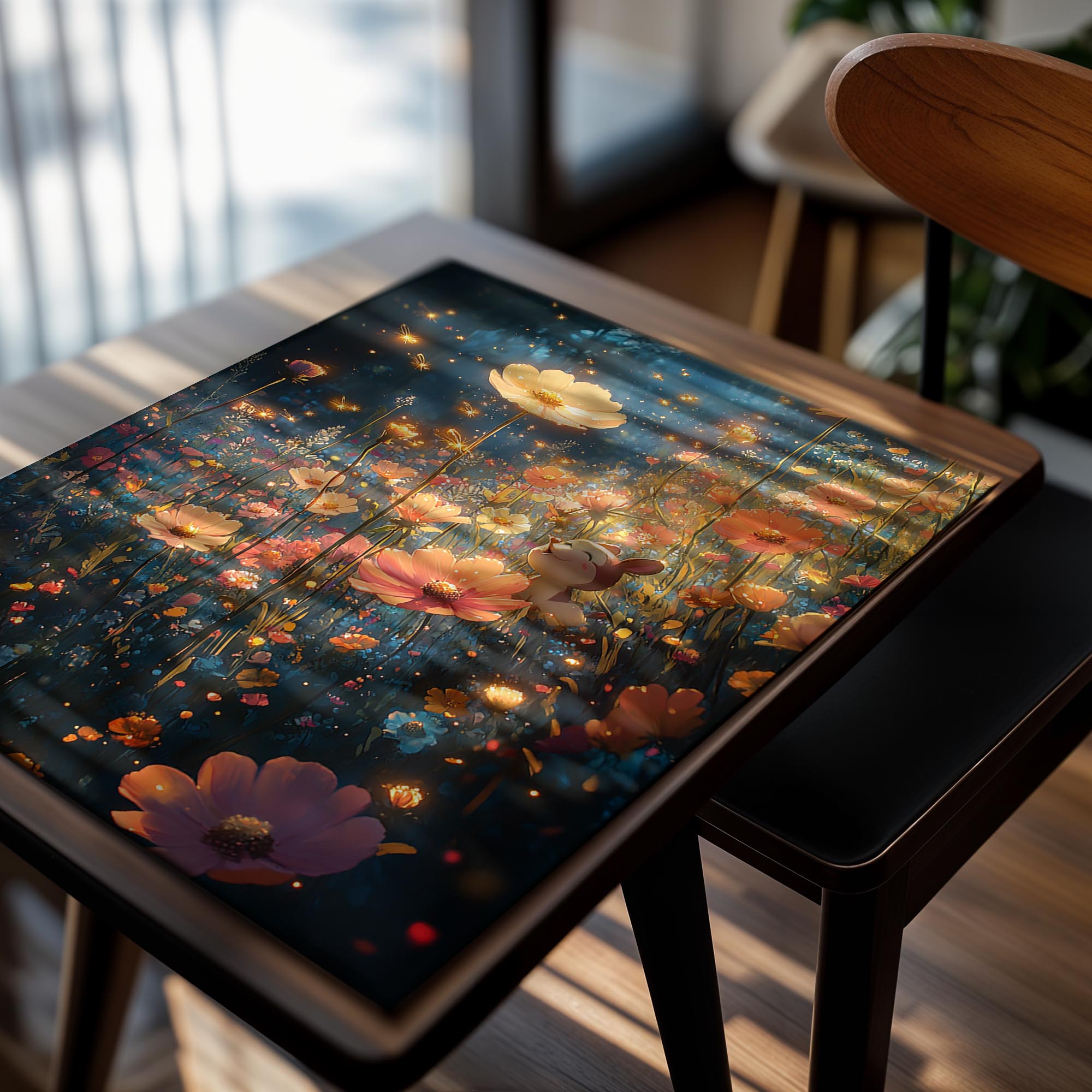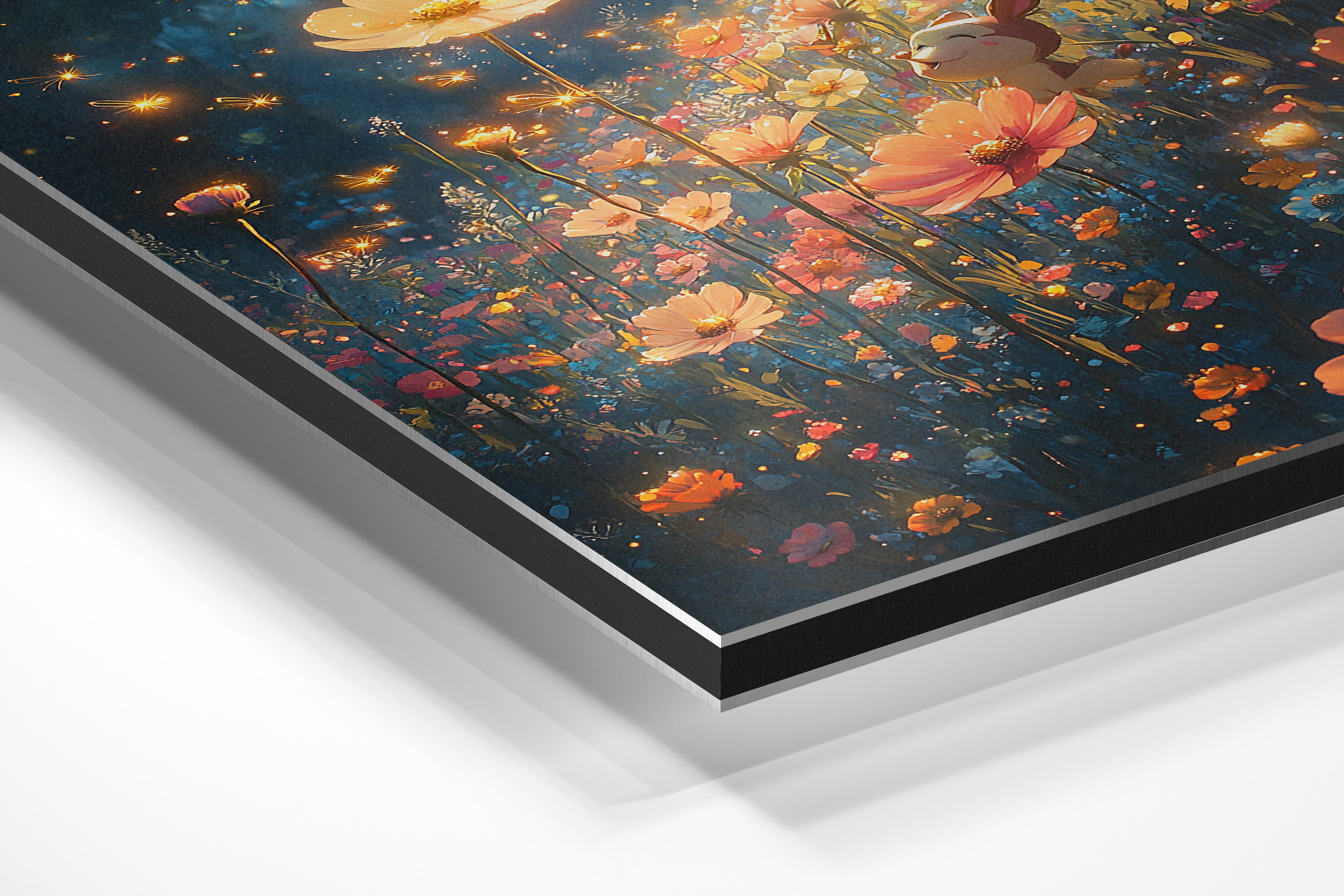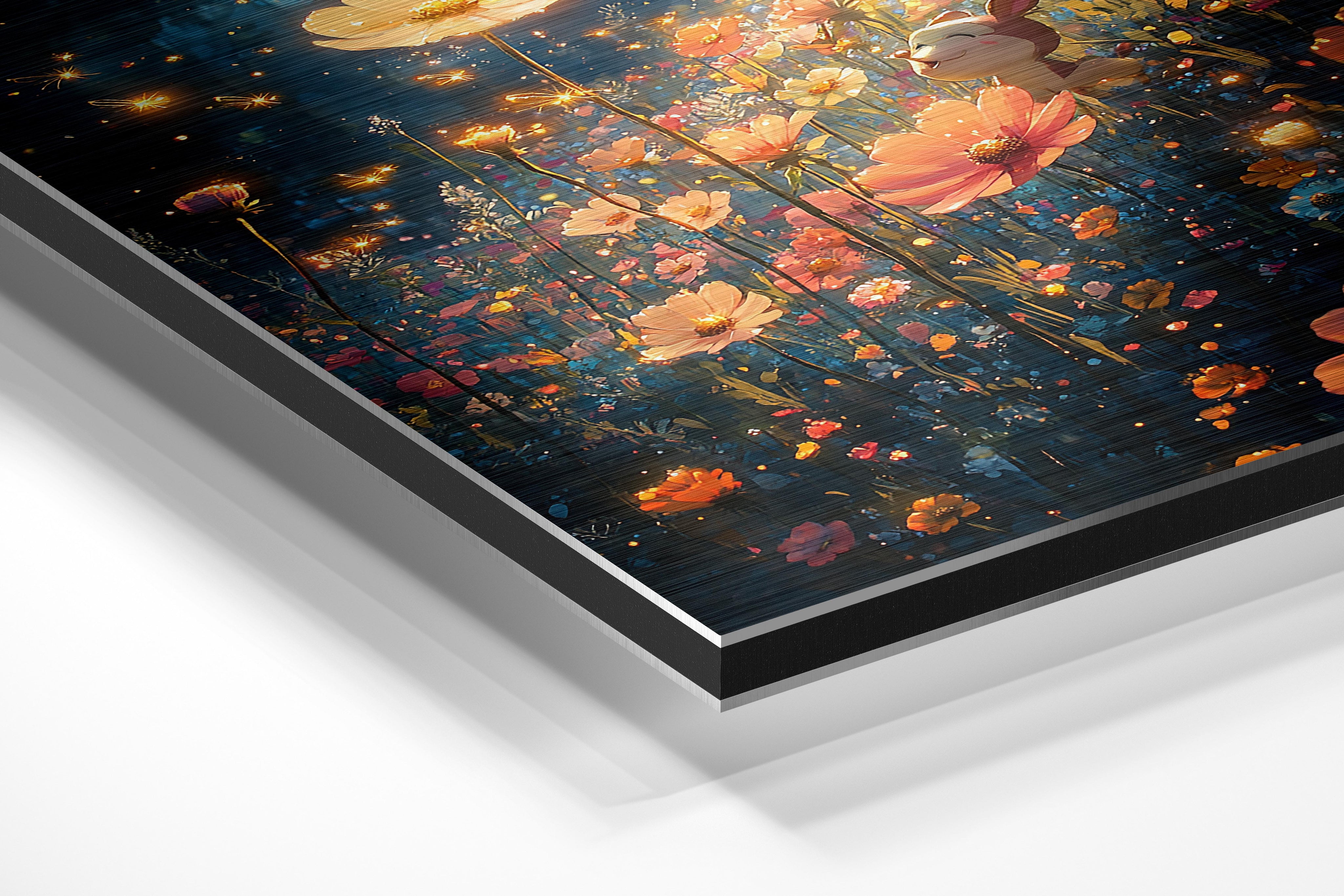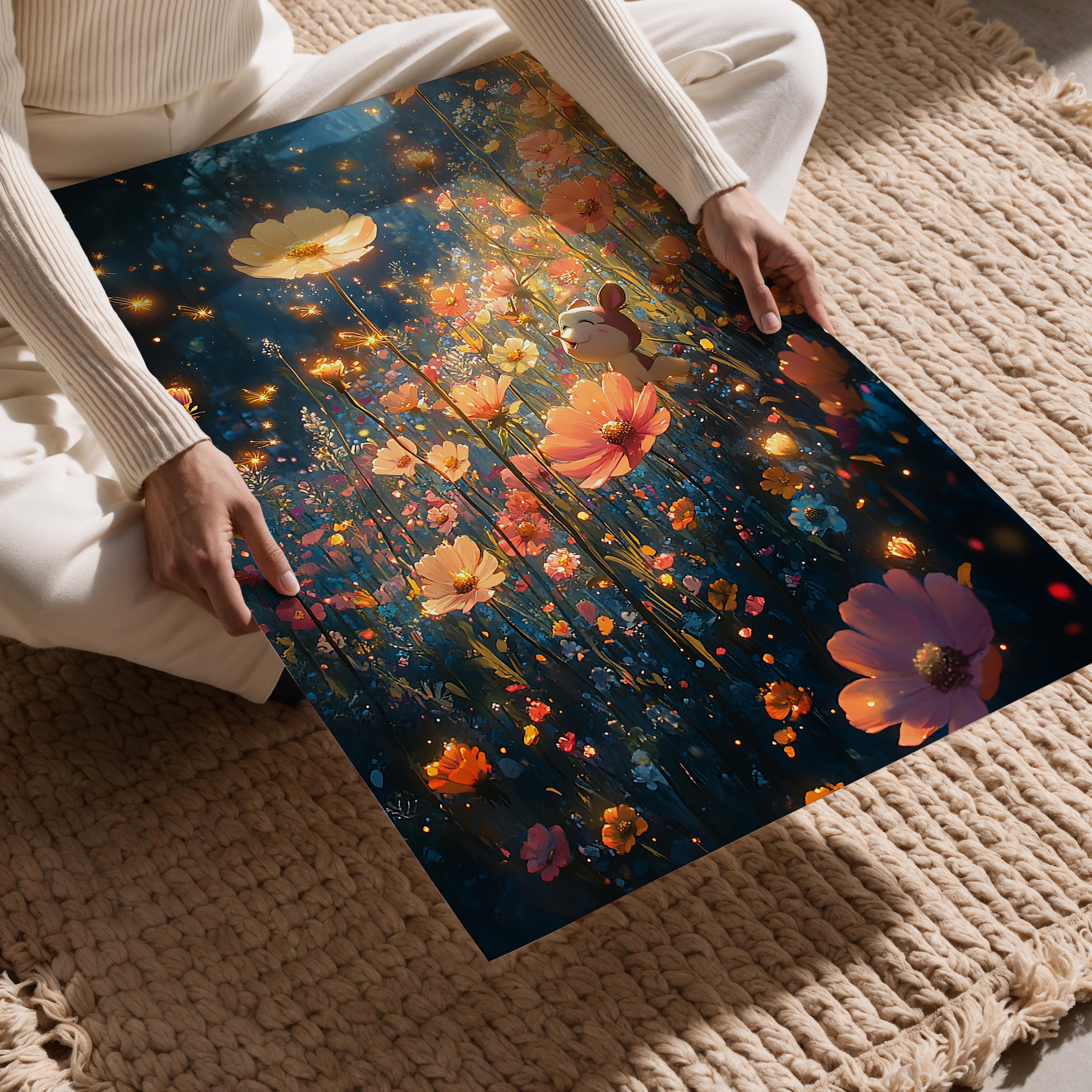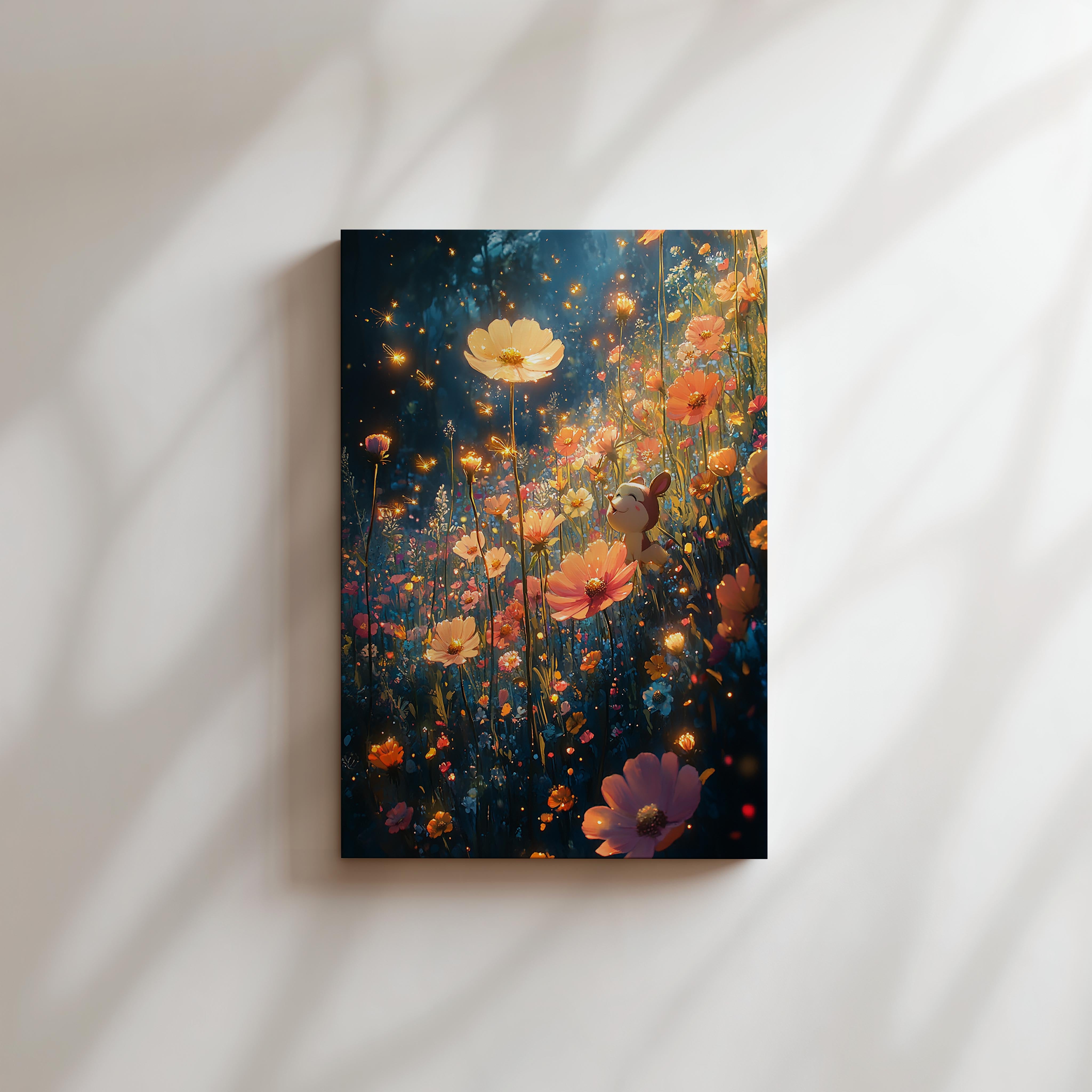 This enchanting artwork features a dreamy meadow filled with colorful flowers and glowing fireflies. A small animal is captured in a moment of pure bliss, basking in the ethereal glow of the scene. The vibrant orange and yellow blooms paired with the twinkling fireflies create a magical, serene atmosphere. This piece is perfect for nature lovers, dreamers, and anyone who seeks to bring warmth and wonder into their living space. Ideal for bedrooms, children’s areas, or tranquil spaces, it is a celebration of the harmony between light and nature.