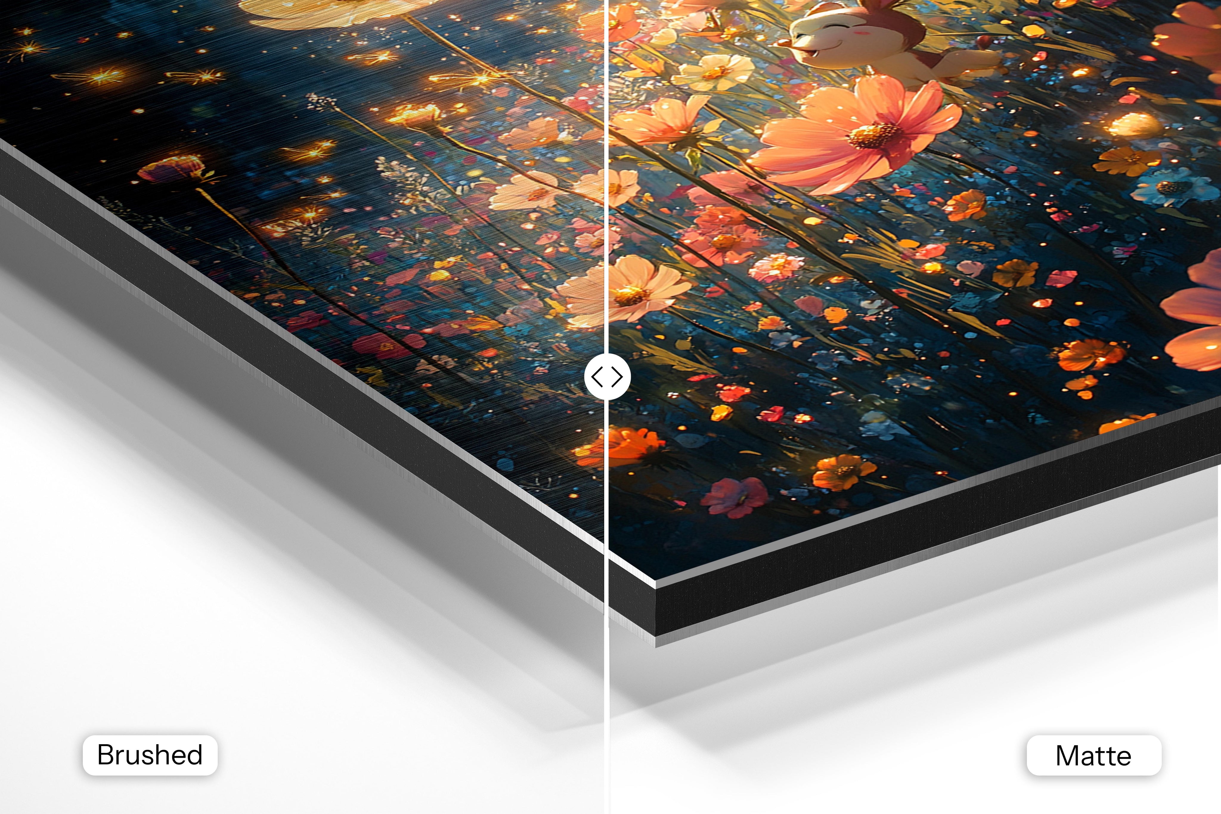 - Brushed Aluminum, on the other hand, features a raw metallic texture with visible brush strokes. Whites and highlights in your image let the silver surface show through, adding a dramatic, shimmering effect. Ideal for black-and-white images, minimalist designs, or abstract art, it creates a bold, industrial vibe with a modern edge.