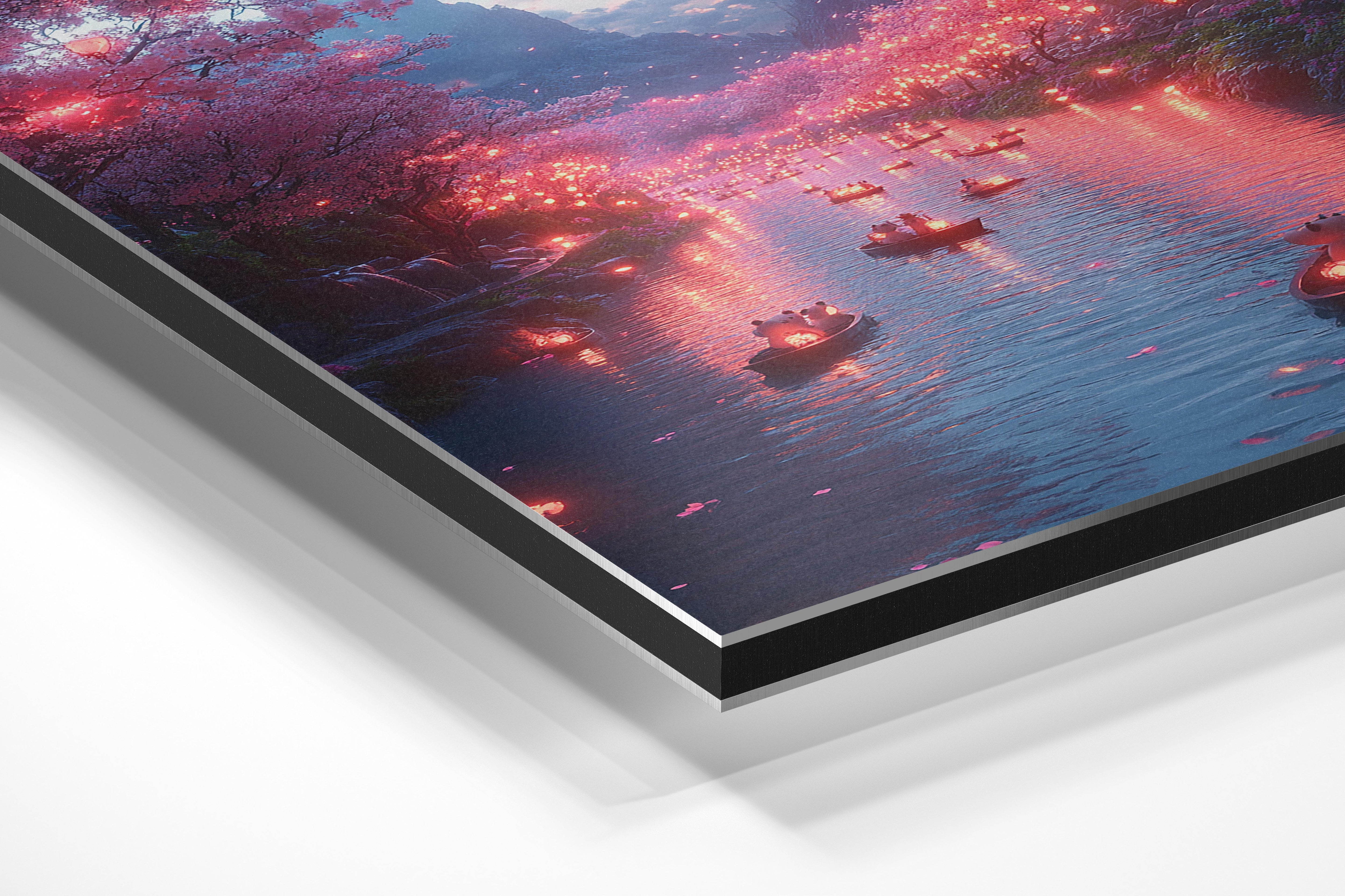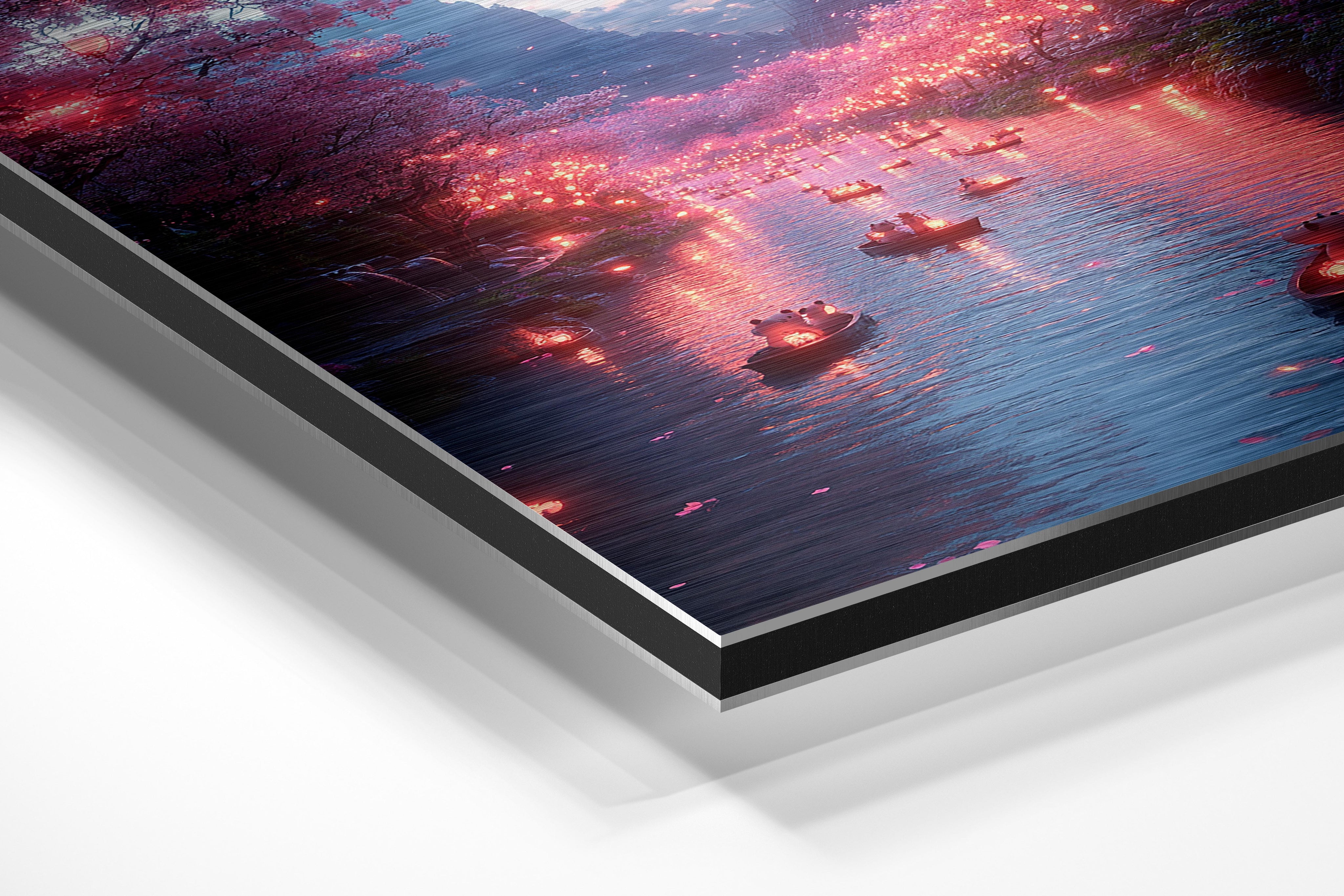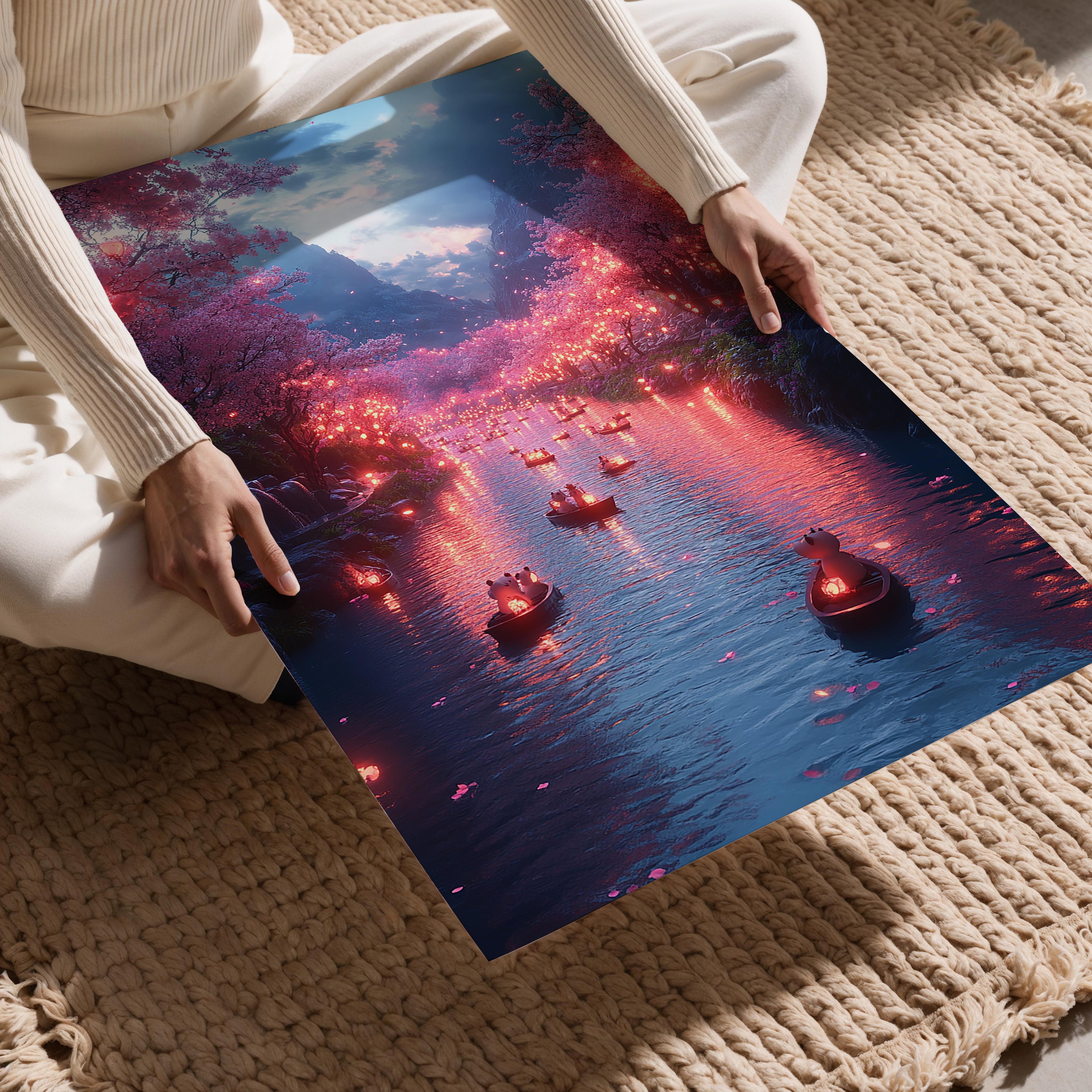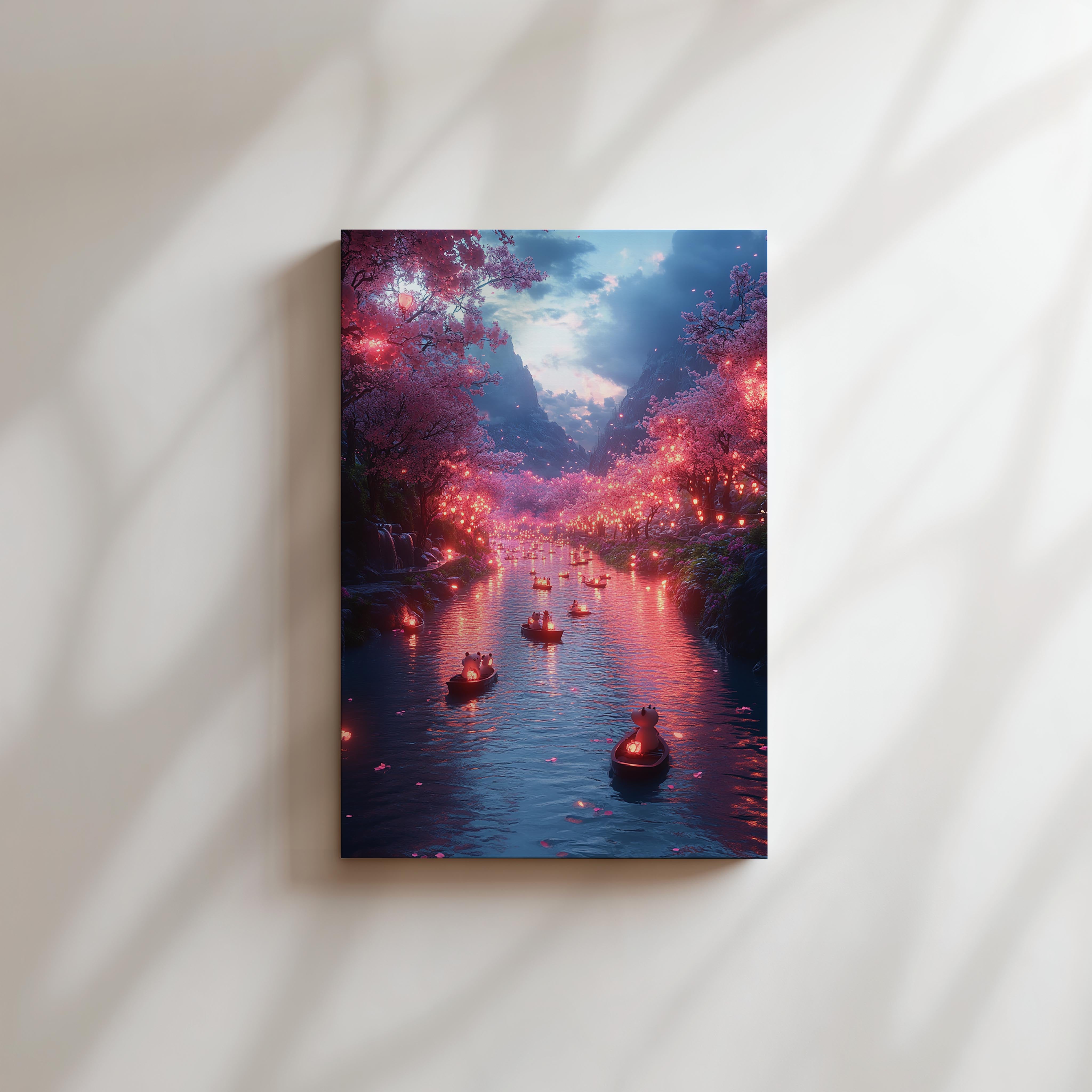 A magical river illuminated by glowing lanterns floating peacefully under cherry blossom trees. The soft light reflects on the water, creating an enchanting atmosphere of celebration and harmony. This piece captures the beauty of cultural traditions and is perfect for spaces designed for relaxation, like bedrooms or meditation rooms. Its gentle hues and intricate details evoke a sense of calm and joy, making it a visually stunning and emotionally resonant addition to any art collection.