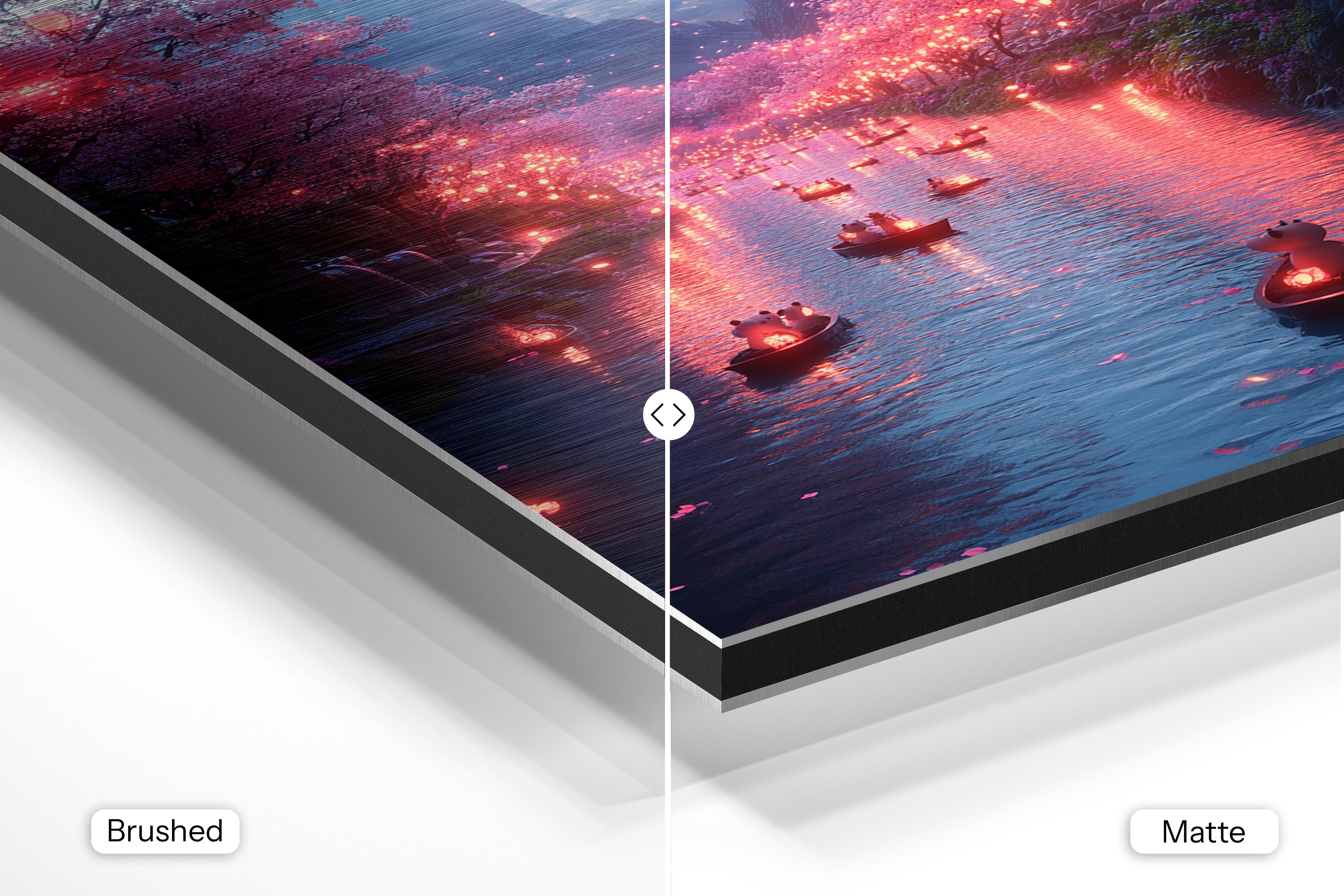 - Brushed Aluminum, on the other hand, features a raw metallic texture with visible brush strokes. Whites and highlights in your image let the silver surface show through, adding a dramatic, shimmering effect. Ideal for black-and-white images, minimalist designs, or abstract art, it creates a bold, industrial vibe with a modern edge.