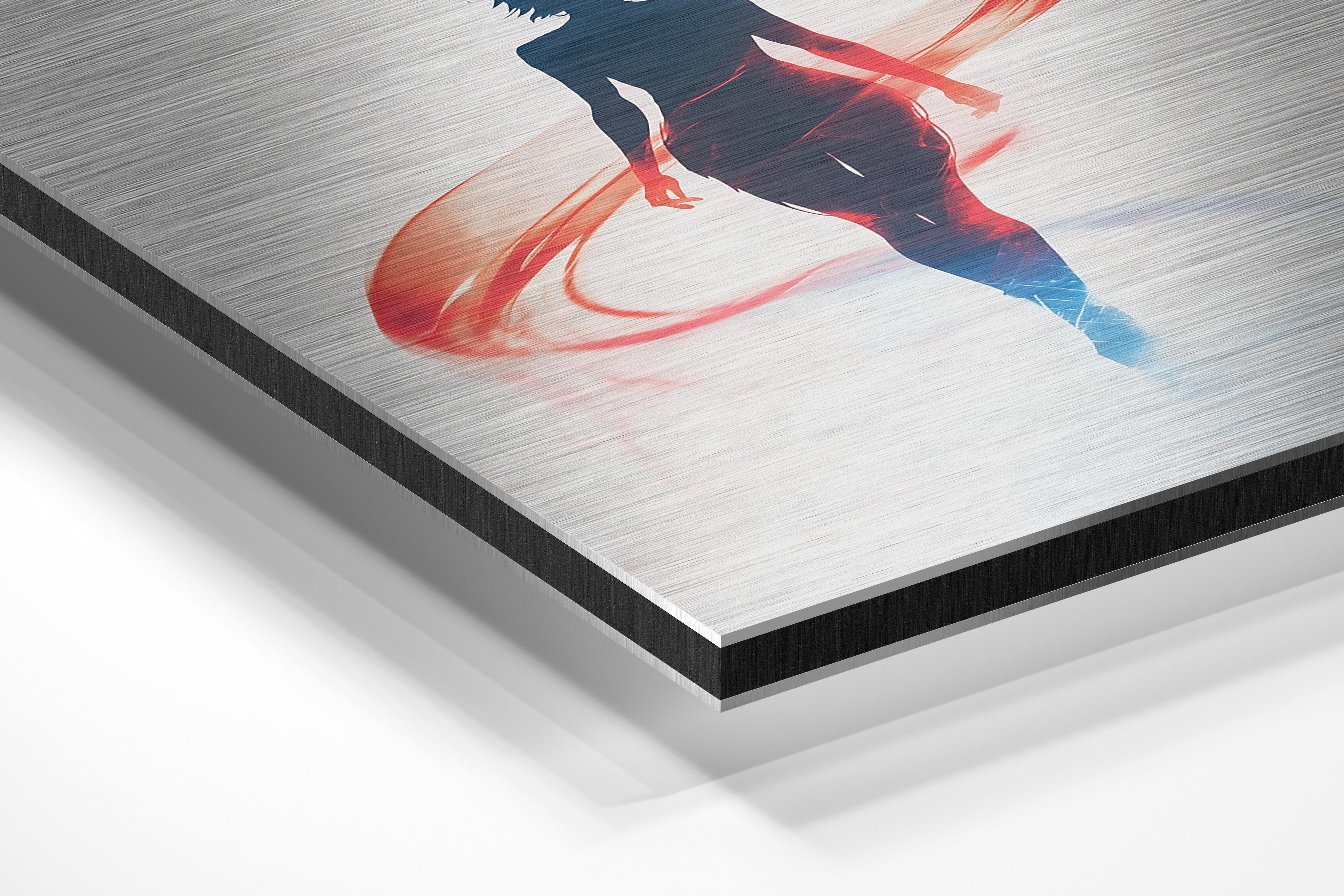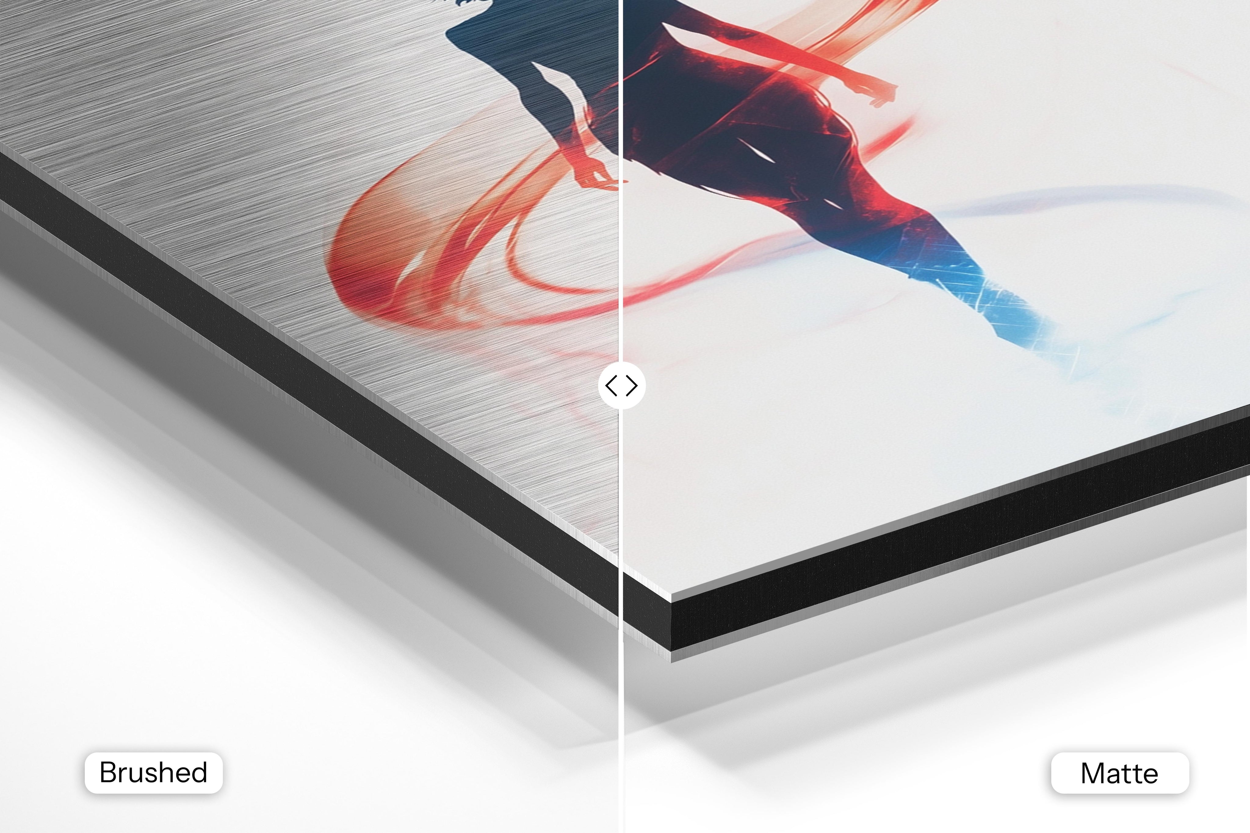 - Brushed Aluminum, on the other hand, features a raw metallic texture with visible brush strokes. Whites and highlights in your image let the silver surface show through, adding a dramatic, shimmering effect. Ideal for black-and-white images, minimalist designs, or abstract art, it creates a bold, industrial vibe with a modern edge.