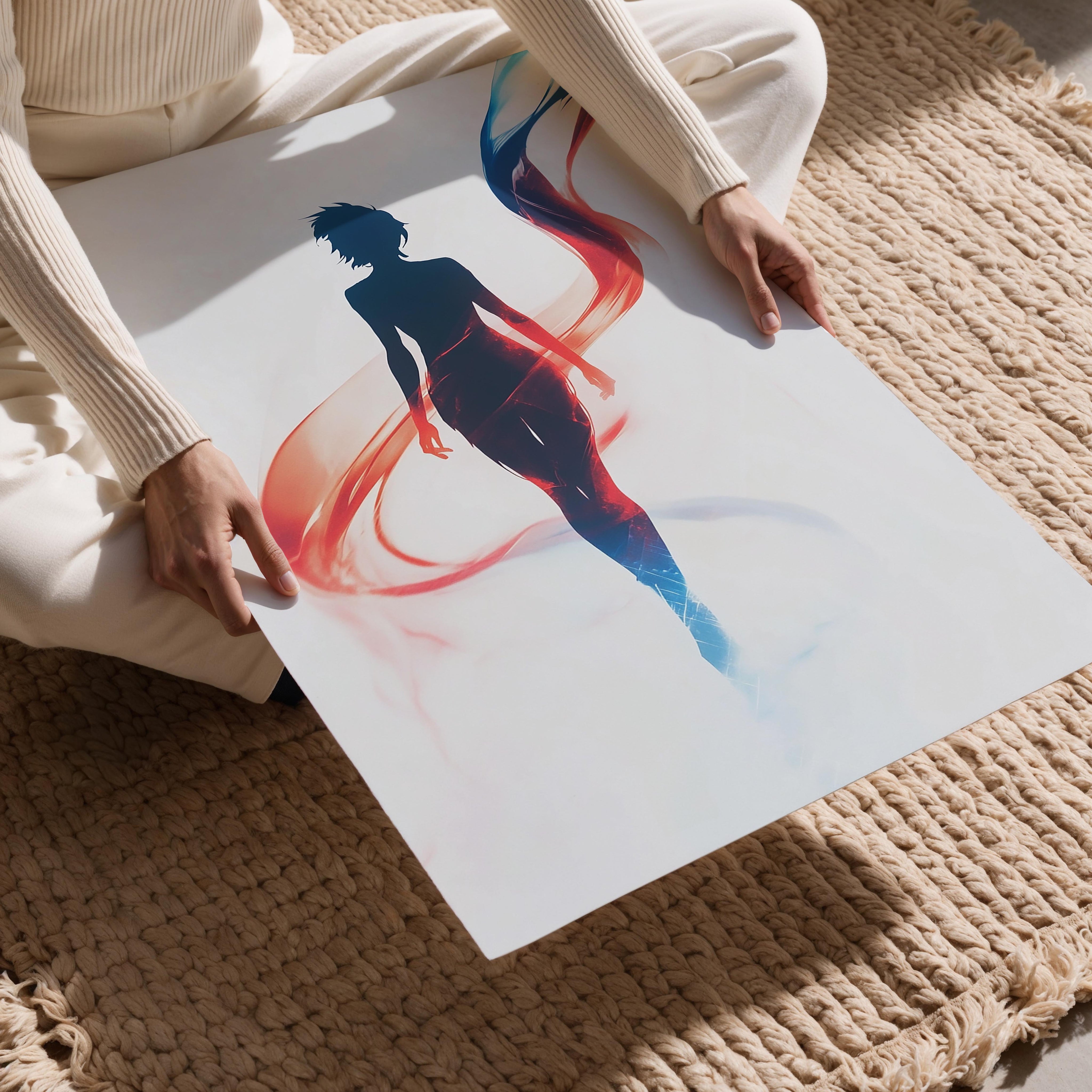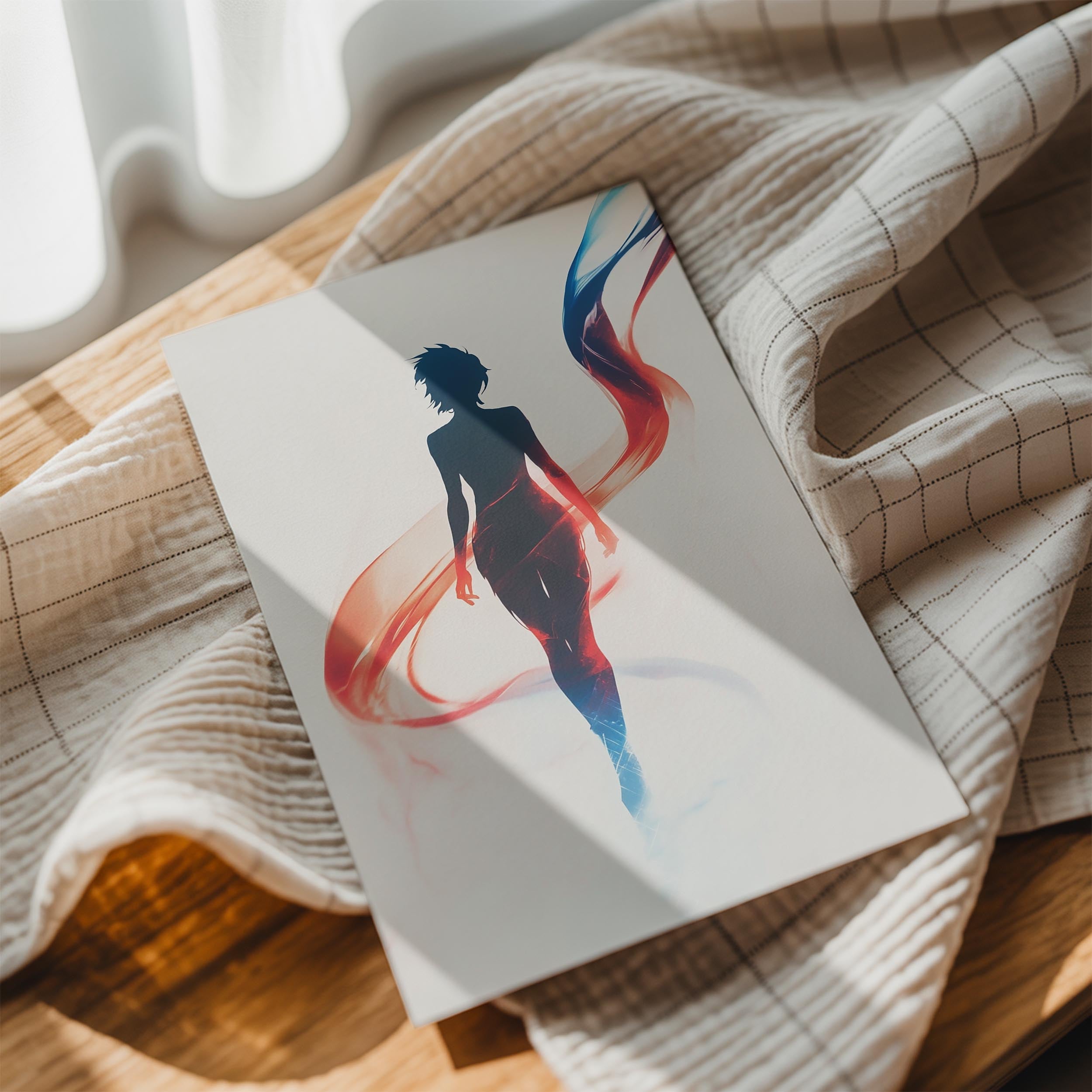 A dynamic silhouette of a figure wrapped in flowing, red and blue light trails. The minimalistic design is both modern and captivating, making it ideal for contemporary interiors or fans of abstract digital artwork. Perfect for inspiring creative and artistic spaces.