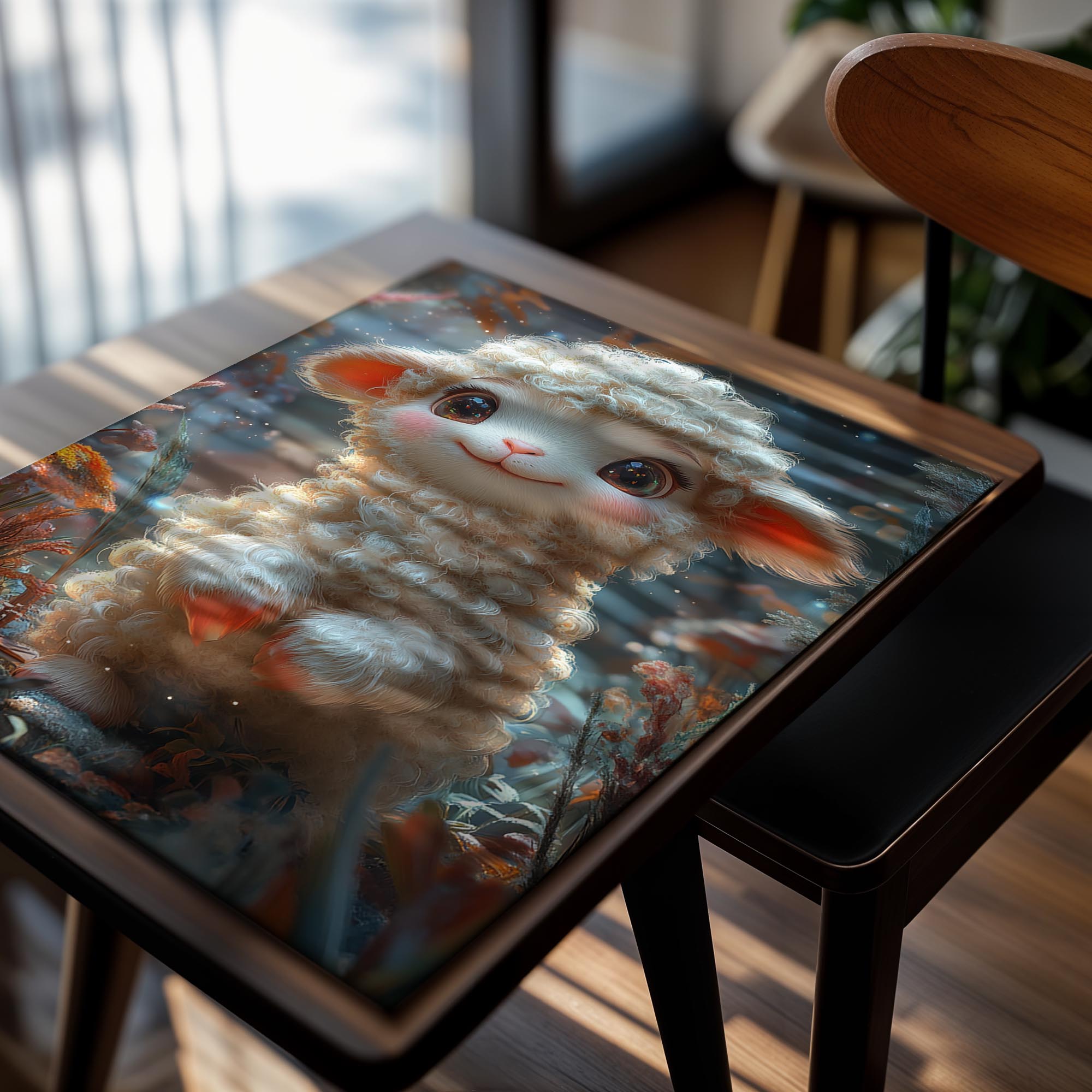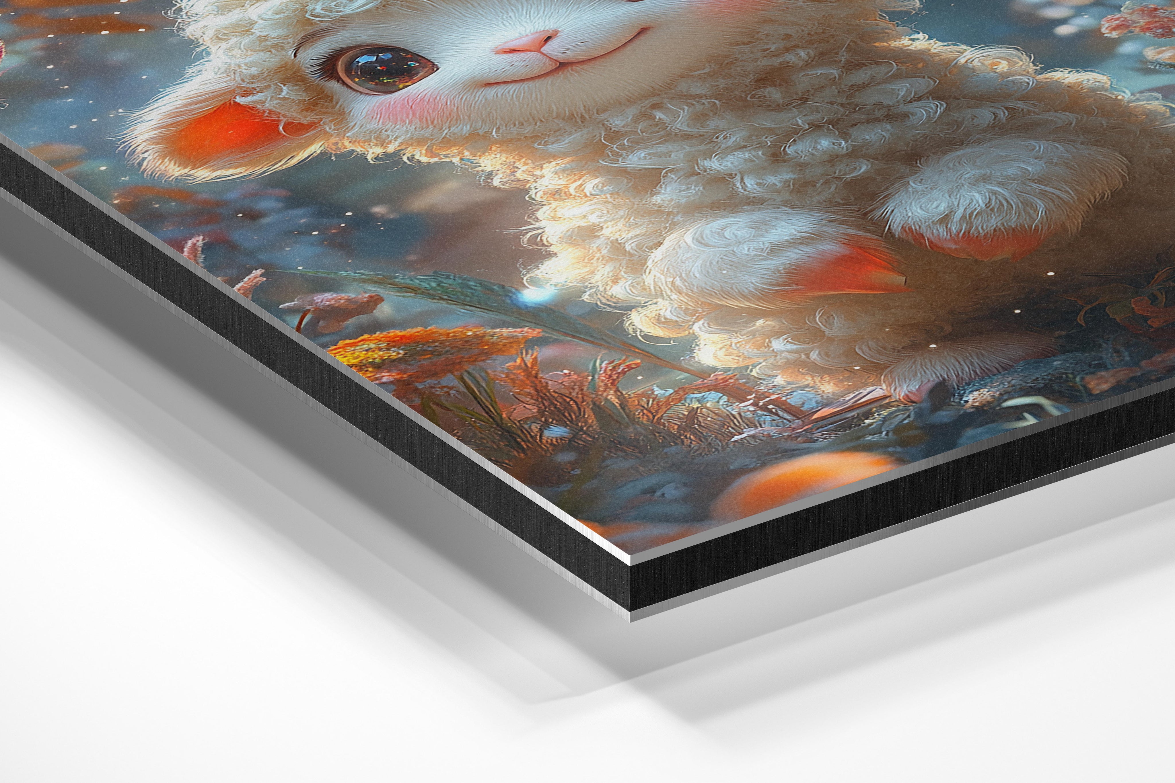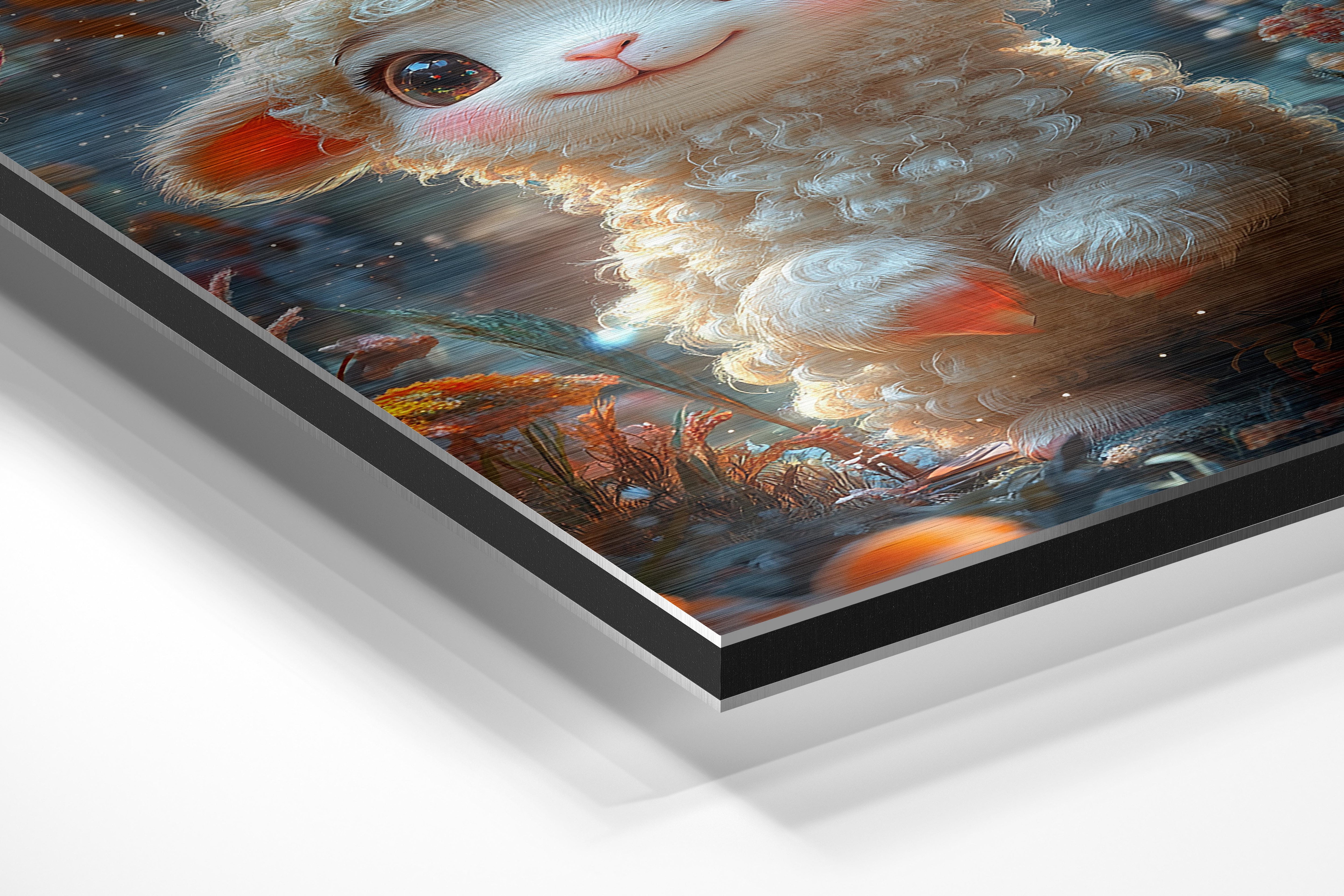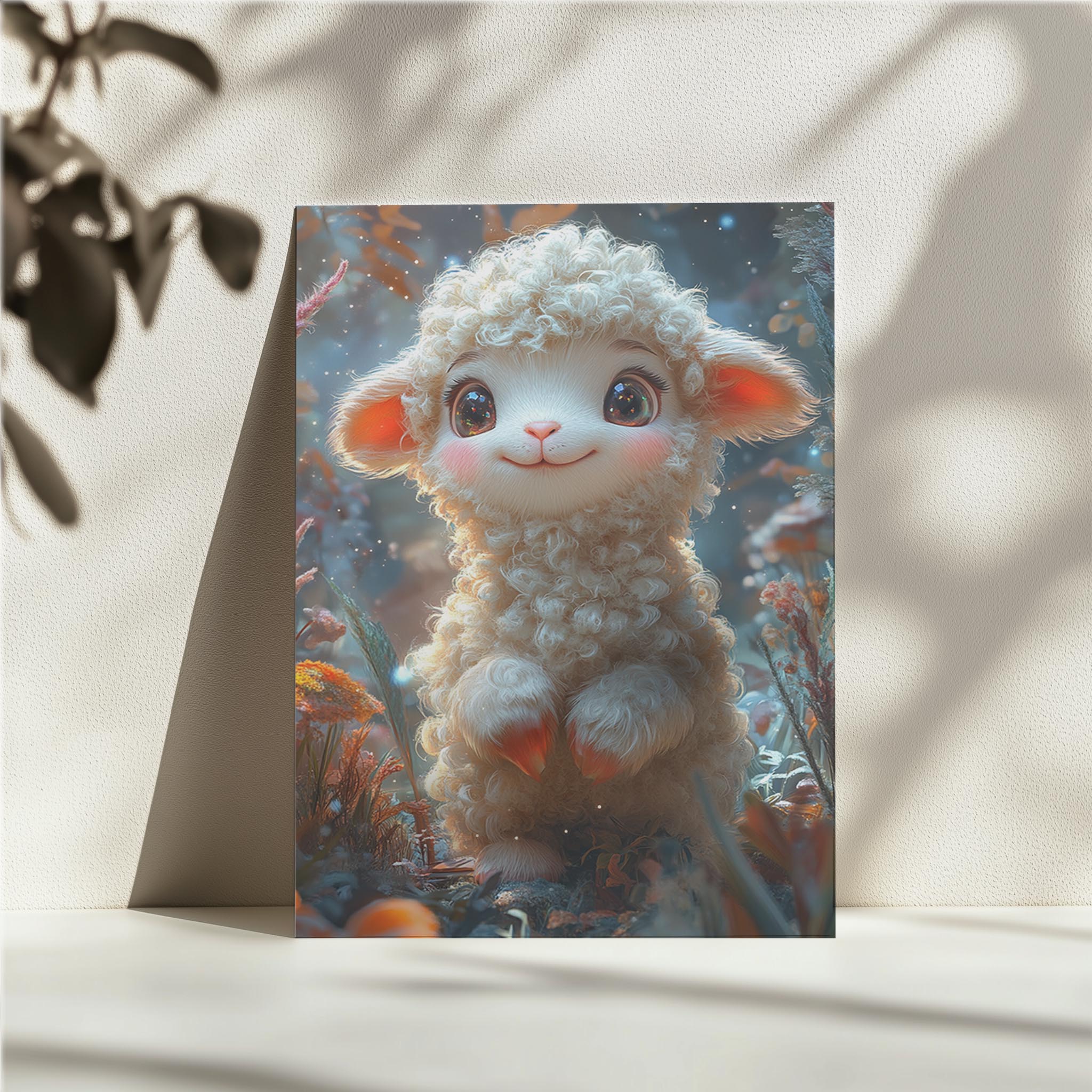 A charming depiction of an adorable, fluffy lamb set in an ethereal, magical meadow. This artwork radiates warmth and tenderness with its soft textures, vibrant hues, and glowing surroundings. The lamb’s sparkling eyes and rosy cheeks make it a captivating centerpiece for a nursery or children's playroom. The fantasy elements, like the glowing vegetation and whimsical lighting, give it a dreamy atmosphere that evokes feelings of serenity and joy, making it a delightful addition to any space needing a touch of wonder.