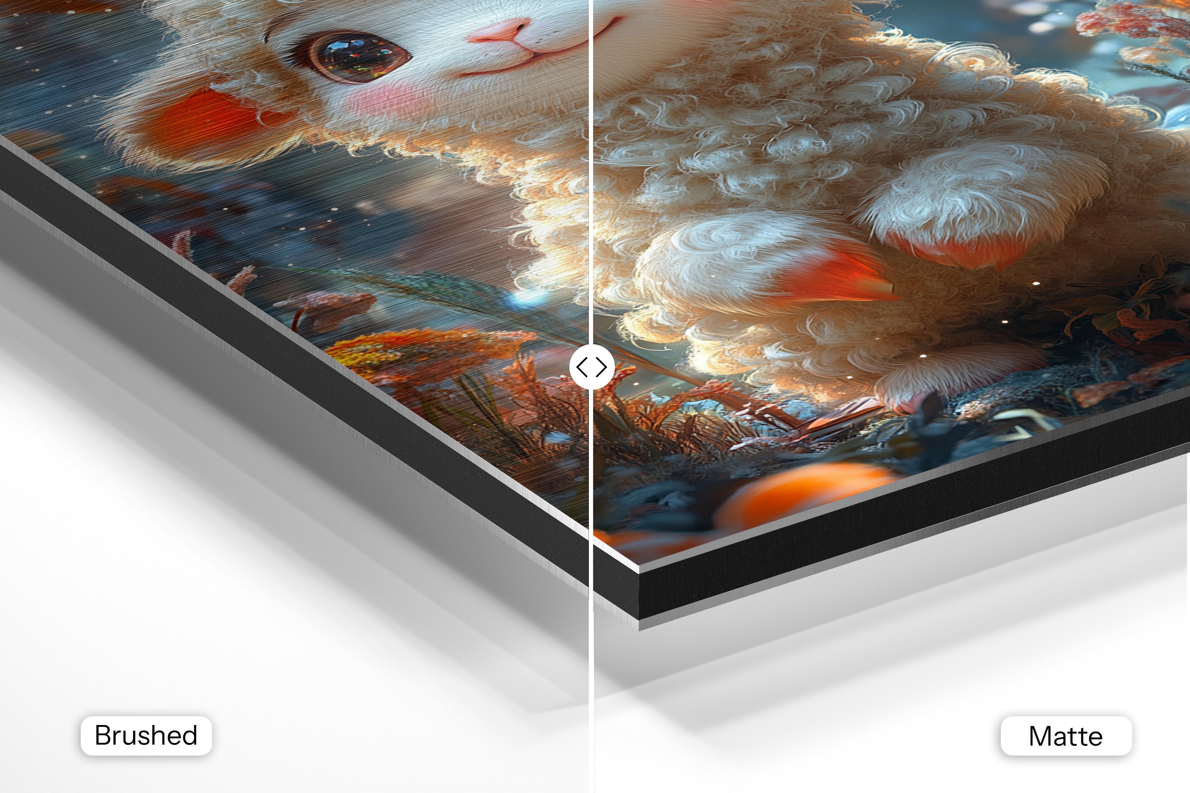 - Brushed Aluminum, on the other hand, features a raw metallic texture with visible brush strokes. Whites and highlights in your image let the silver surface show through, adding a dramatic, shimmering effect. Ideal for black-and-white images, minimalist designs, or abstract art, it creates a bold, industrial vibe with a modern edge.