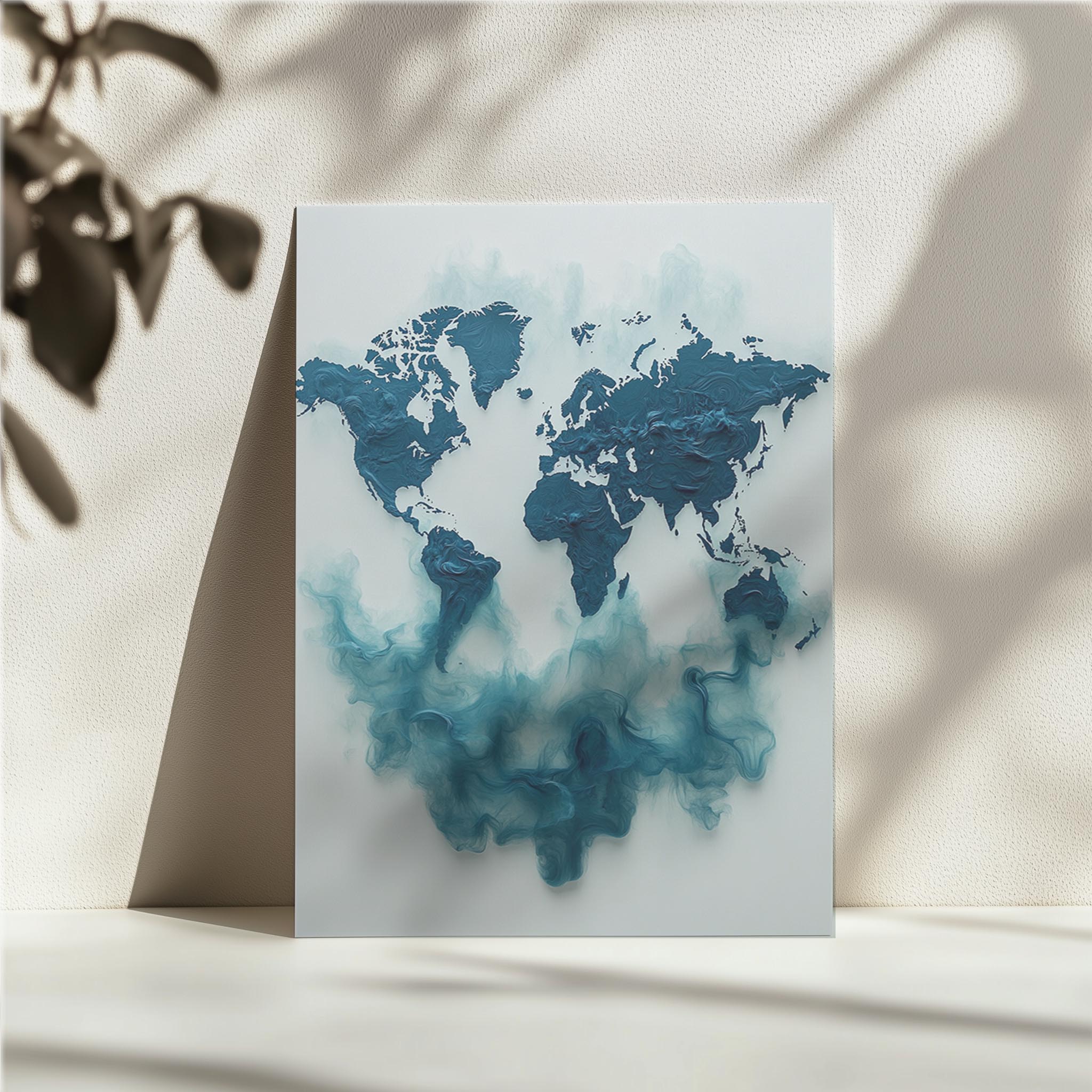 This visually striking artwork showcases the world map with fluid, textured swirls that extend beyond the continents. The three-dimensional effect adds depth and movement, making it a captivating piece for modern interiors, galleries, or offices. Its vibrant blue palette is refreshing and engaging, fitting perfectly into creative spaces or as a conversation starter in meeting rooms.