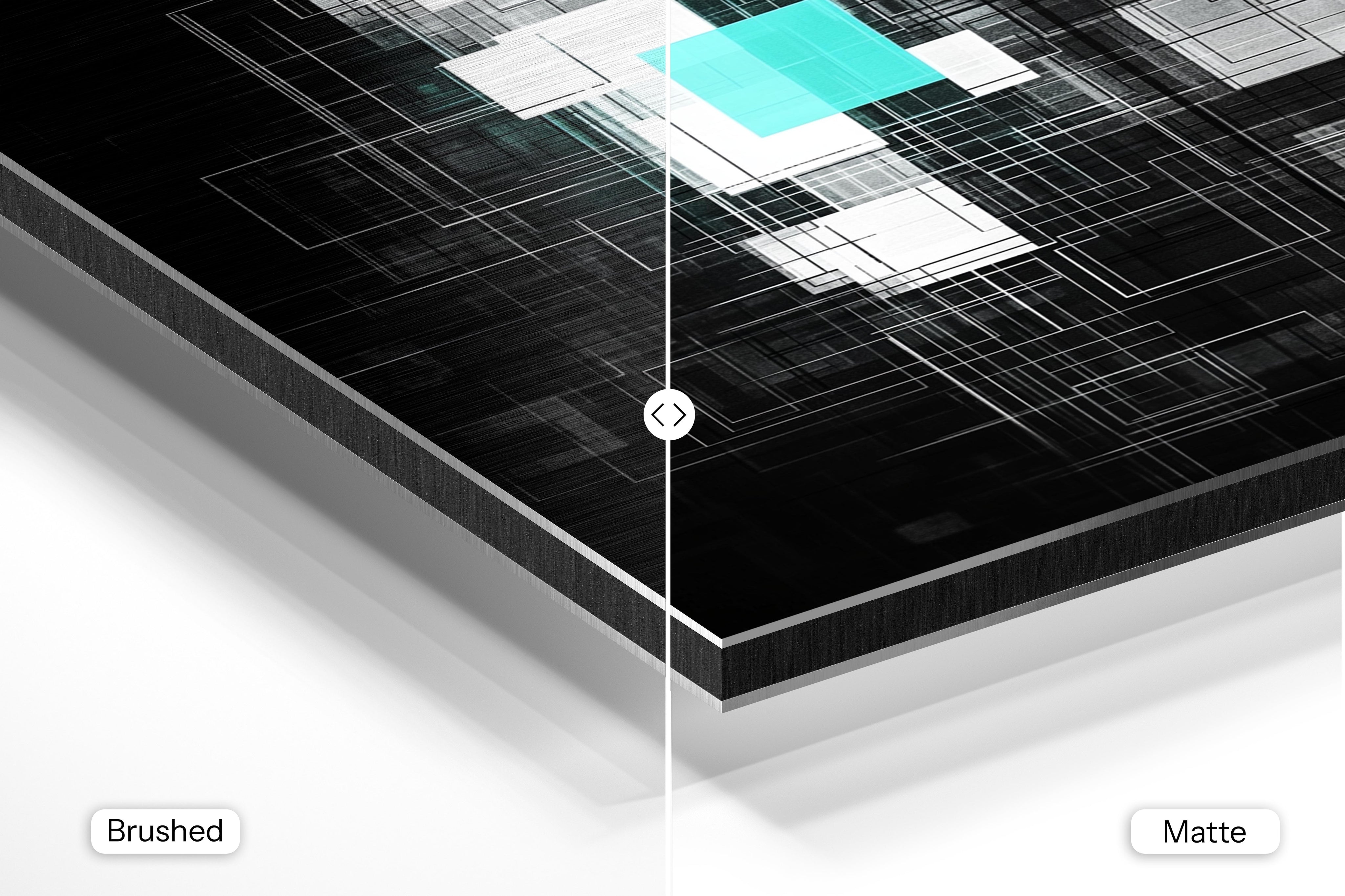 - Brushed Aluminum, on the other hand, features a raw metallic texture with visible brush strokes. Whites and highlights in your image let the silver surface show through, adding a dramatic, shimmering effect. Ideal for black-and-white images, minimalist designs, or abstract art, it creates a bold, industrial vibe with a modern edge.
