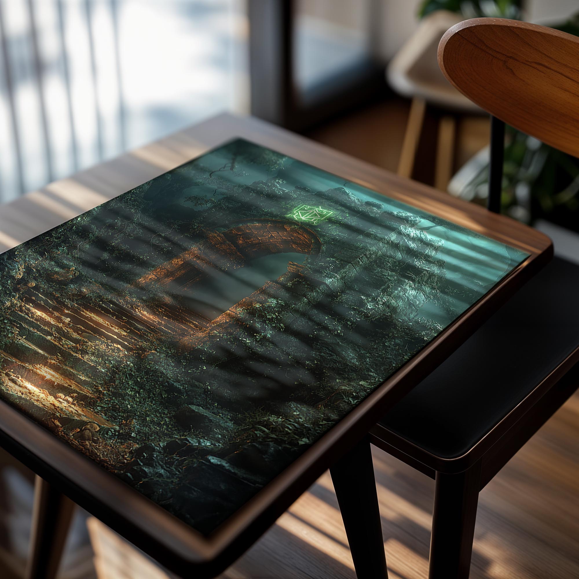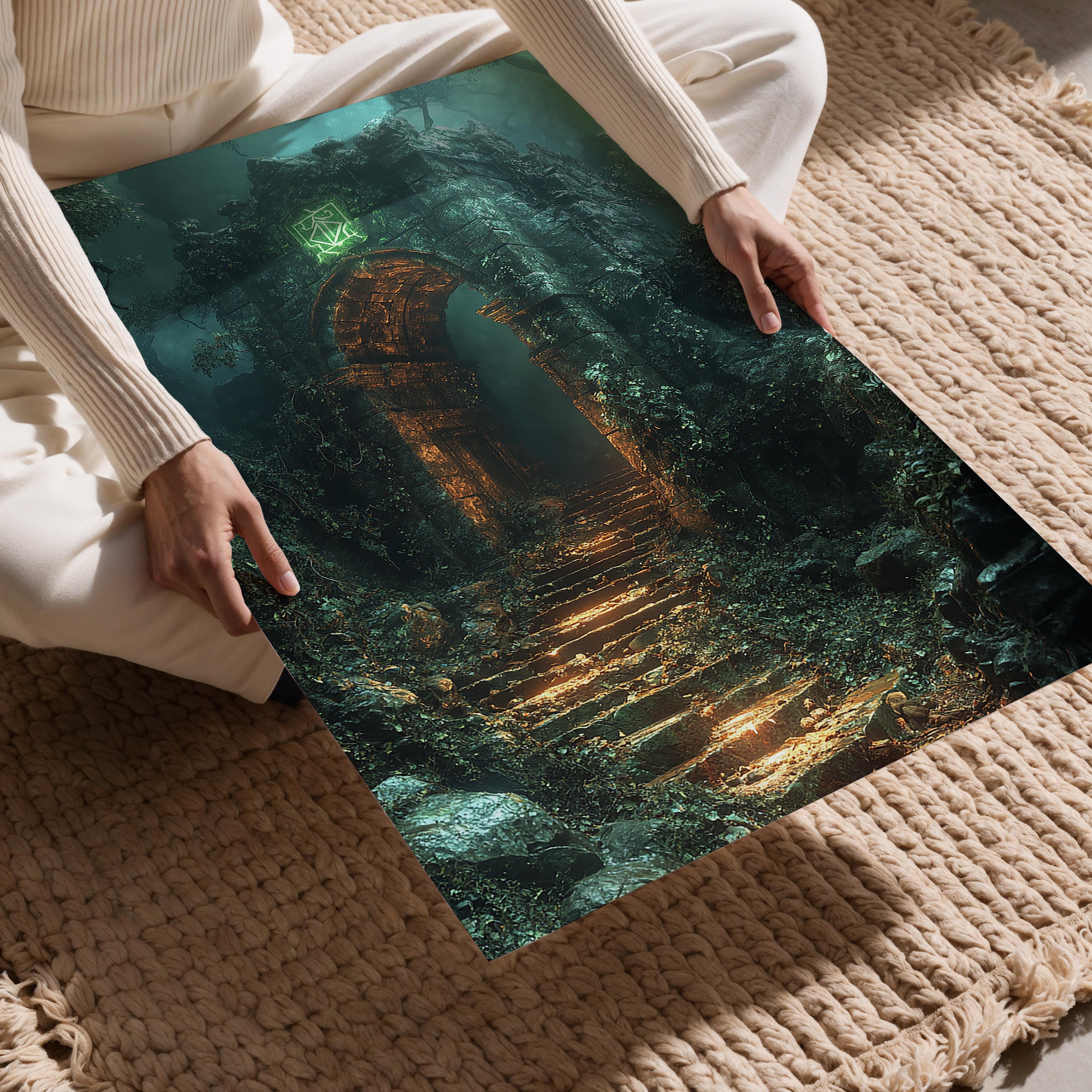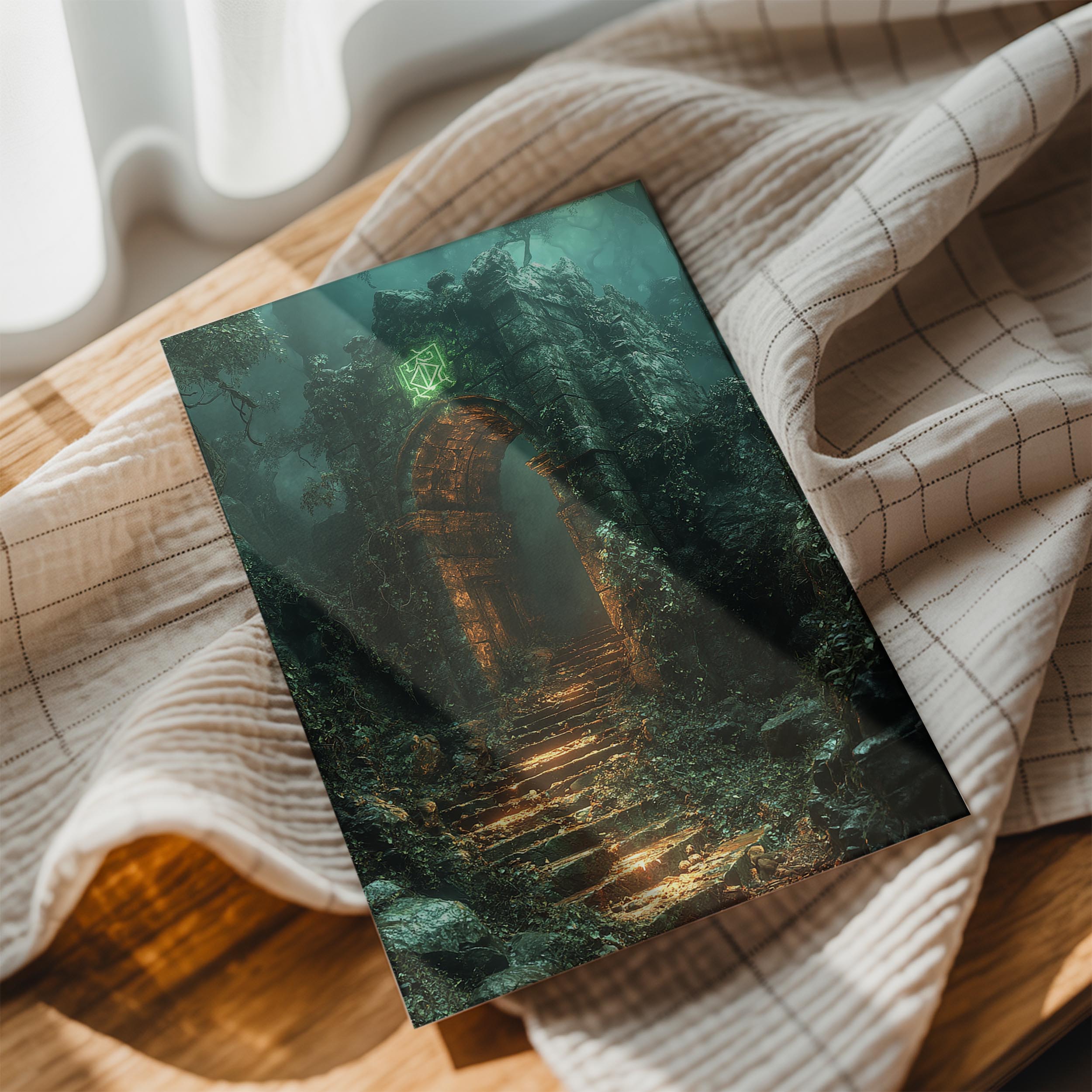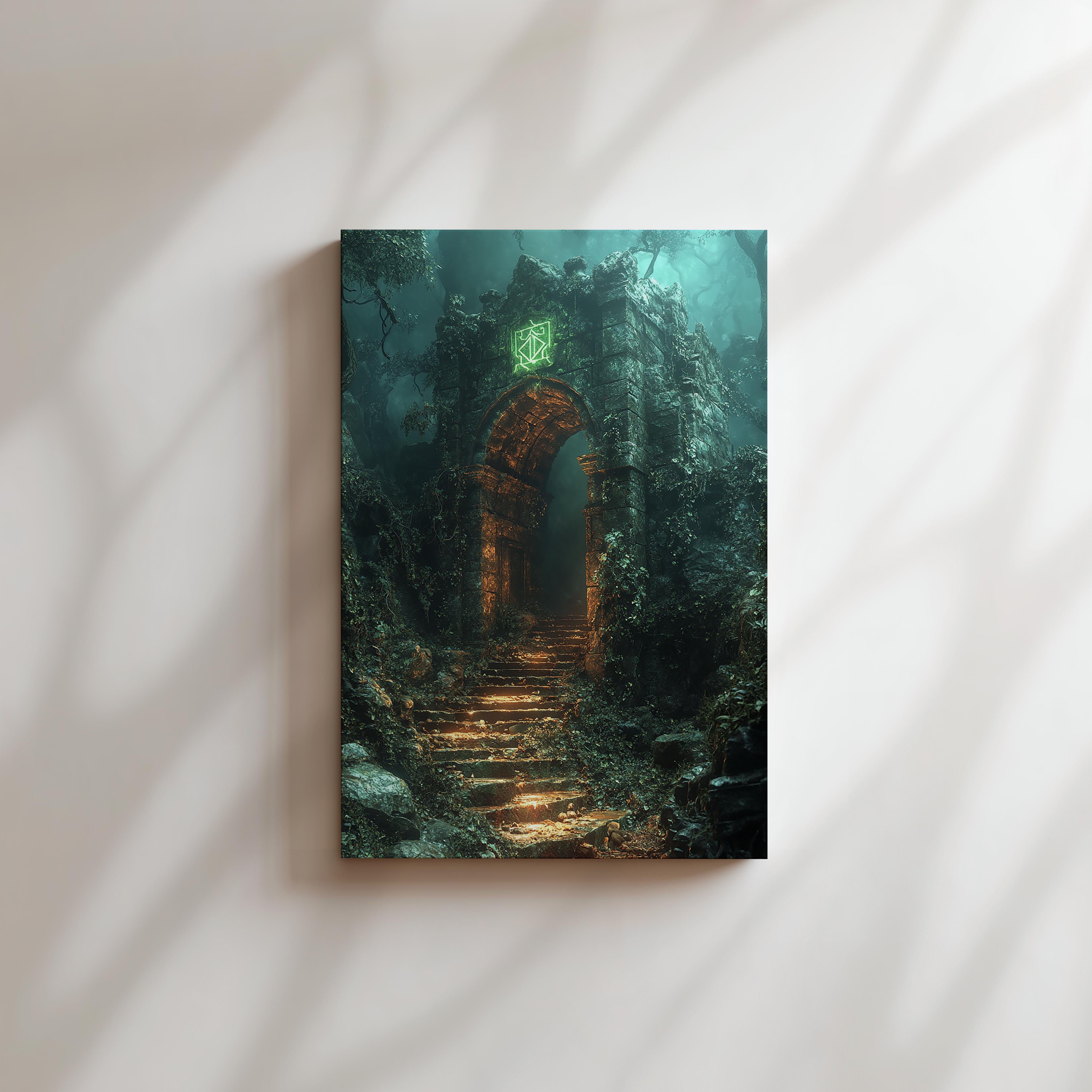 An ancient stone arch set amidst a lush forest, with glowing green runes illuminating the pathway. The soft lighting and natural elements combine to create a serene yet magical atmosphere. Ideal for fantasy lovers or those seeking to bring a touch of whimsy and nature into their space.