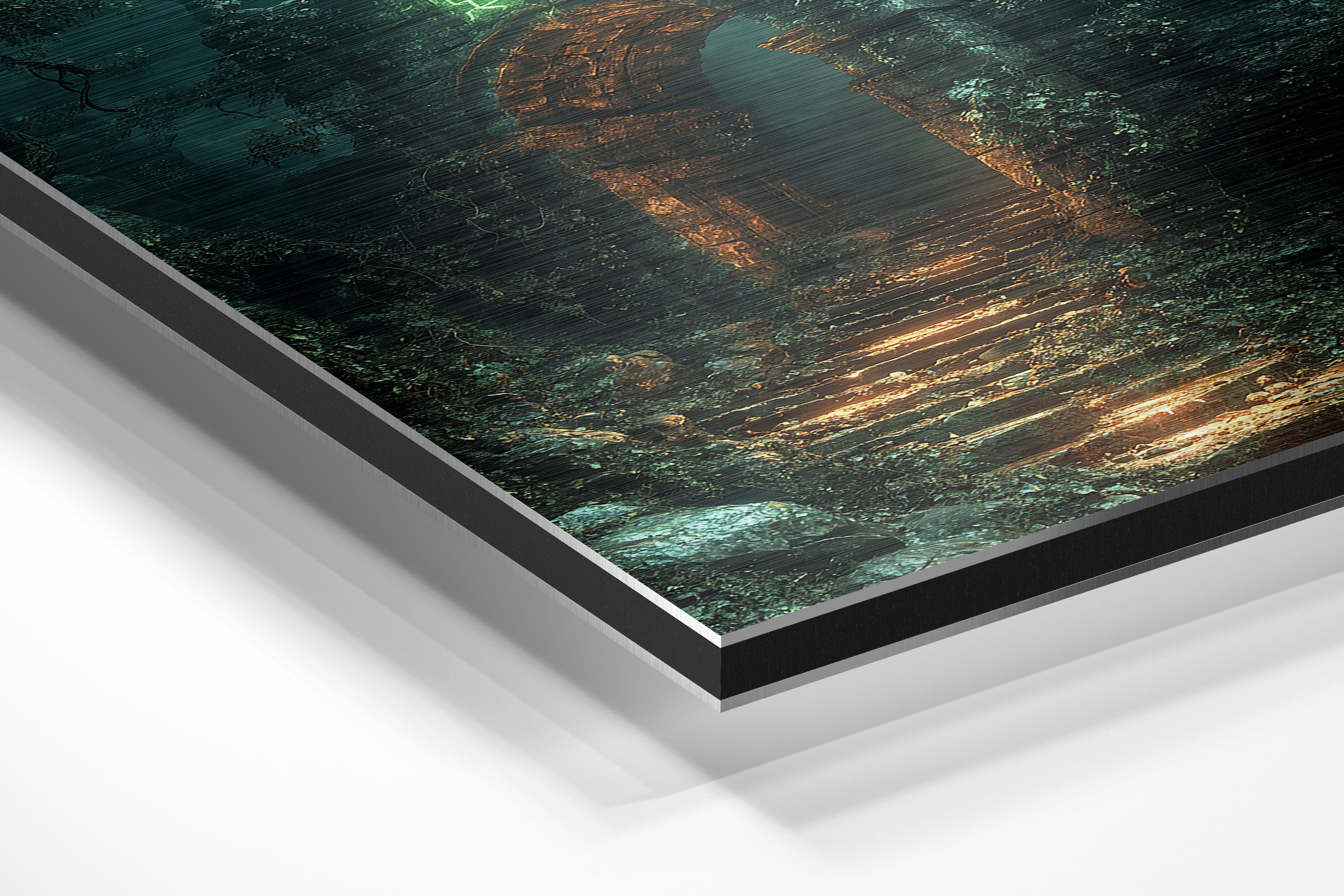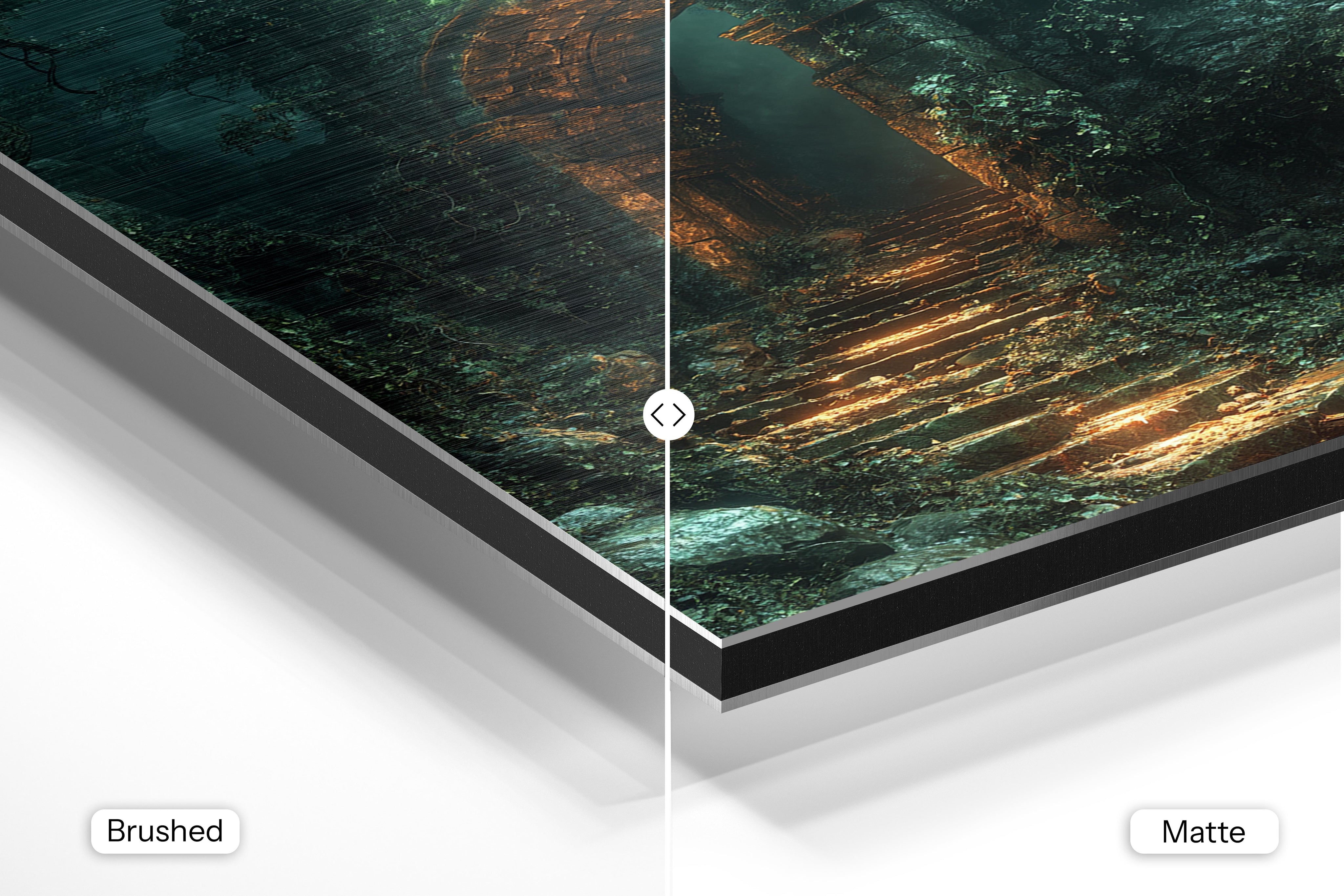 - Brushed Aluminum, on the other hand, features a raw metallic texture with visible brush strokes. Whites and highlights in your image let the silver surface show through, adding a dramatic, shimmering effect. Ideal for black-and-white images, minimalist designs, or abstract art, it creates a bold, industrial vibe with a modern edge.