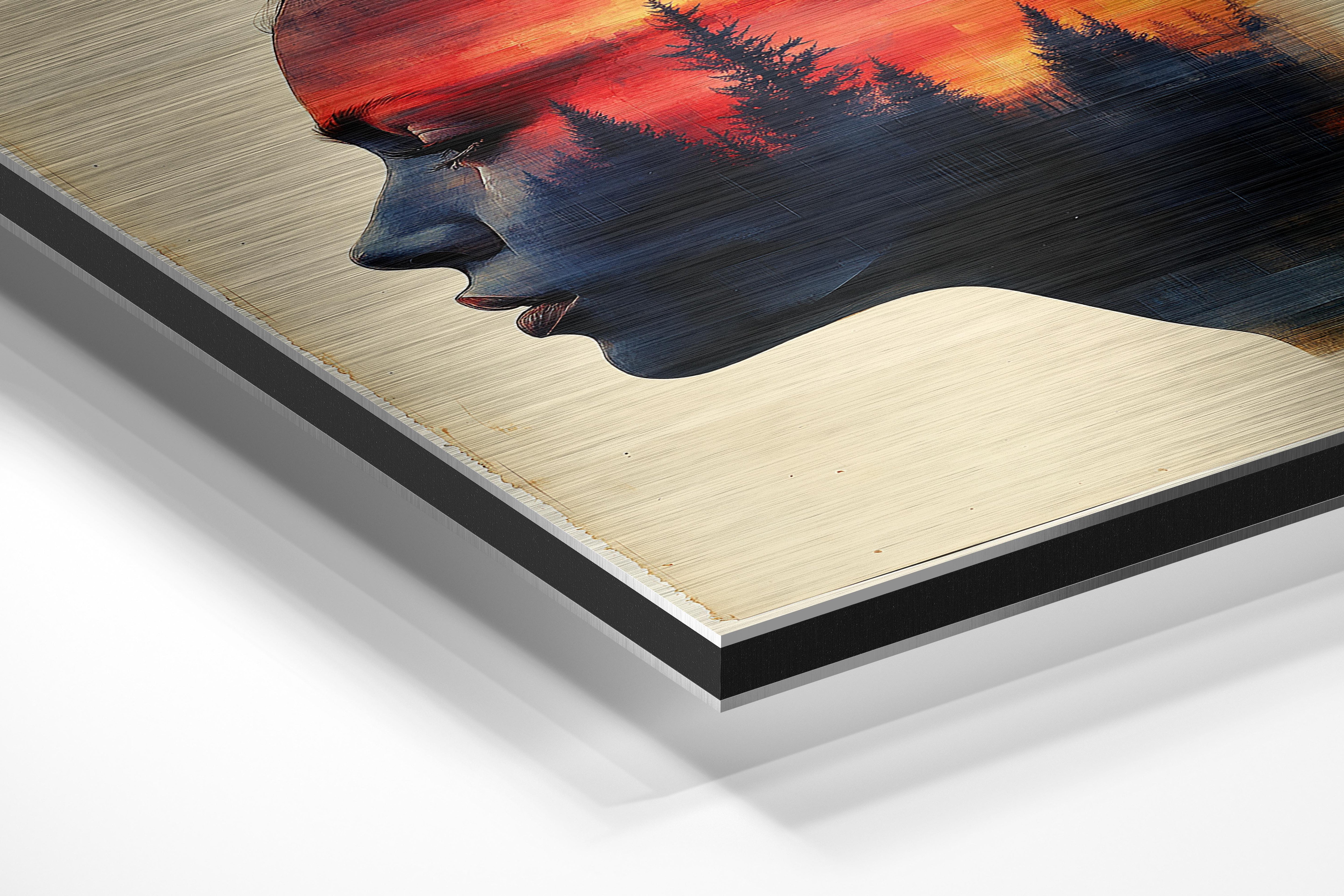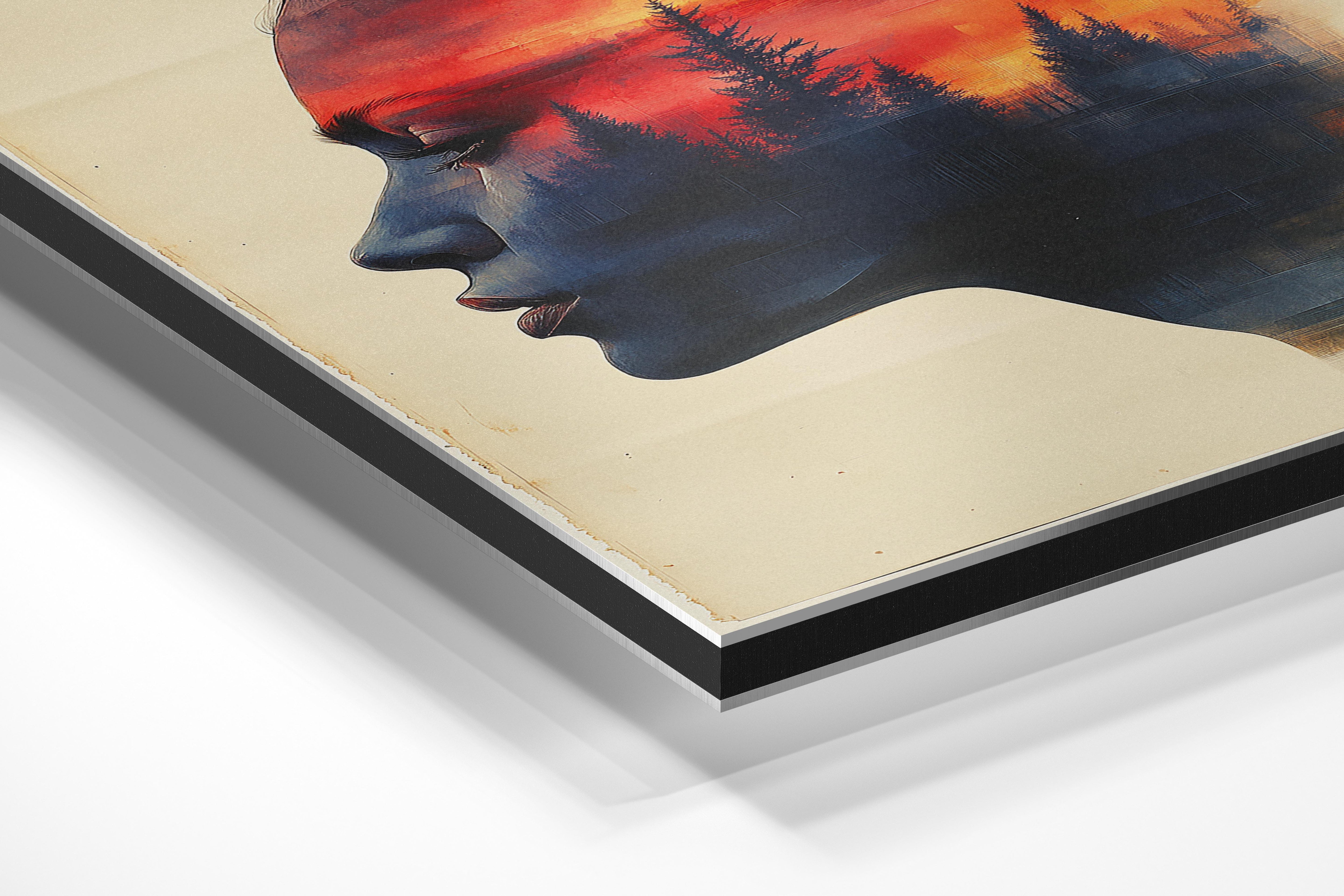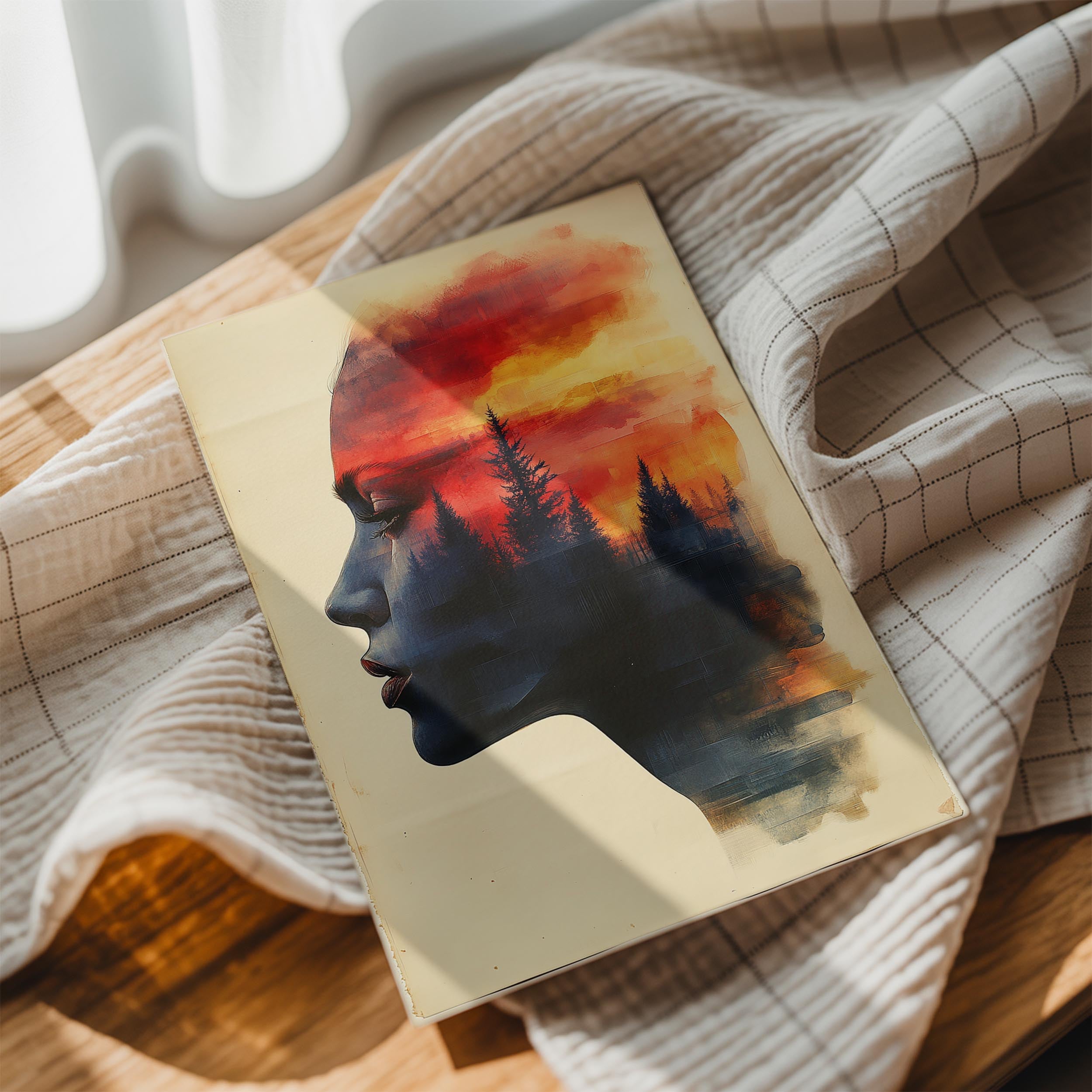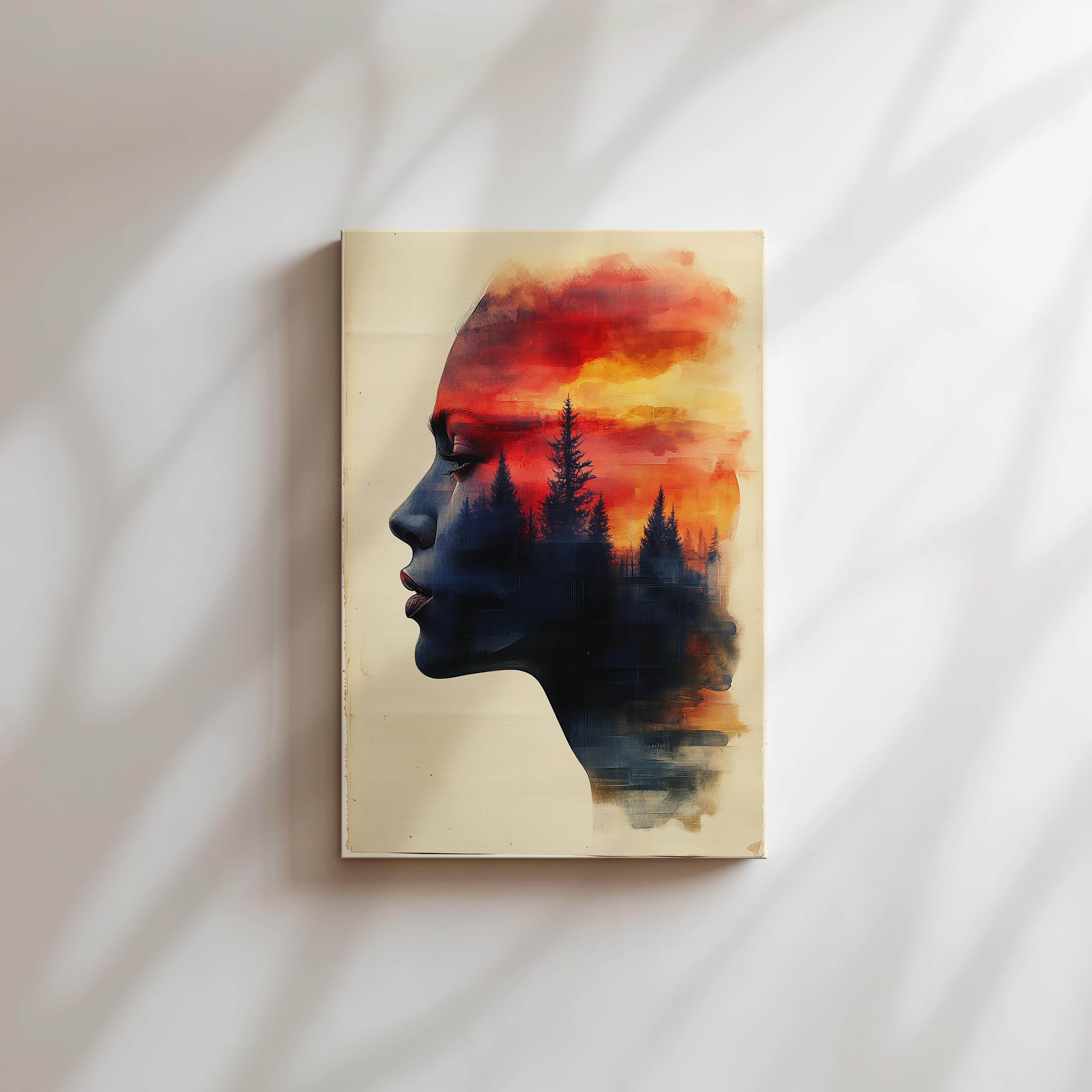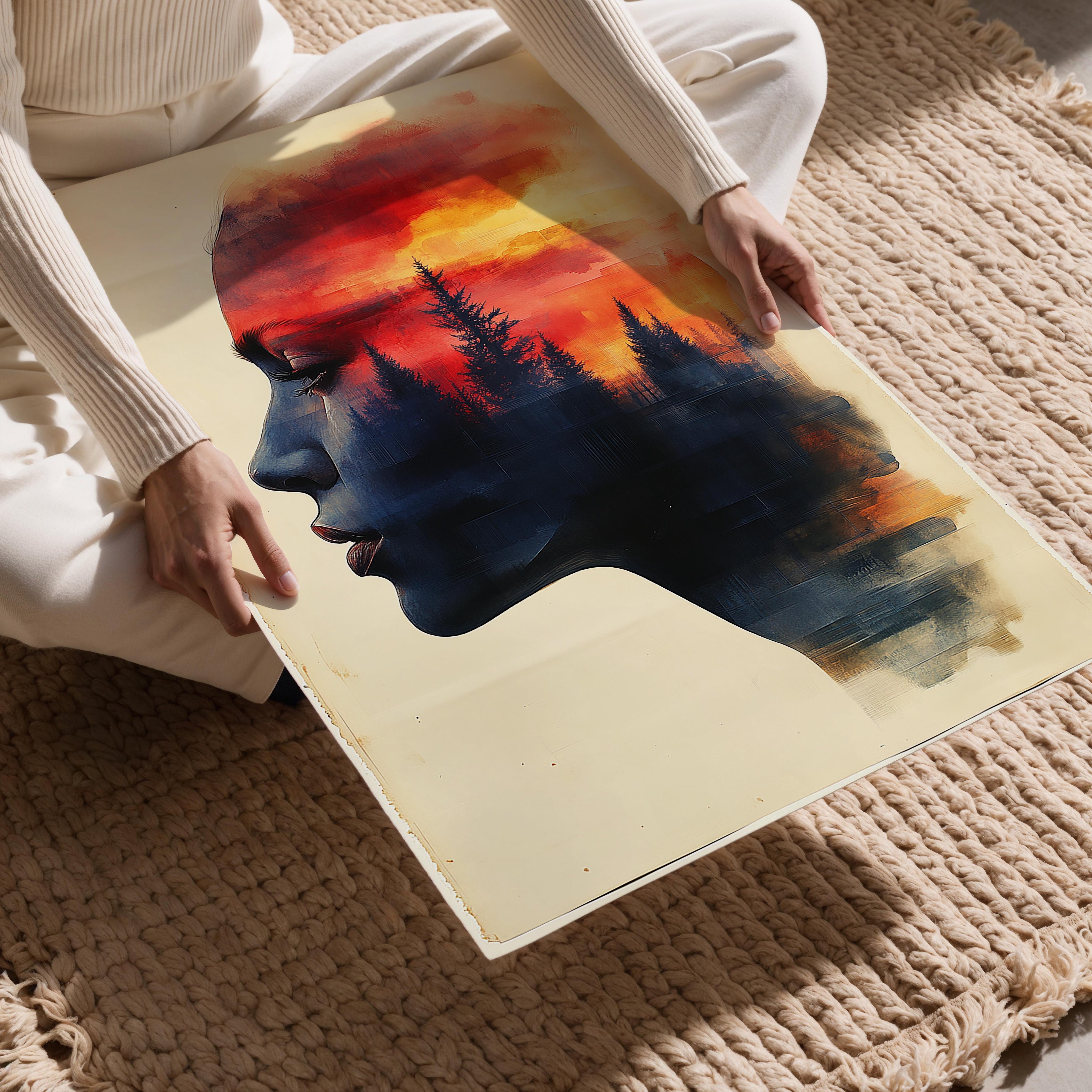 This image depicts a striking silhouette of a serene human profile blended seamlessly with a majestic forest, highlighted by a vivid sunset. The fiery hues of orange, red, and yellow contrast beautifully with the cool tones of the trees and the face, creating an ethereal and contemplative mood. Perfect for an interior design enthusiast seeking art that evokes introspection and awe, this piece would look magnificent in a living room or study. Its bold colors and thematic depth make it a conversation starter and a timeless centerpiece.
