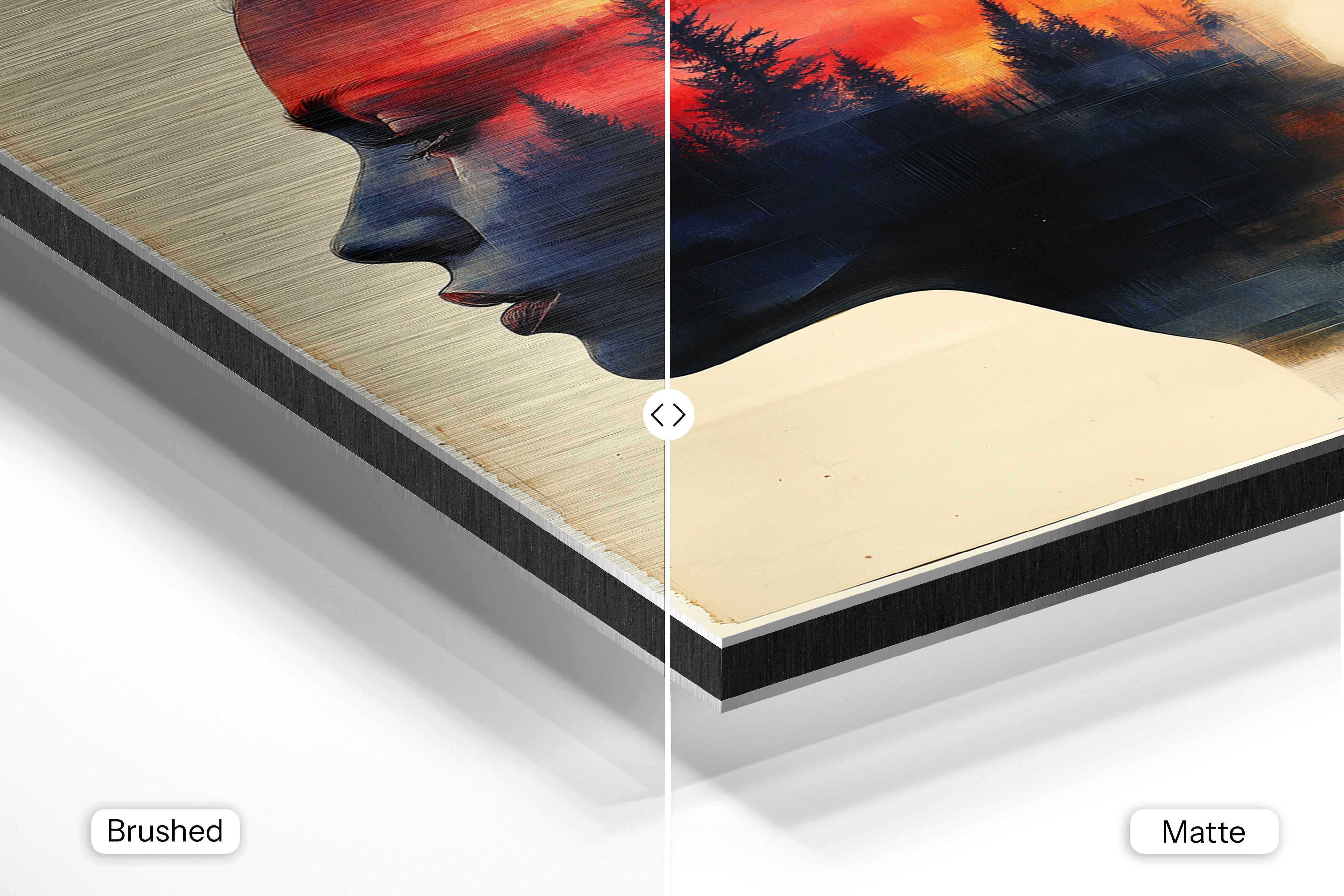- Brushed Aluminum, on the other hand, features a raw metallic texture with visible brush strokes. Whites and highlights in your image let the silver surface show through, adding a dramatic, shimmering effect. Ideal for black-and-white images, minimalist designs, or abstract art, it creates a bold, industrial vibe with a modern edge.