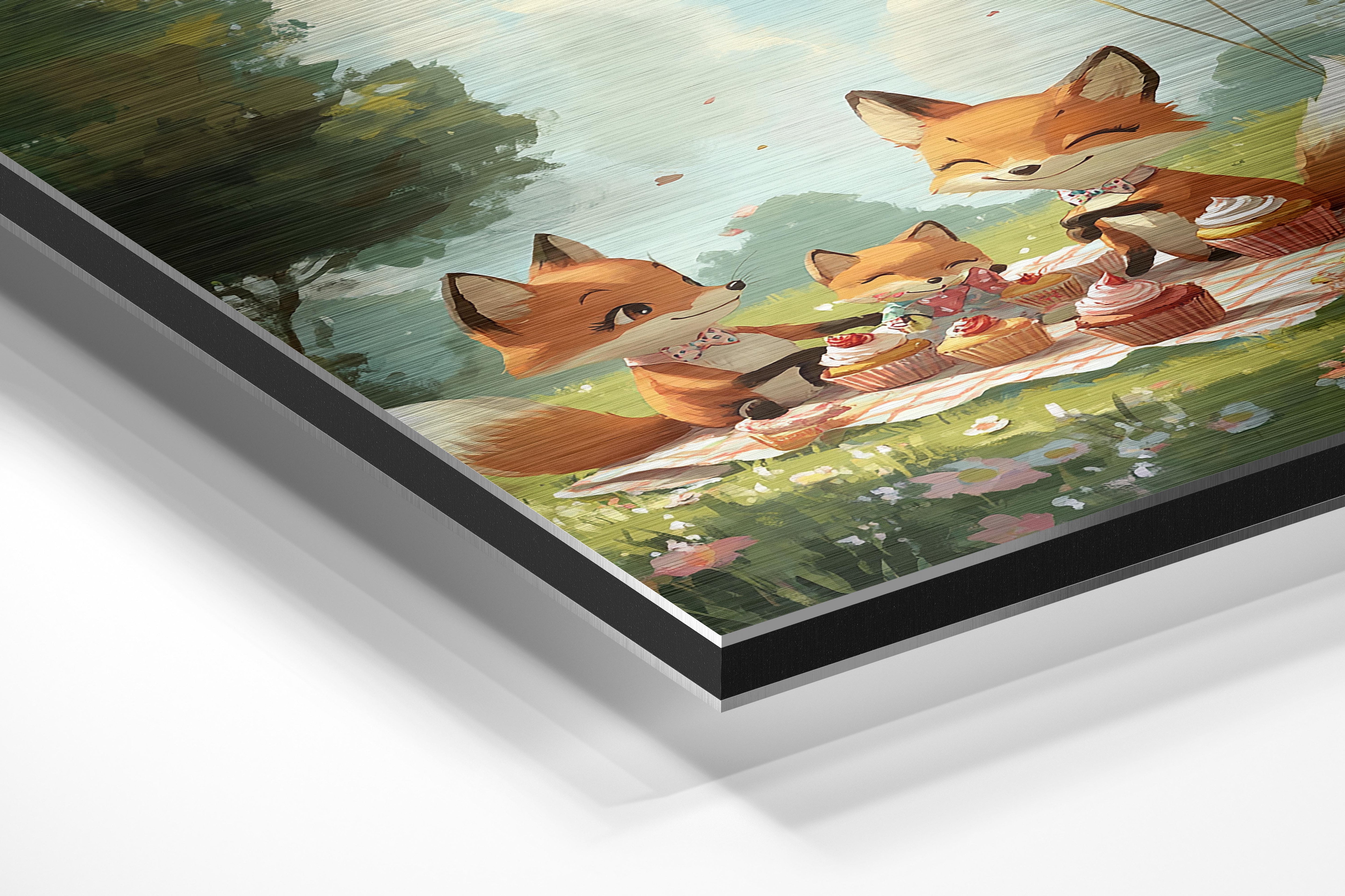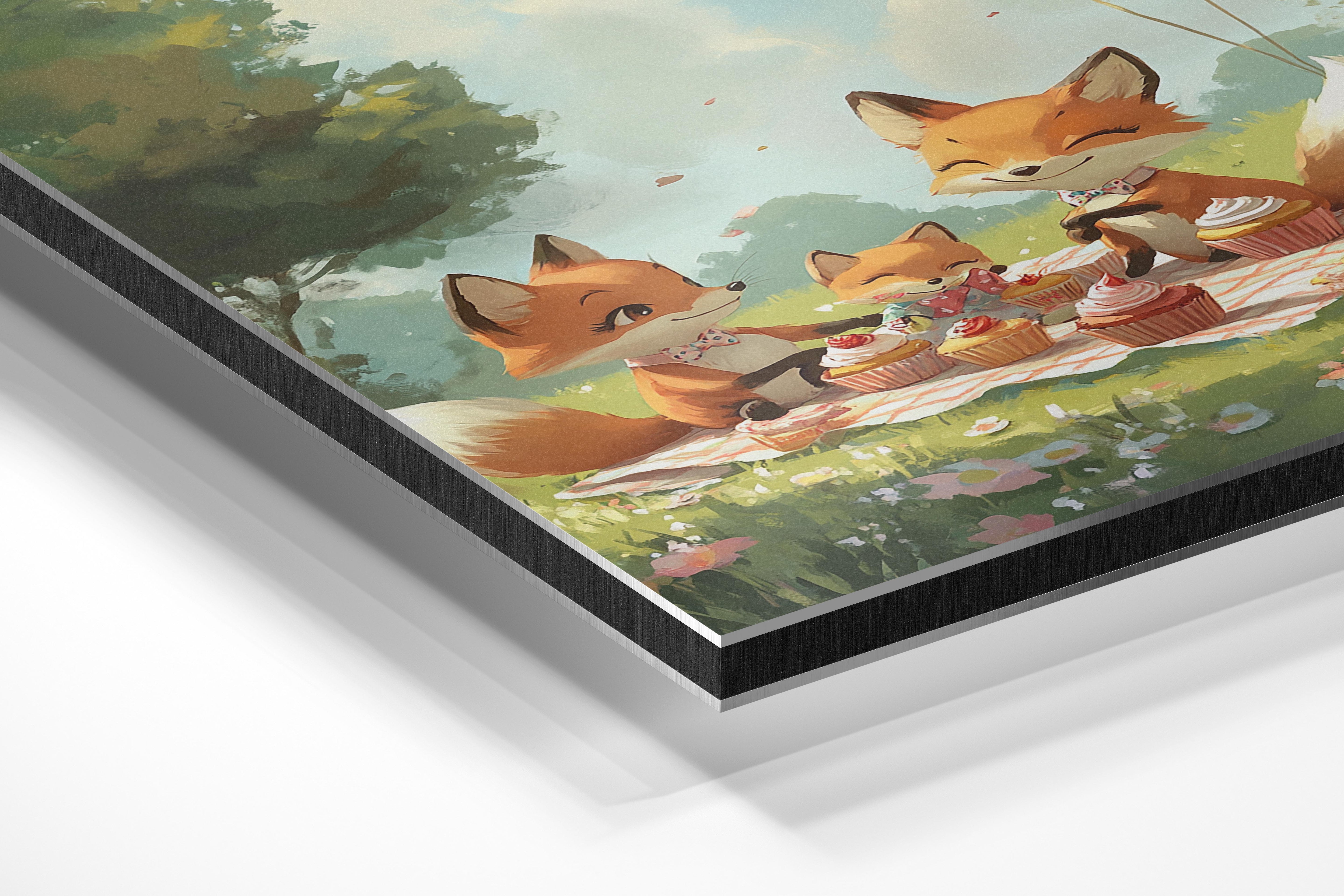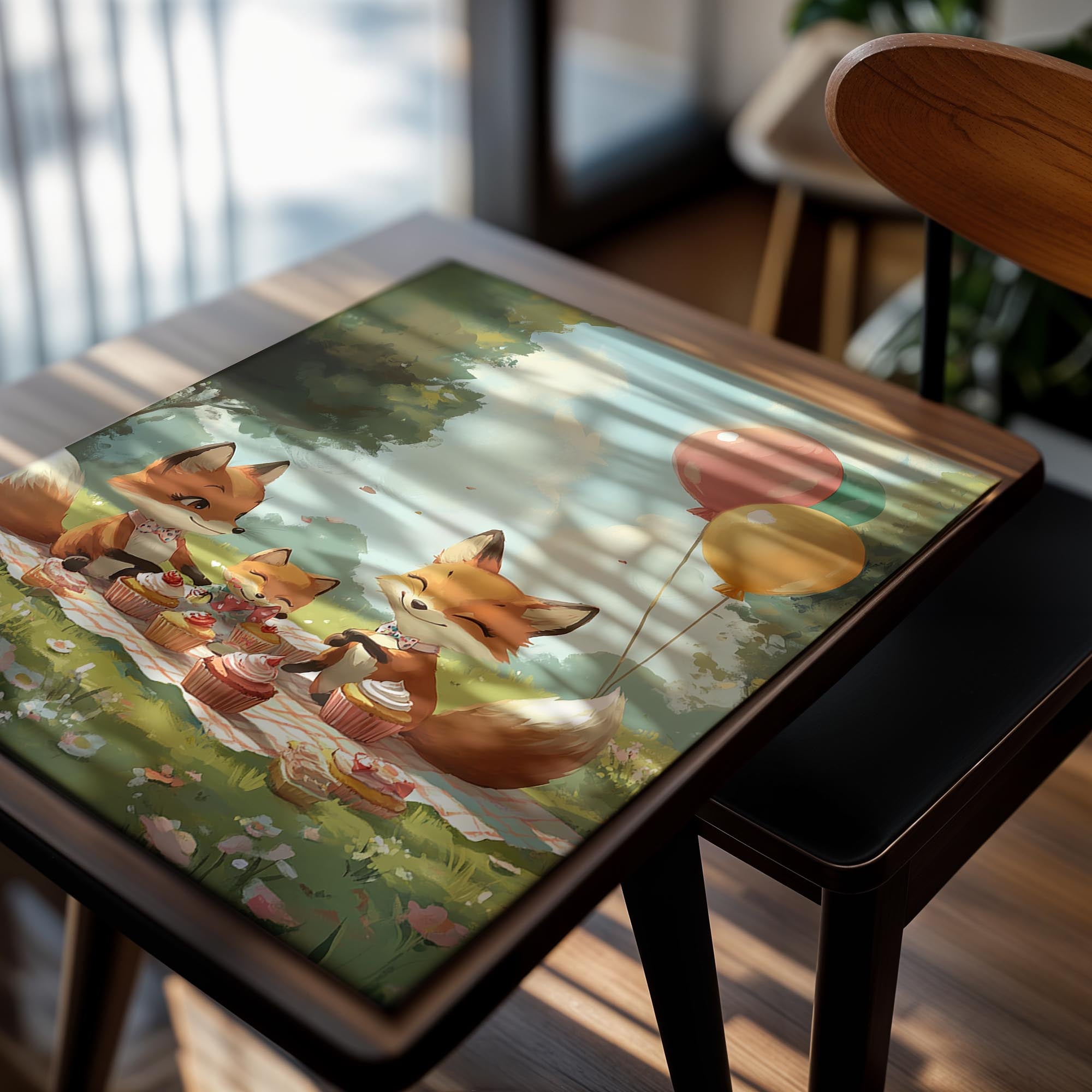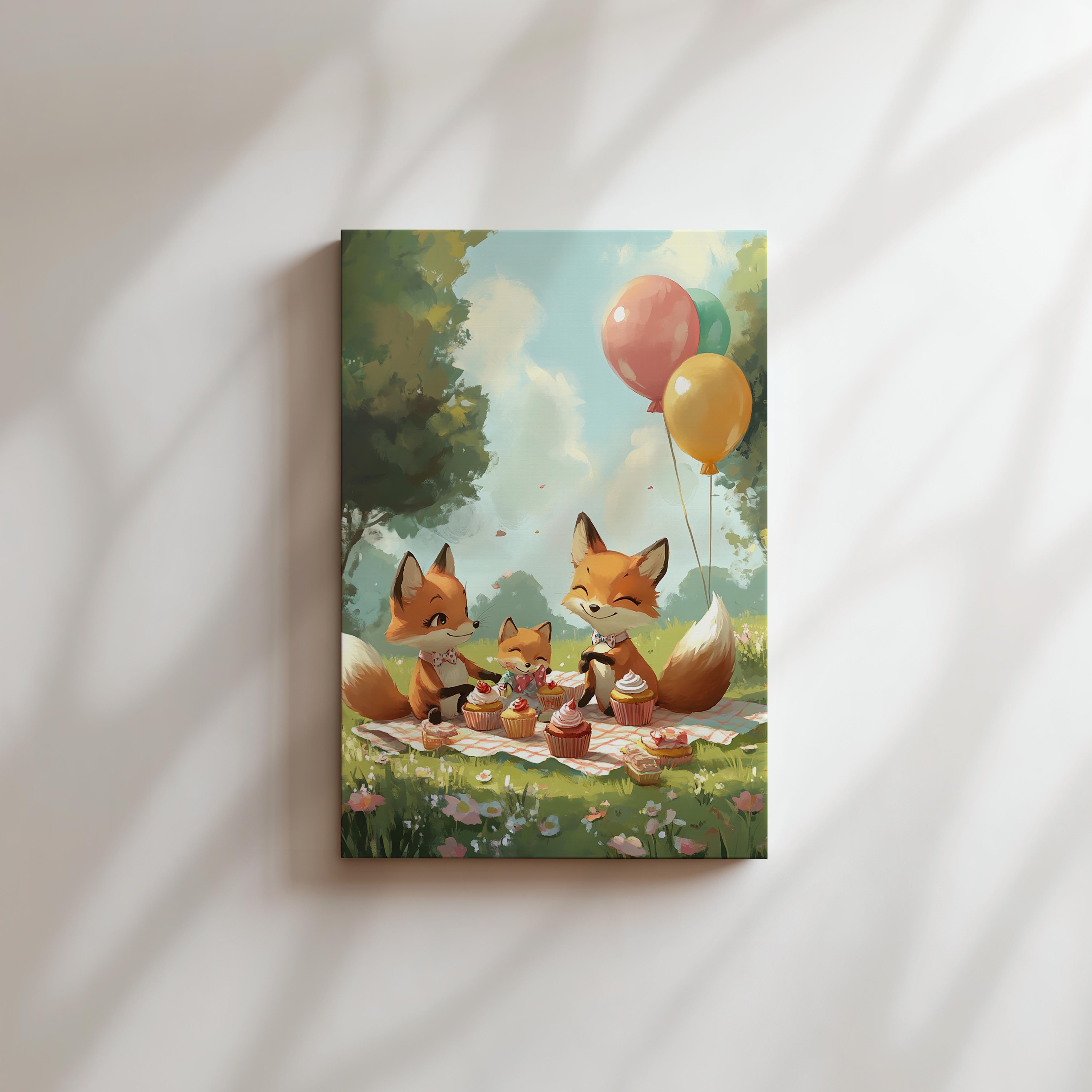 A charming and tender scene of a fox family enjoying a sunny picnic in a flower-filled meadow. The playful cubs, vibrant cupcakes, and cheerful balloons create an inviting atmosphere, perfect for family spaces or nurseries. The warm colors and lively details celebrate love, togetherness, and simple joys. This illustration exudes positivity, capturing the essence of a sunny day outdoors. Its universal appeal makes it a heartwarming gift or a delightful addition to a cozy home. Each element reflects care and artistry, making it an unforgettable piece.