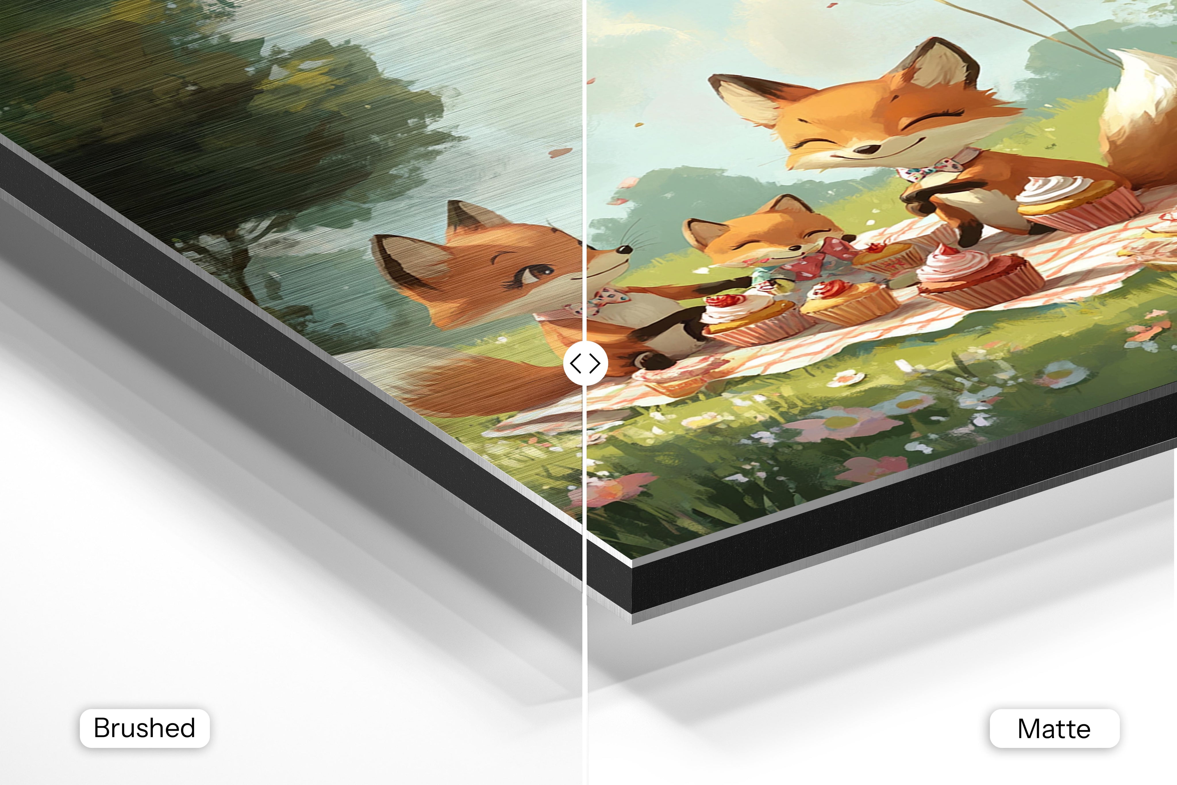 - Matte Aluminum offers a smooth, bright white surface that delivers crisp details and vibrant, true-to-life colors. With its non-reflective finish and subtle silky sheen, it’s perfect for photography, portraits, and colorful artwork—bringing a clean, polished look to any interior.