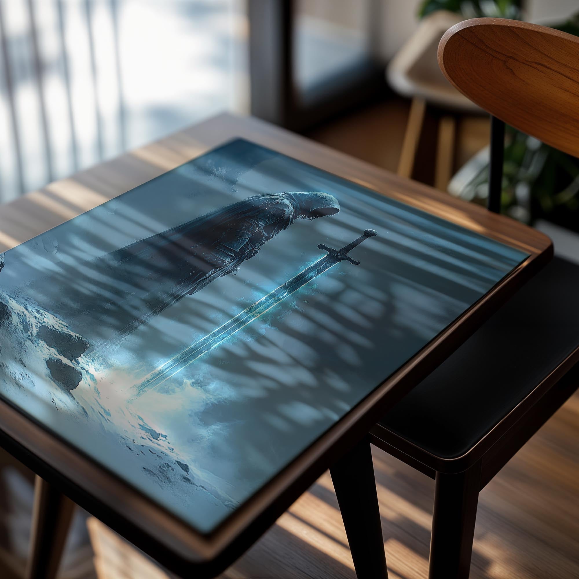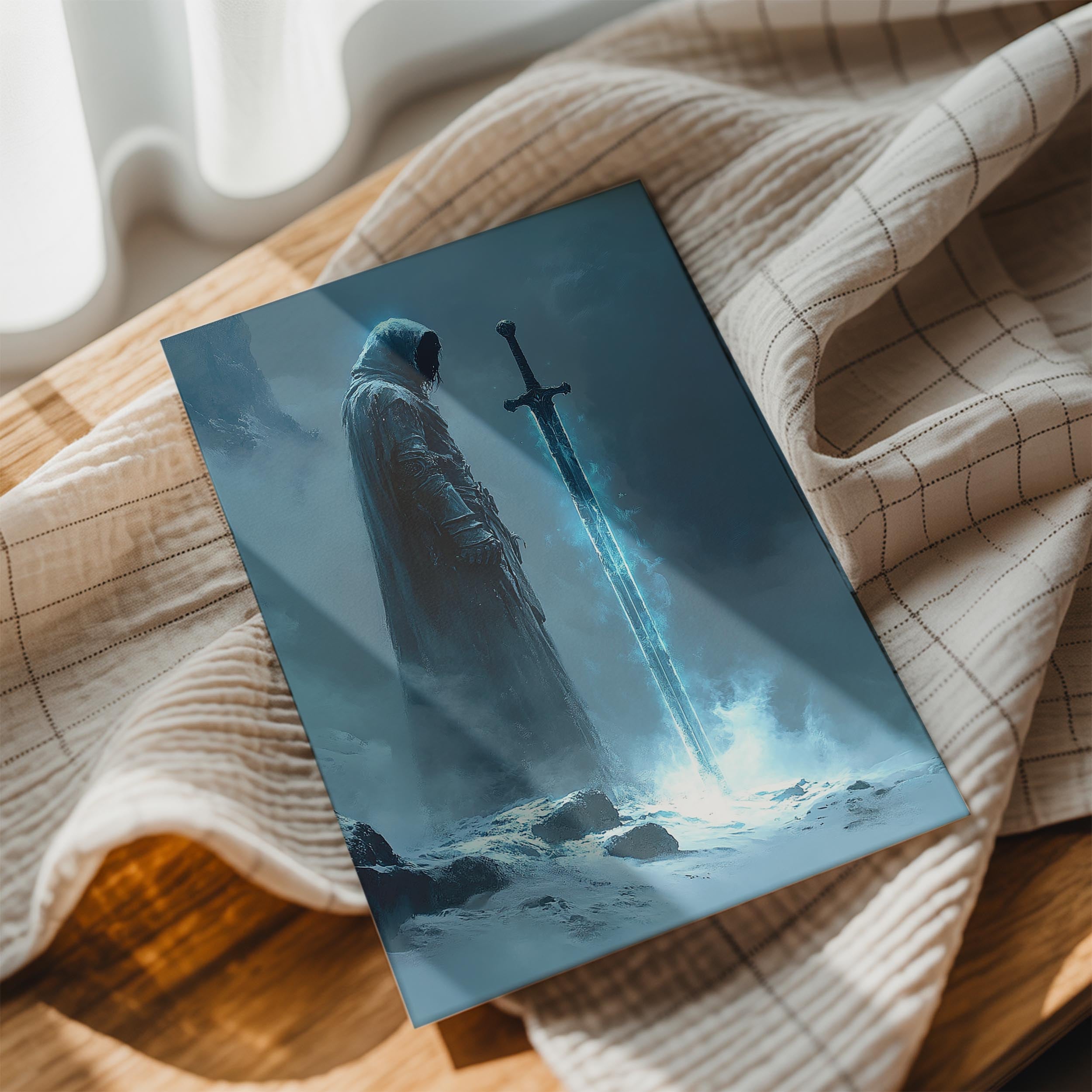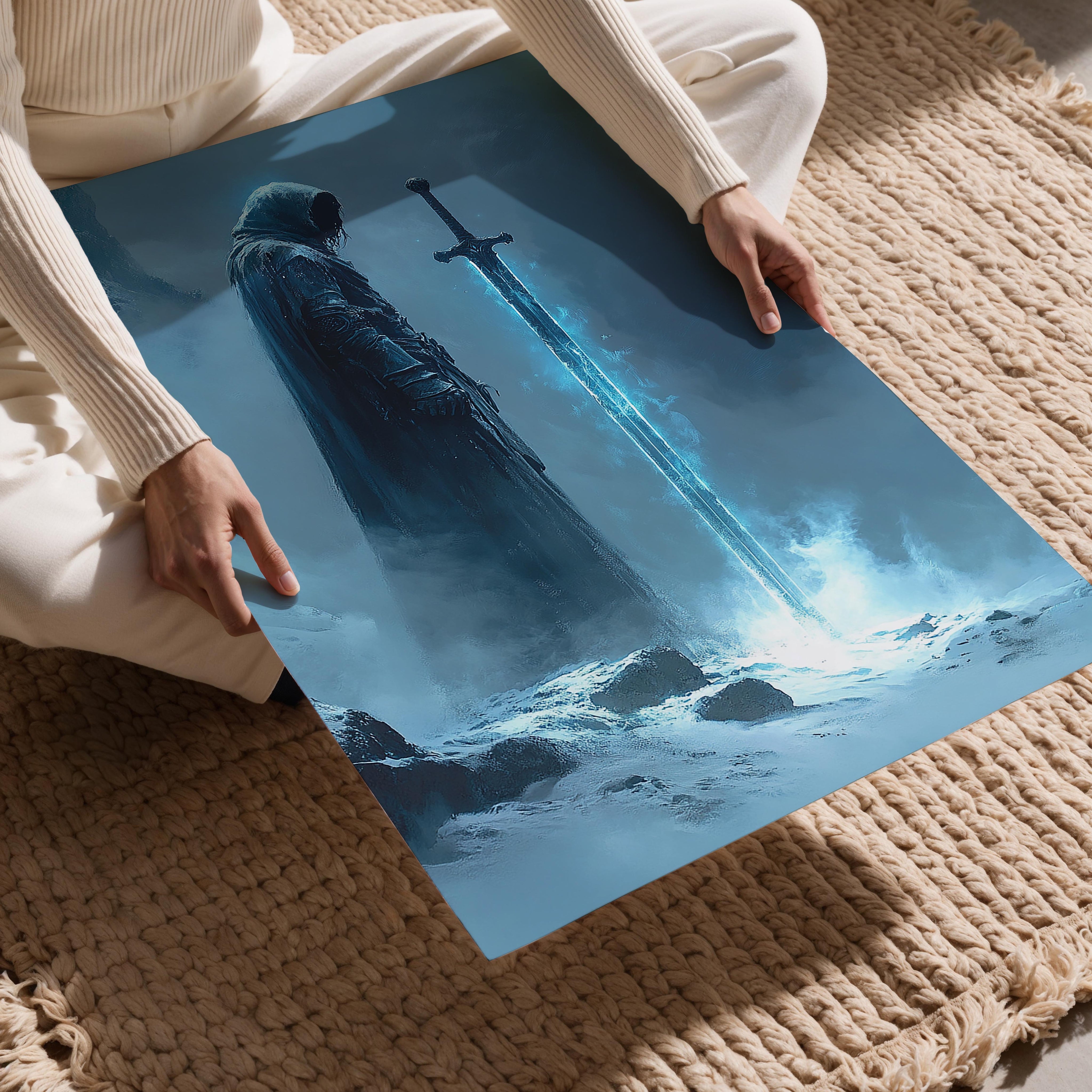 A frosty sword glowing with an ethereal blue aura, its wielder cloaked in mystery amidst a snowy, fog-laden landscape. The striking icy glow contrasts beautifully with the subdued cold tones of the surroundings. This piece is ideal for fans of fantasy and adventure, symbolizing strength and perseverance. Its stark and dramatic composition makes it a standout addition to a modern interior, especially in a gaming or storytelling space, sparking thoughts of legendary quests.