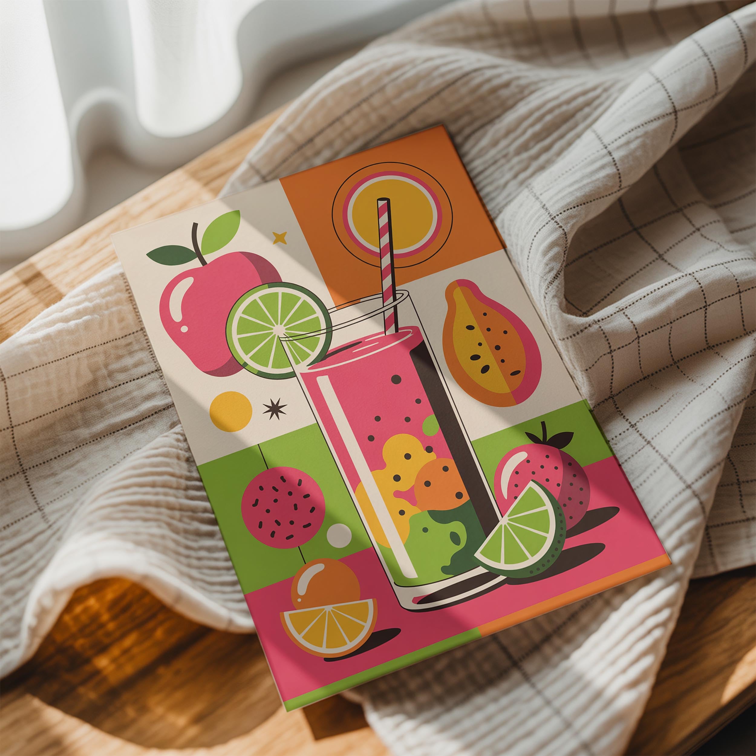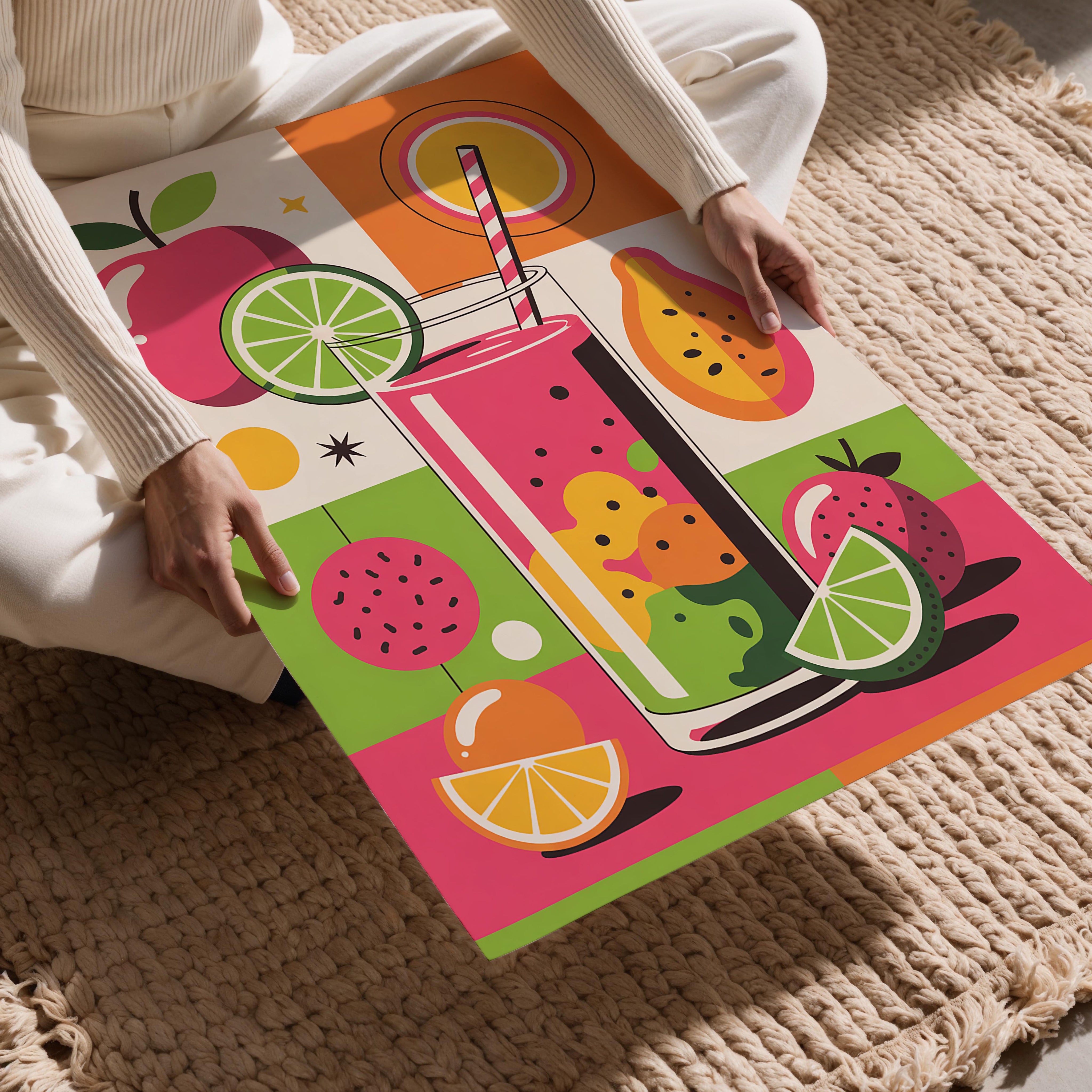 This playful and vibrant illustration showcases a refreshing drink brimming with colorful fruit elements like lime, orange, papaya, apple, and strawberry. Surrounded by cheerful geometric patterns in shades of green, orange, pink, and cream, the composition evokes a feeling of vitality and freshness. The central glass with a striped straw and visible fruit chunks is both inviting and lively. Ideal for kitchens, cafés, juice bars, or wellness spaces, this piece injects positive energy into any room while celebrating the joy of fruit and refreshment. It’s bold, retro, and highly decorative.