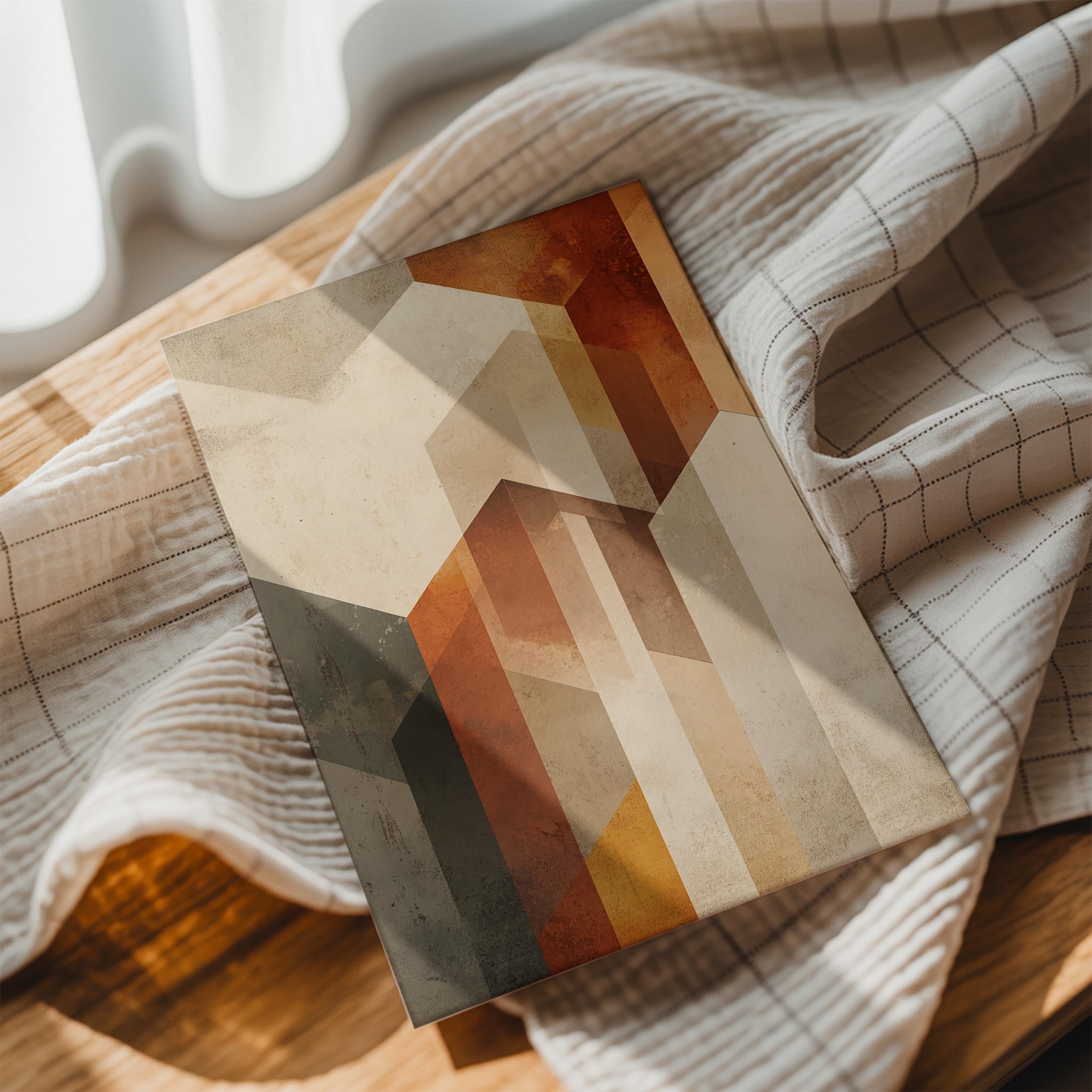 This abstract design features overlapping geometric shapes in warm earth tones like orange, beige, and gray. The interplay of translucent layers and sharp edges creates depth and harmony. Perfect for modern or boho-inspired spaces, this artwork complements neutral interiors while adding a bold statement. Its architectural feel makes it suitable for office spaces or creative studios. The blend of warm and muted tones provides a calming yet visually intriguing experience, making it an excellent choice for art enthusiasts.
