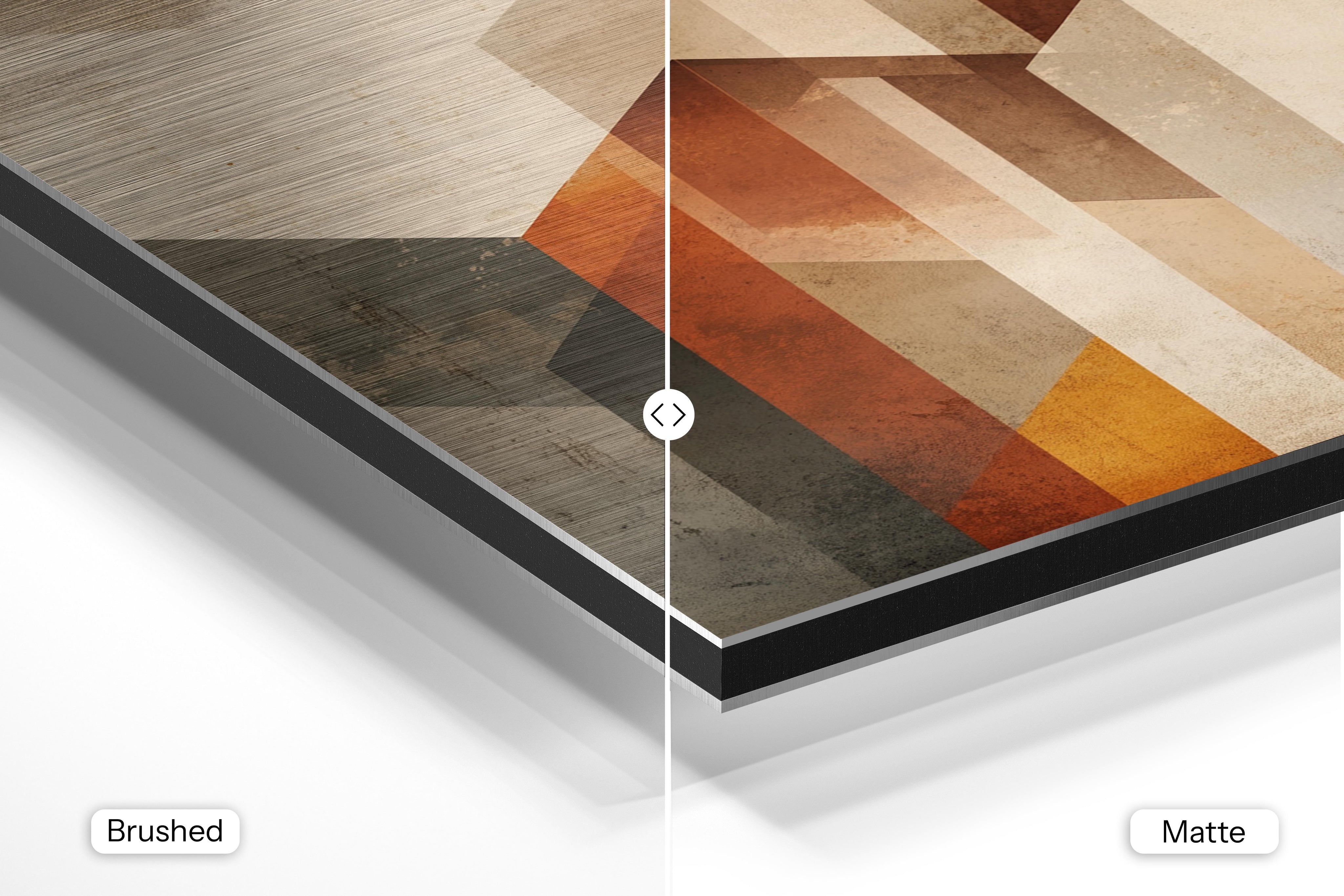 - Brushed Aluminum, on the other hand, features a raw metallic texture with visible brush strokes. Whites and highlights in your image let the silver surface show through, adding a dramatic, shimmering effect. Ideal for black-and-white images, minimalist designs, or abstract art, it creates a bold, industrial vibe with a modern edge.