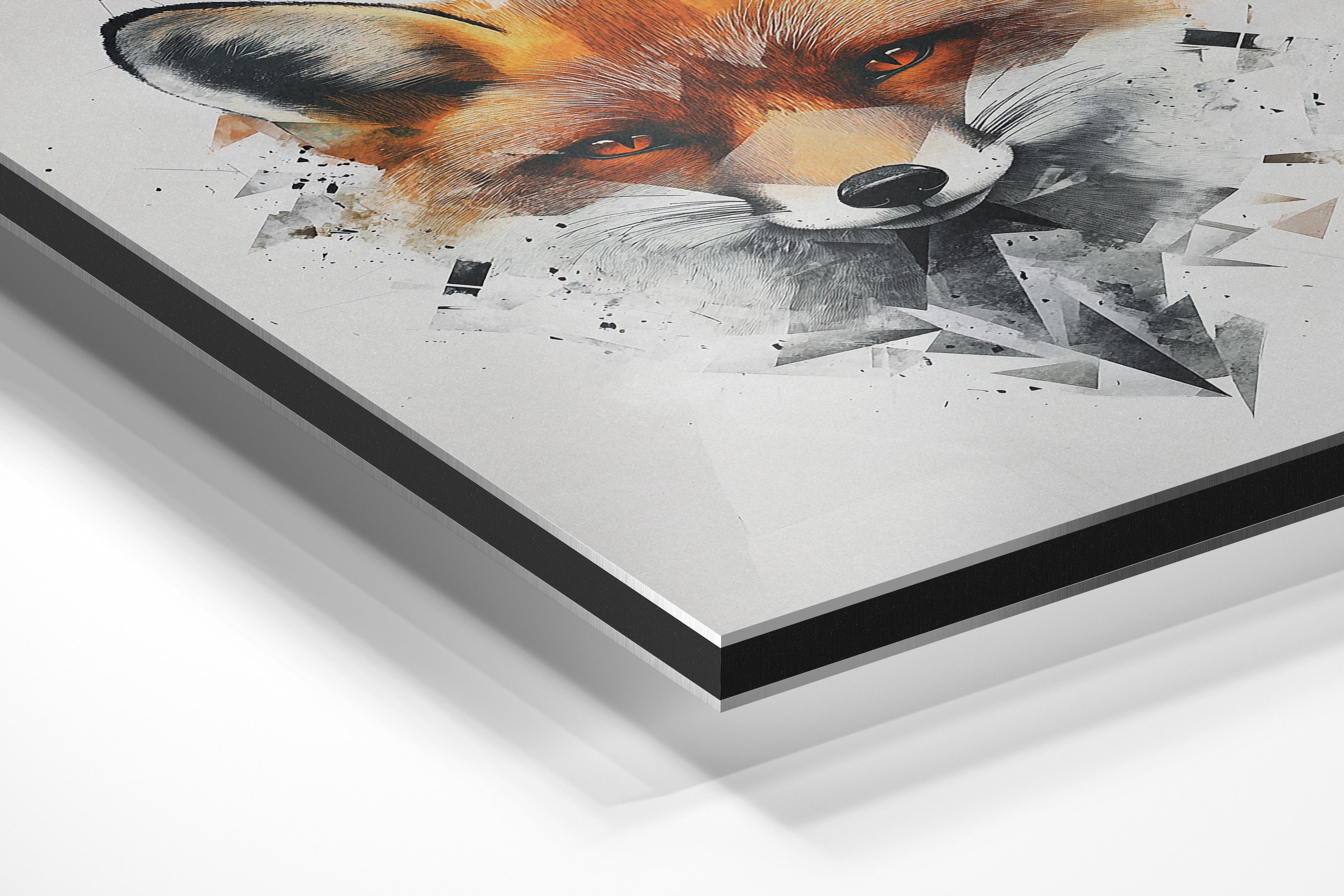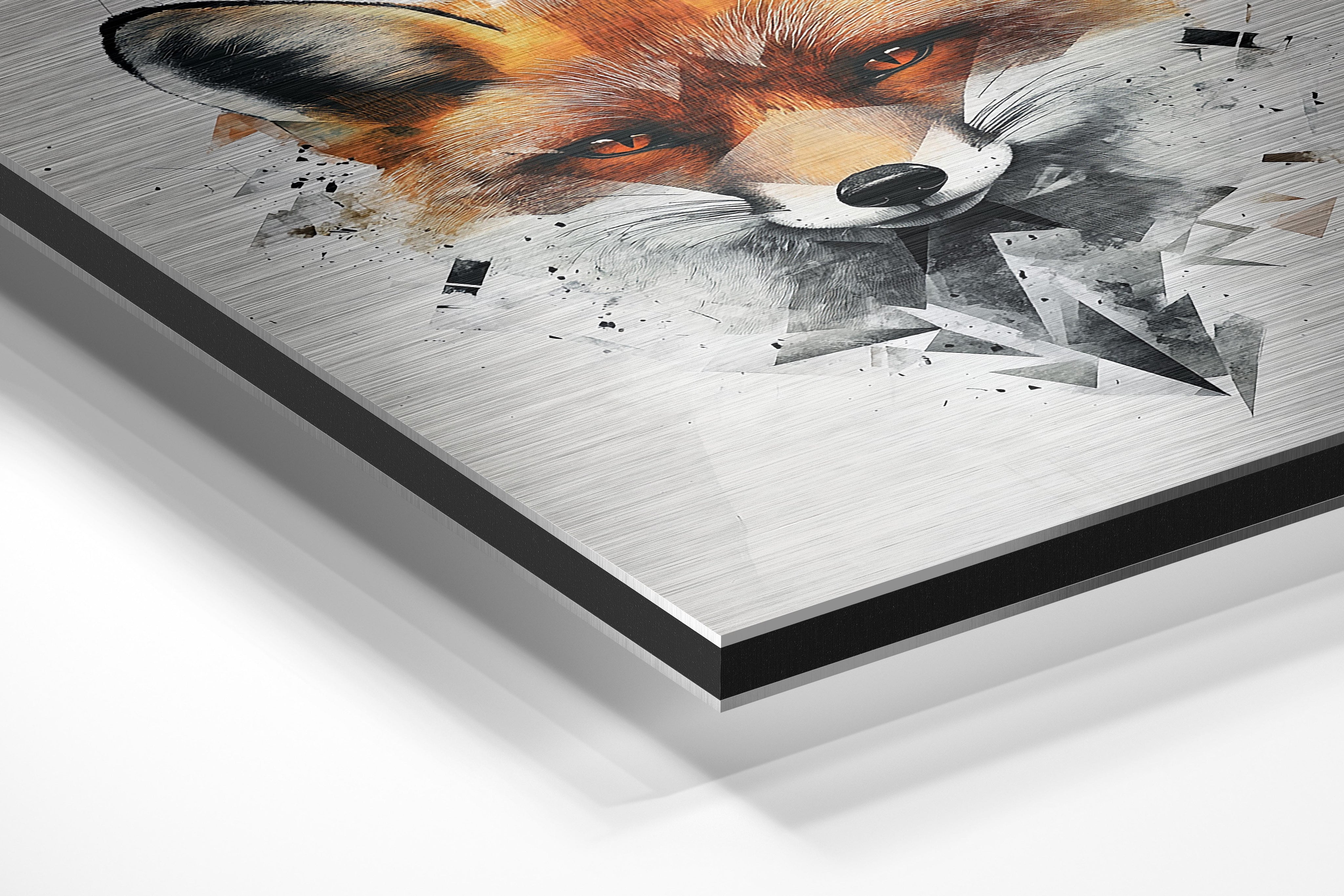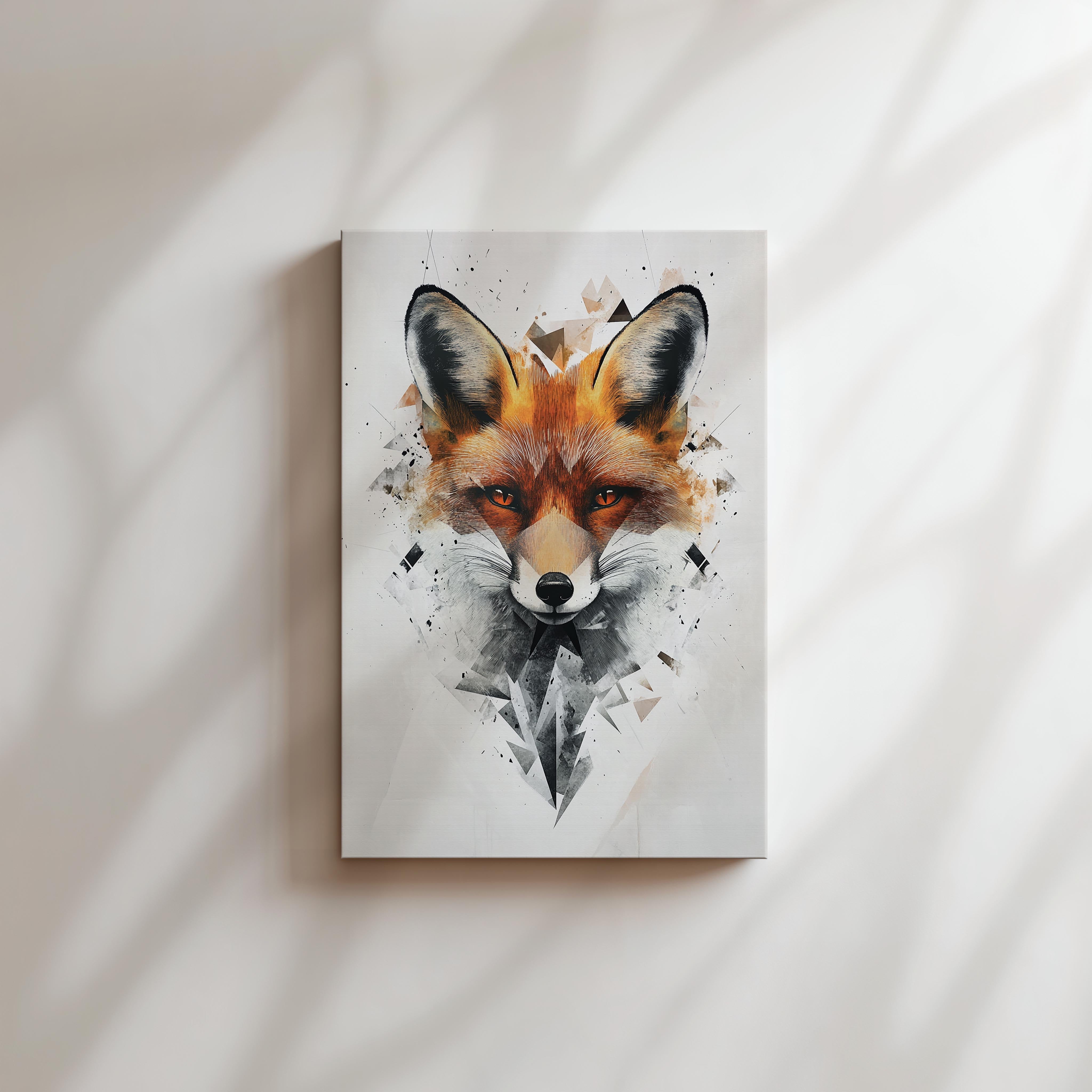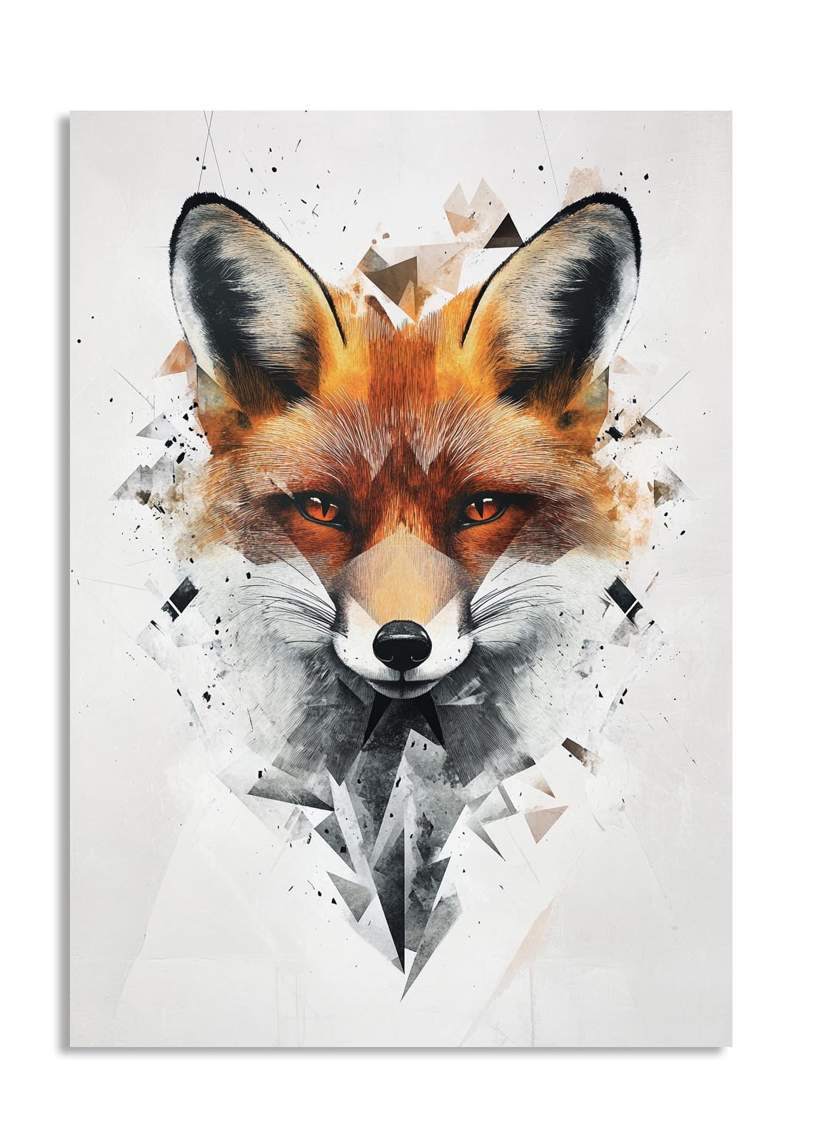 This modern, abstract fox portrait uses sharp geometric shapes combined with realistic fur textures to create a unique, eye-catching composition. The bold orange hues of the fox contrast beautifully against the white and gray angular background, making it a dynamic piece that blends contemporary design with wildlife appreciation. Ideal for modern interiors, creative studios, or nature lovers looking for a bold and innovative art piece to adorn their walls.