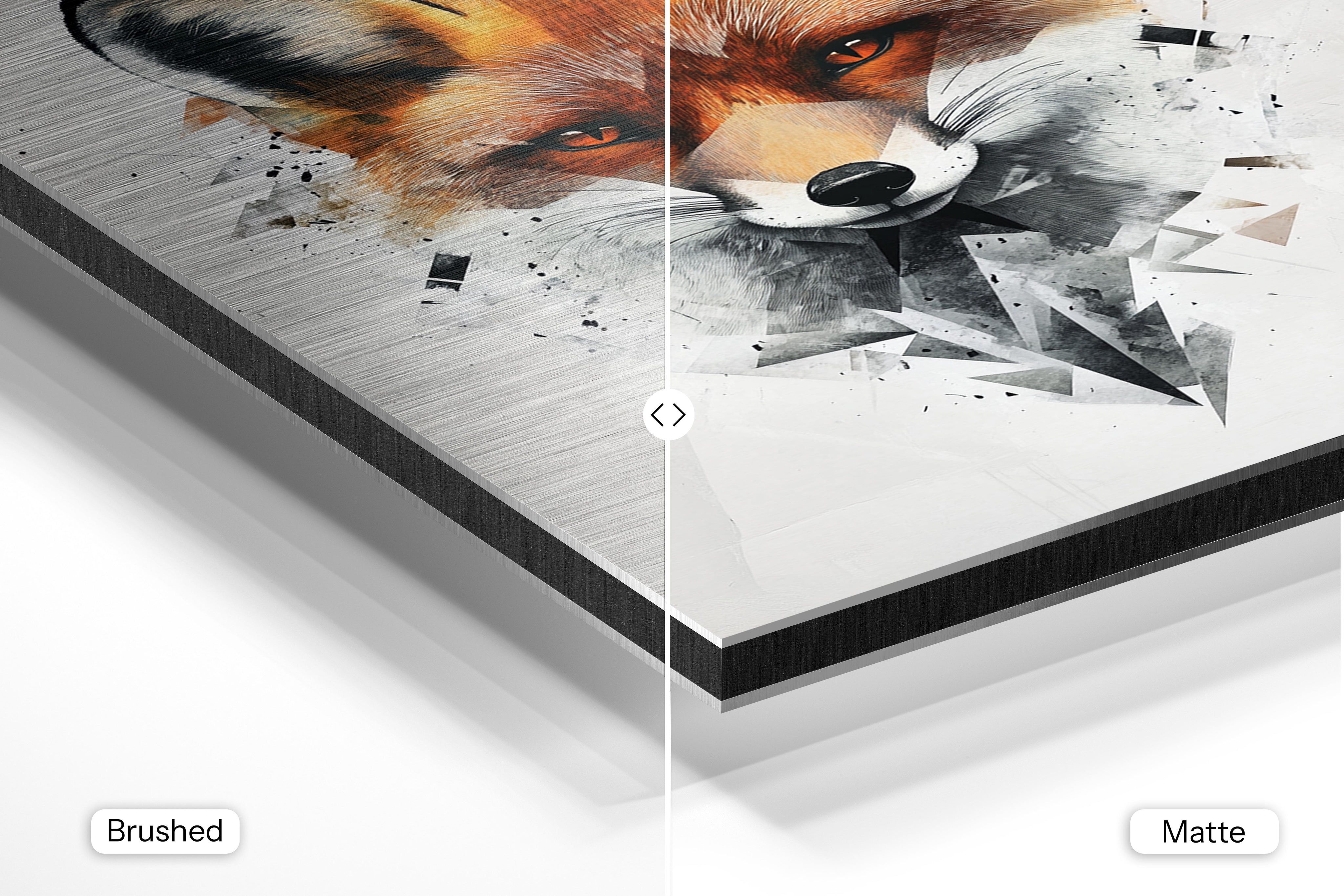 - Brushed Aluminum, on the other hand, features a raw metallic texture with visible brush strokes. Whites and highlights in your image let the silver surface show through, adding a dramatic, shimmering effect. Ideal for black-and-white images, minimalist designs, or abstract art, it creates a bold, industrial vibe with a modern edge.